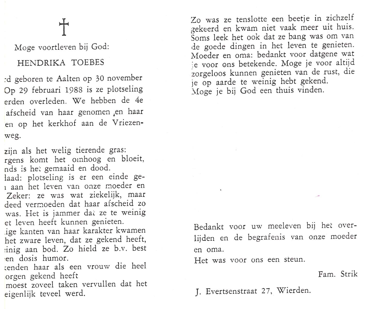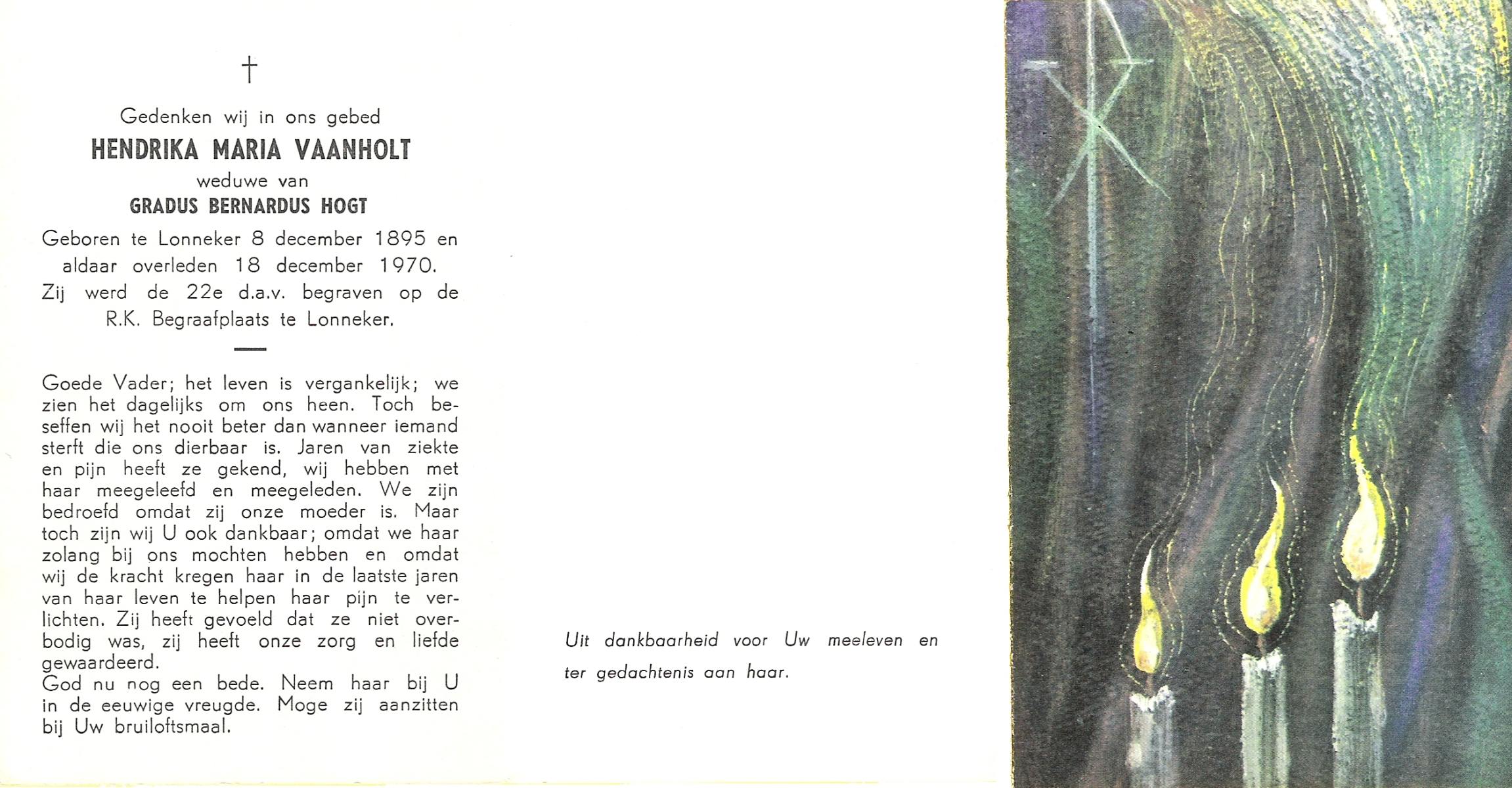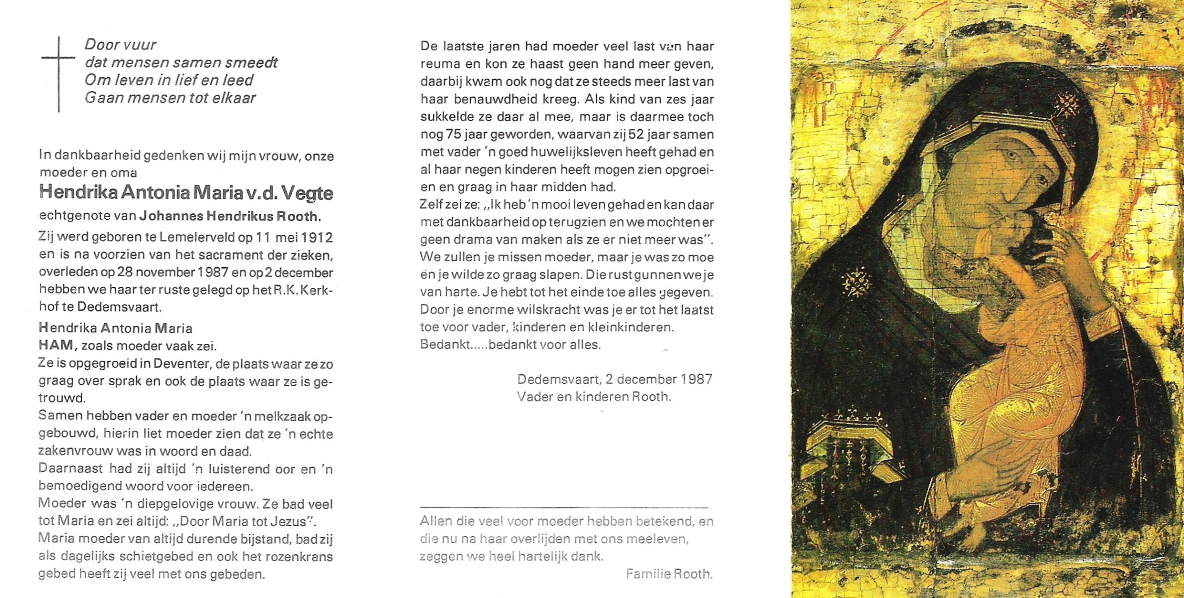 VEGTE, v.d., Hendrika Antonia Maria, geboren op 11-5-1912 te Lemerlerveld, overleden op 28-11-1987 op 75-jarige leeftijd, begraven op 2-12-1987 te Dedemsvaart.