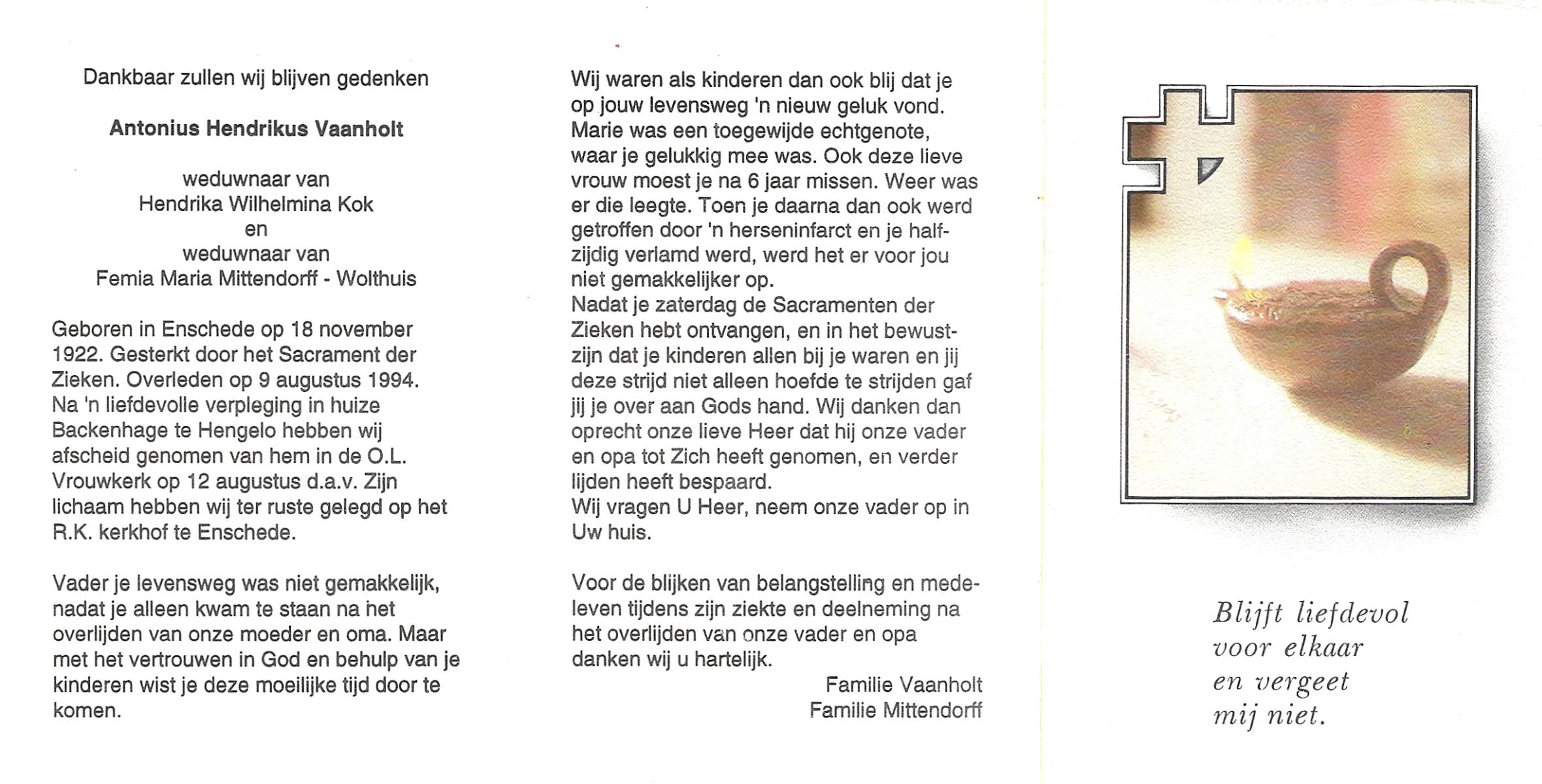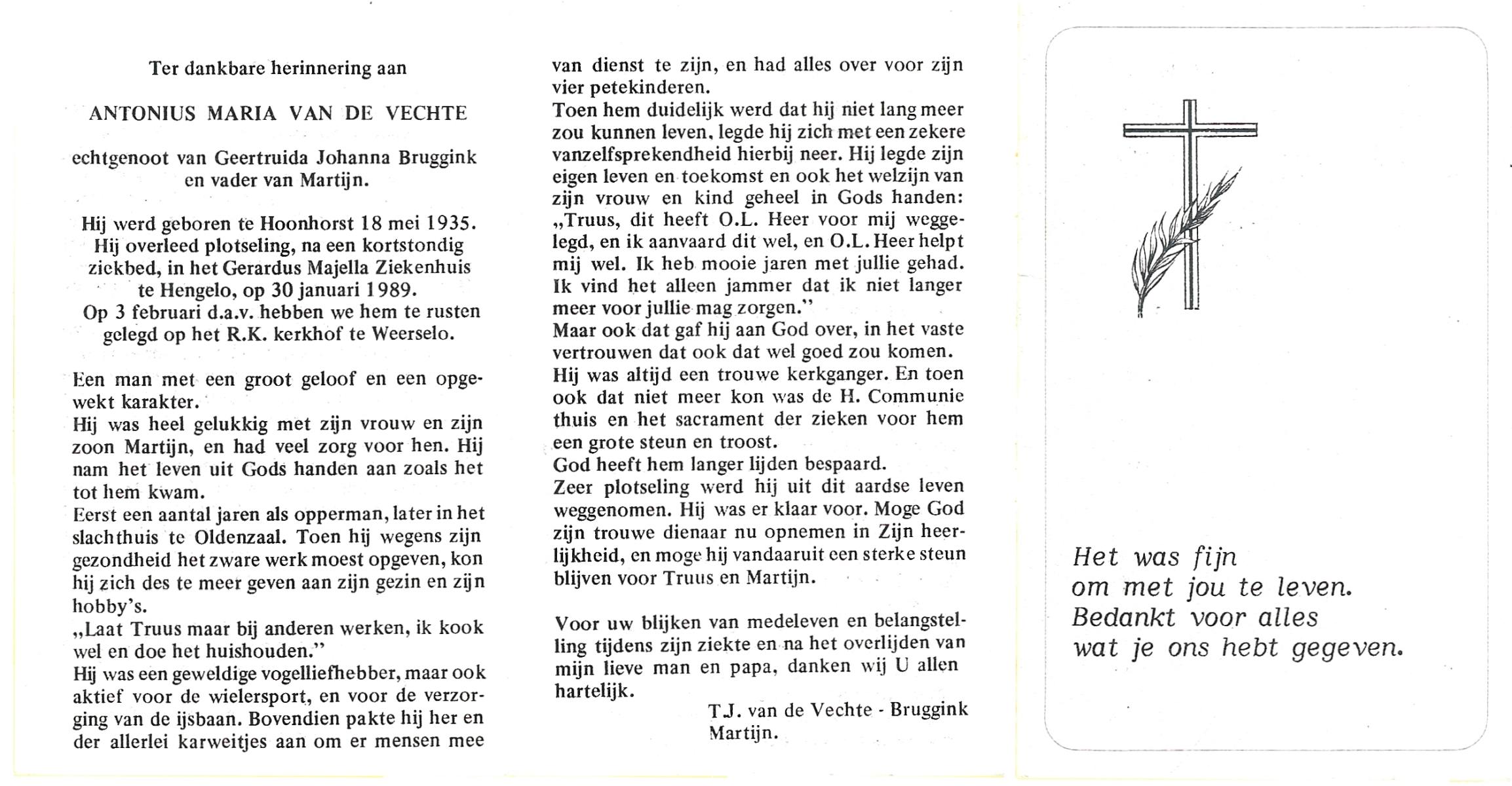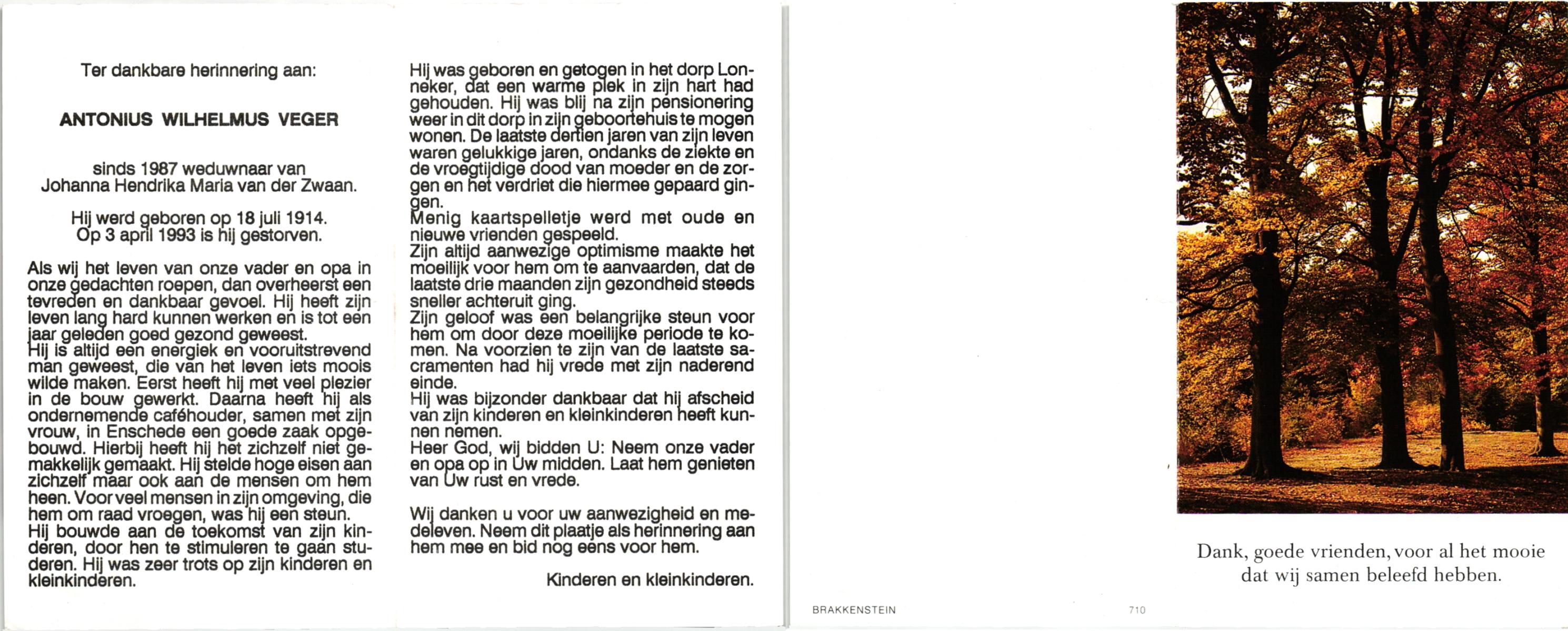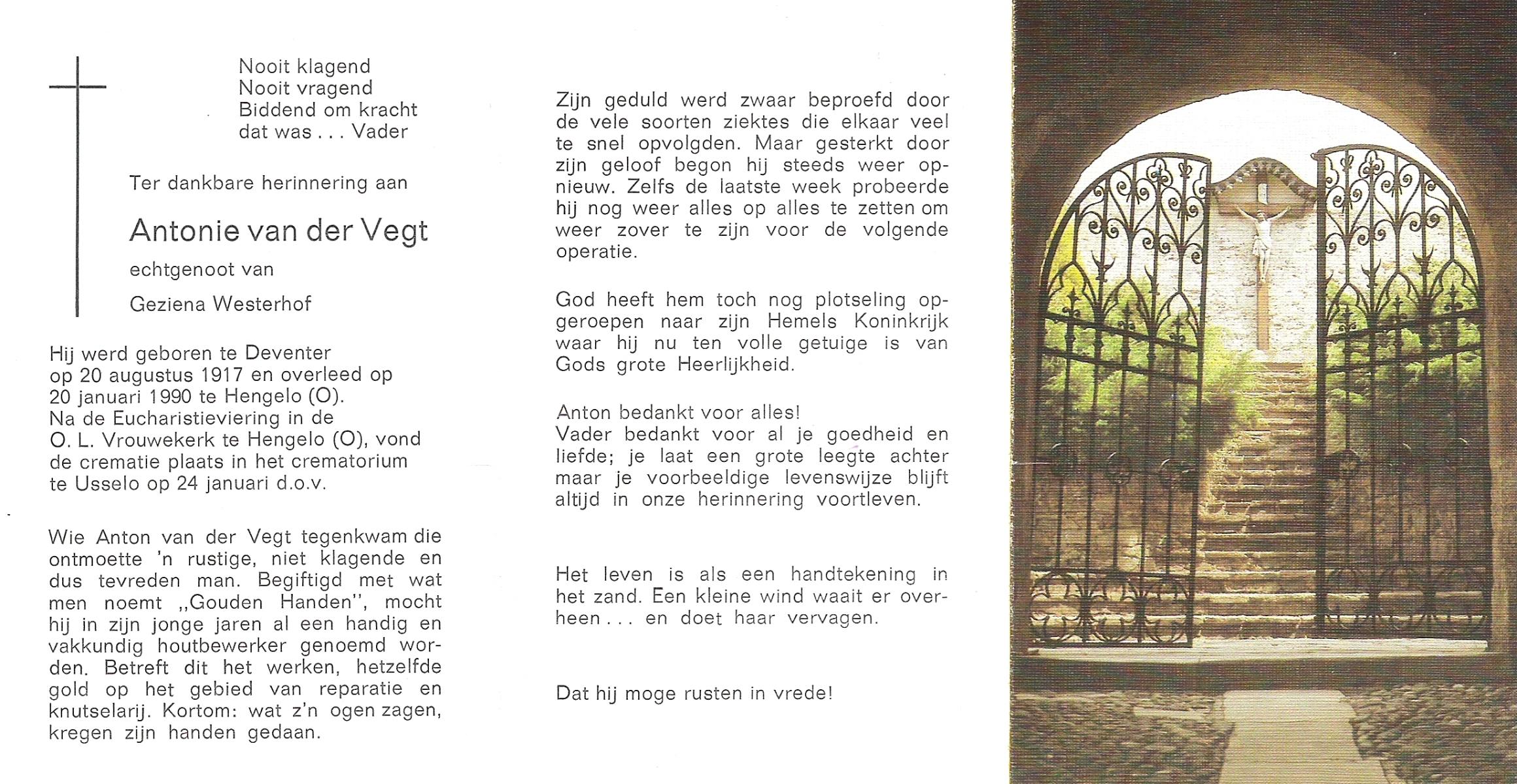VEGT, van der, Antonie, geboren op 20-8-1917 te Deventer, overleden op 20-1-1990 te Hengelo (Ov.) op 72-jarige leeftijd, gecremeerd op 24-1-1990 te Usselo.