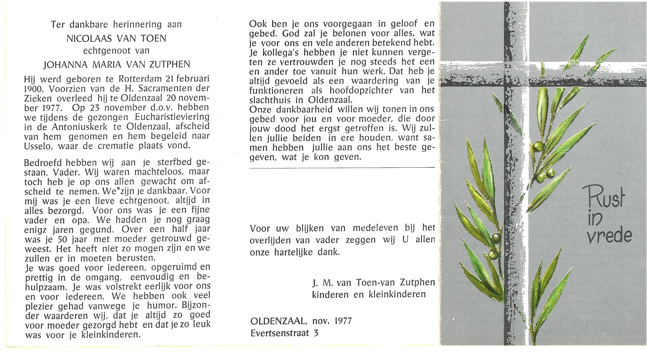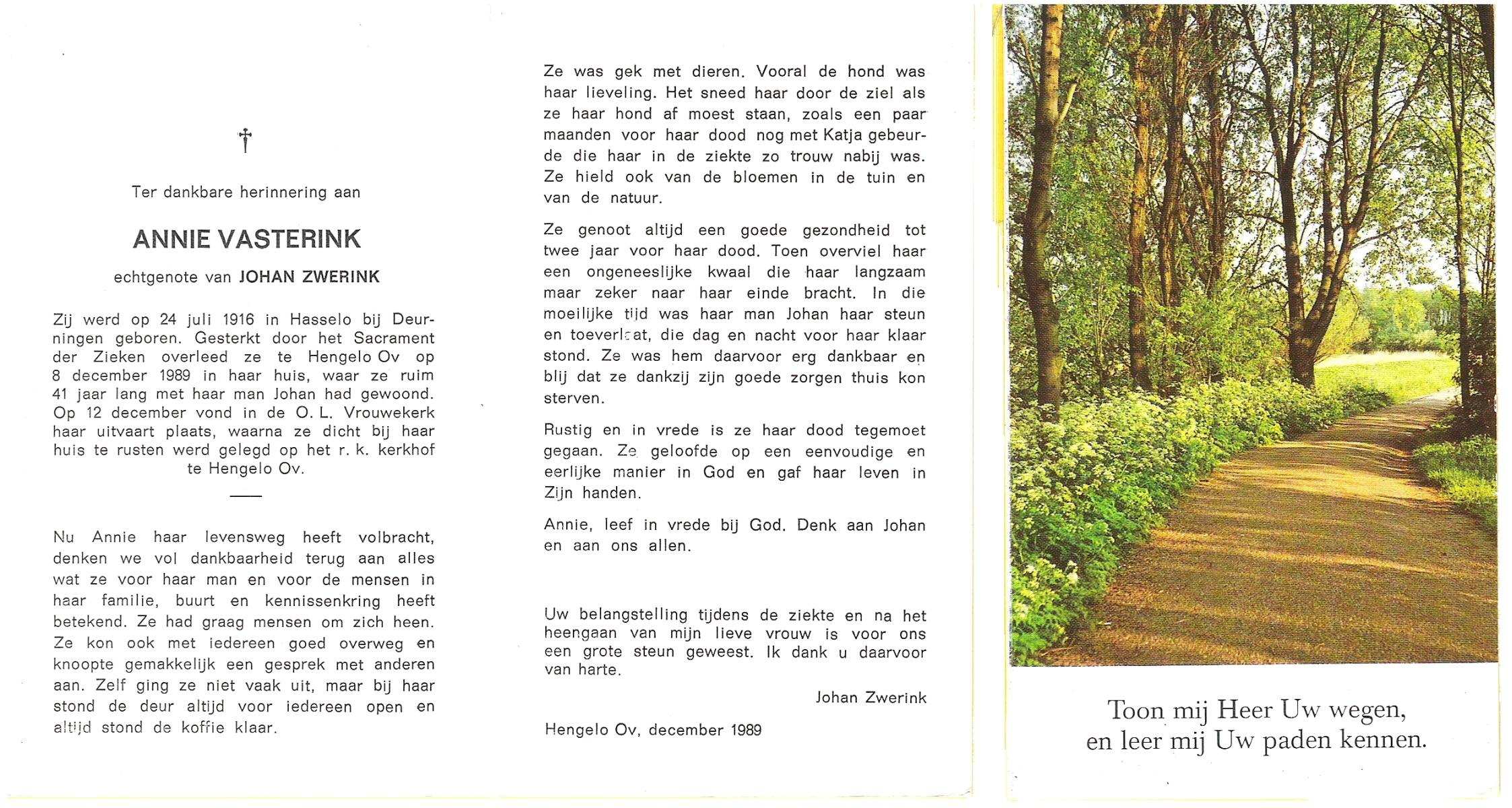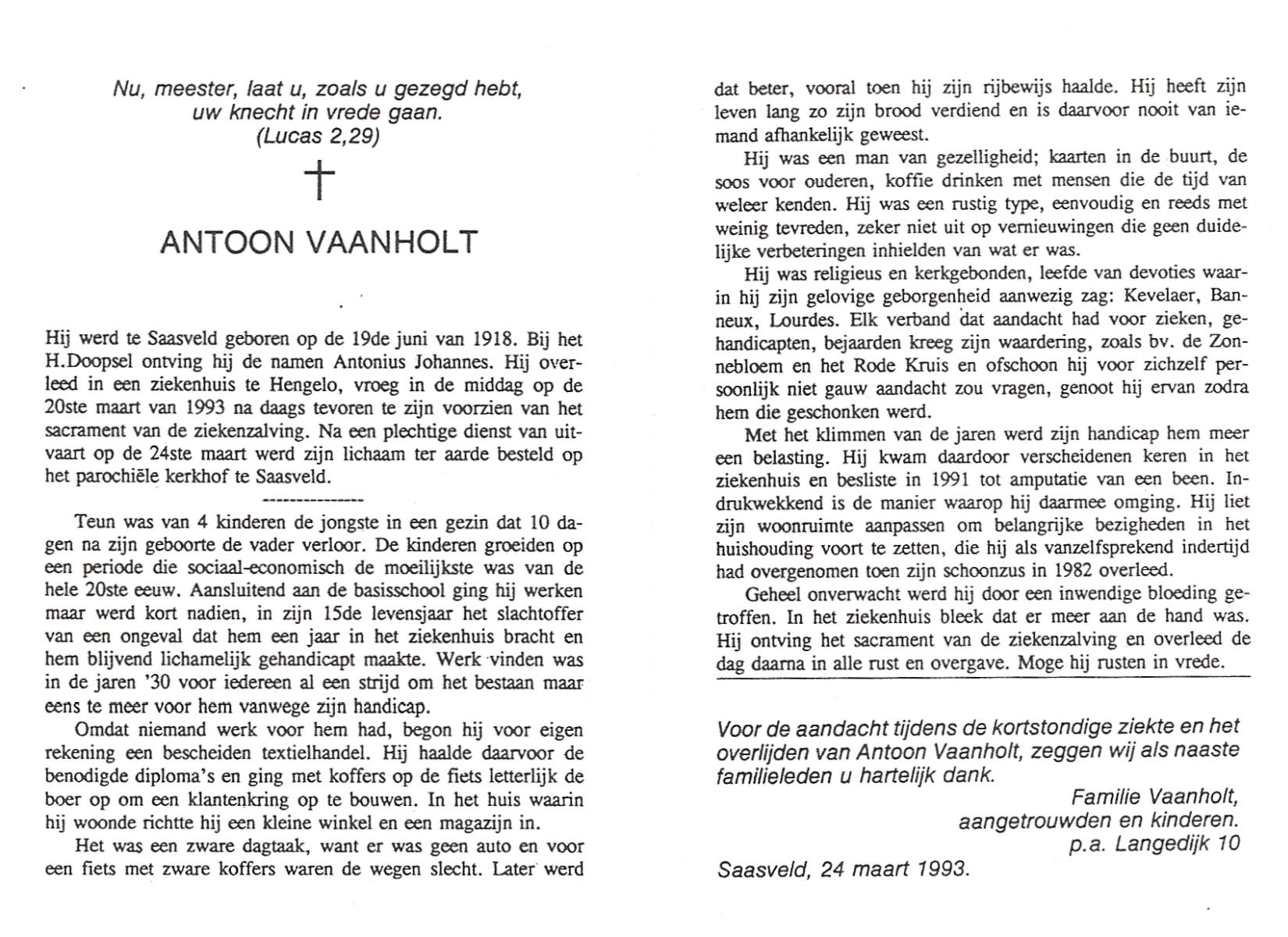 VEGT, van der, Antonie, geboren op 20-8-1917 te Deventer, overleden op 20-1-1990 te Hengelo (Ov.) op 72-jarige leeftijd, gecremeerd op 24-1-1990 te Usselo.