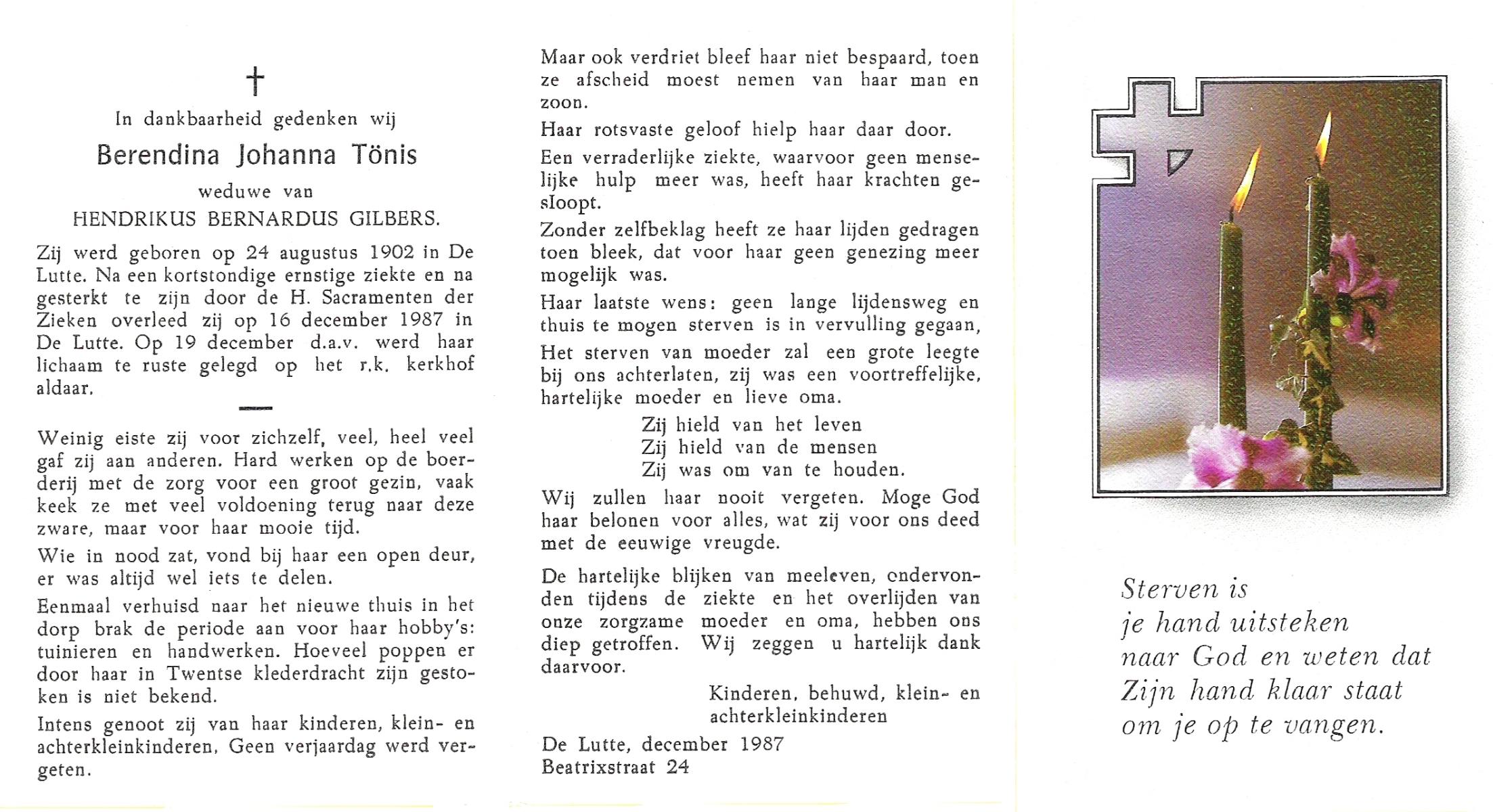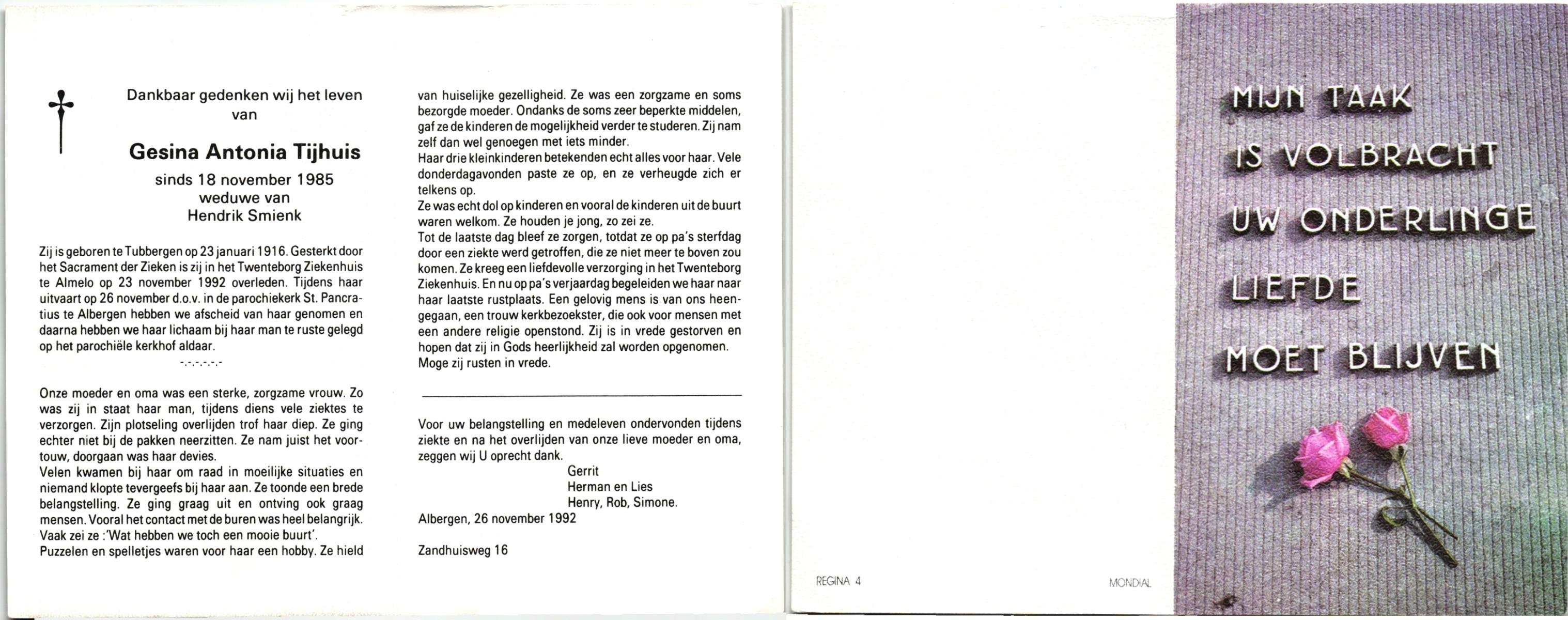 TIJHUIS, , Gesina Antonia, geboren op 23-1-1916 te Tubbergen, overleden op 23-11-1992 te Almelo op 76-jarige leeftijd, begraven op 26-11-1992 te Albergen.