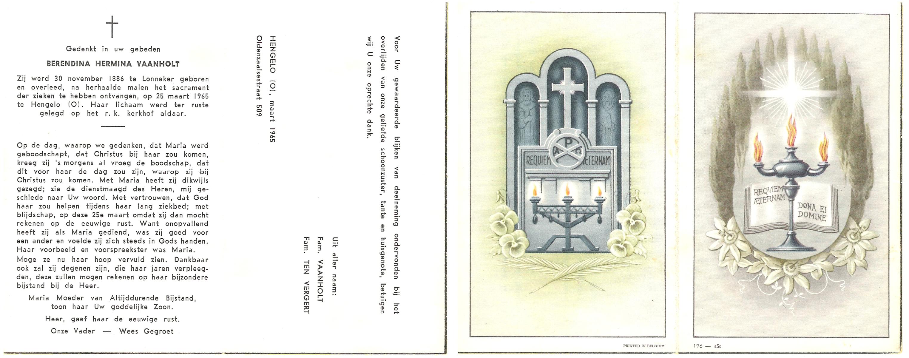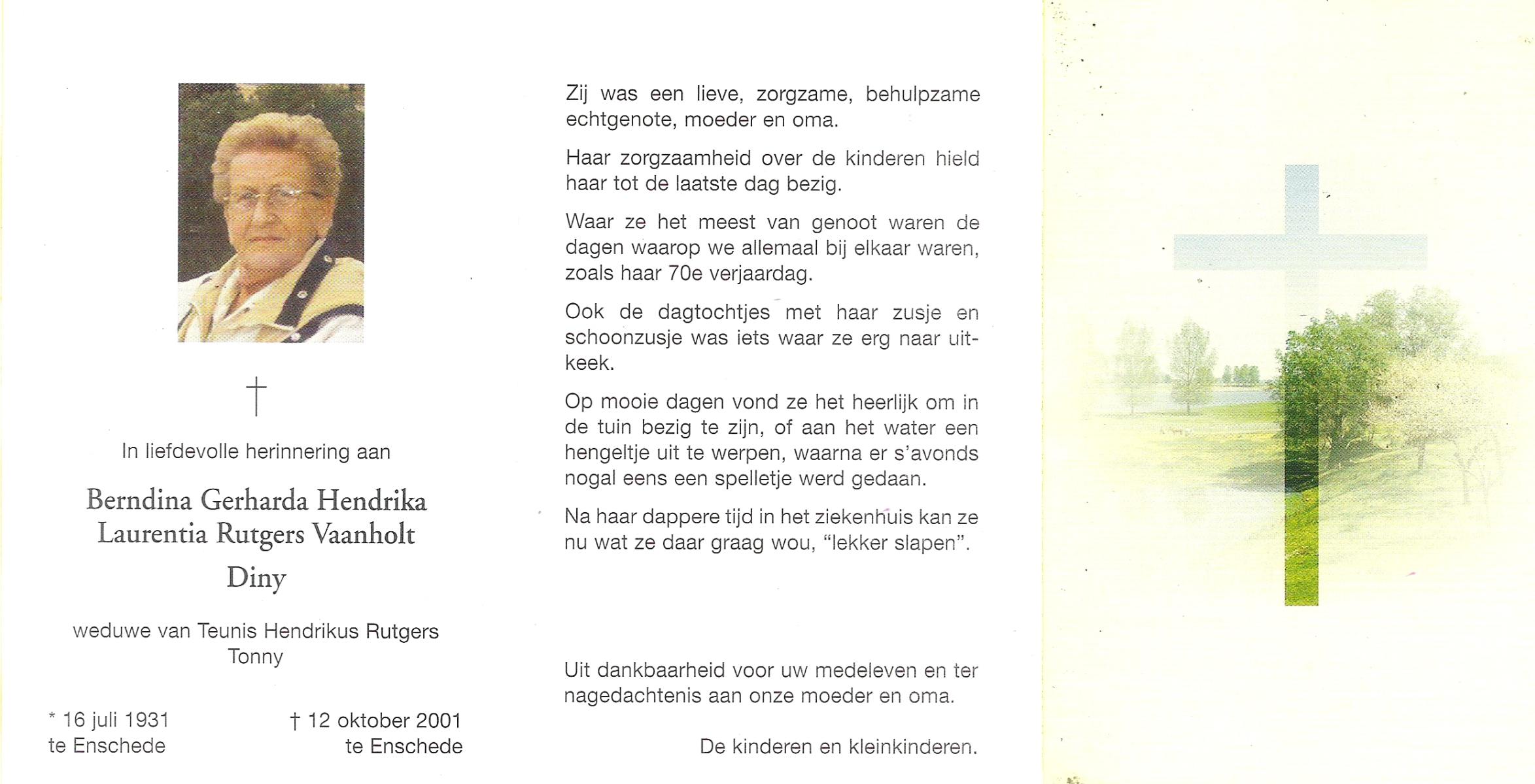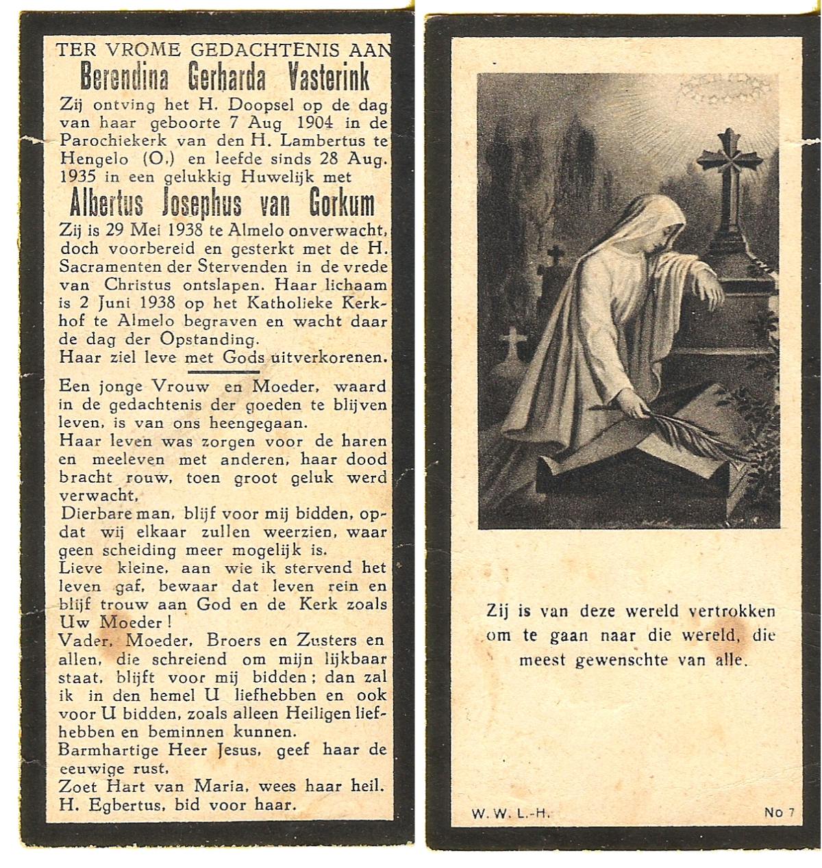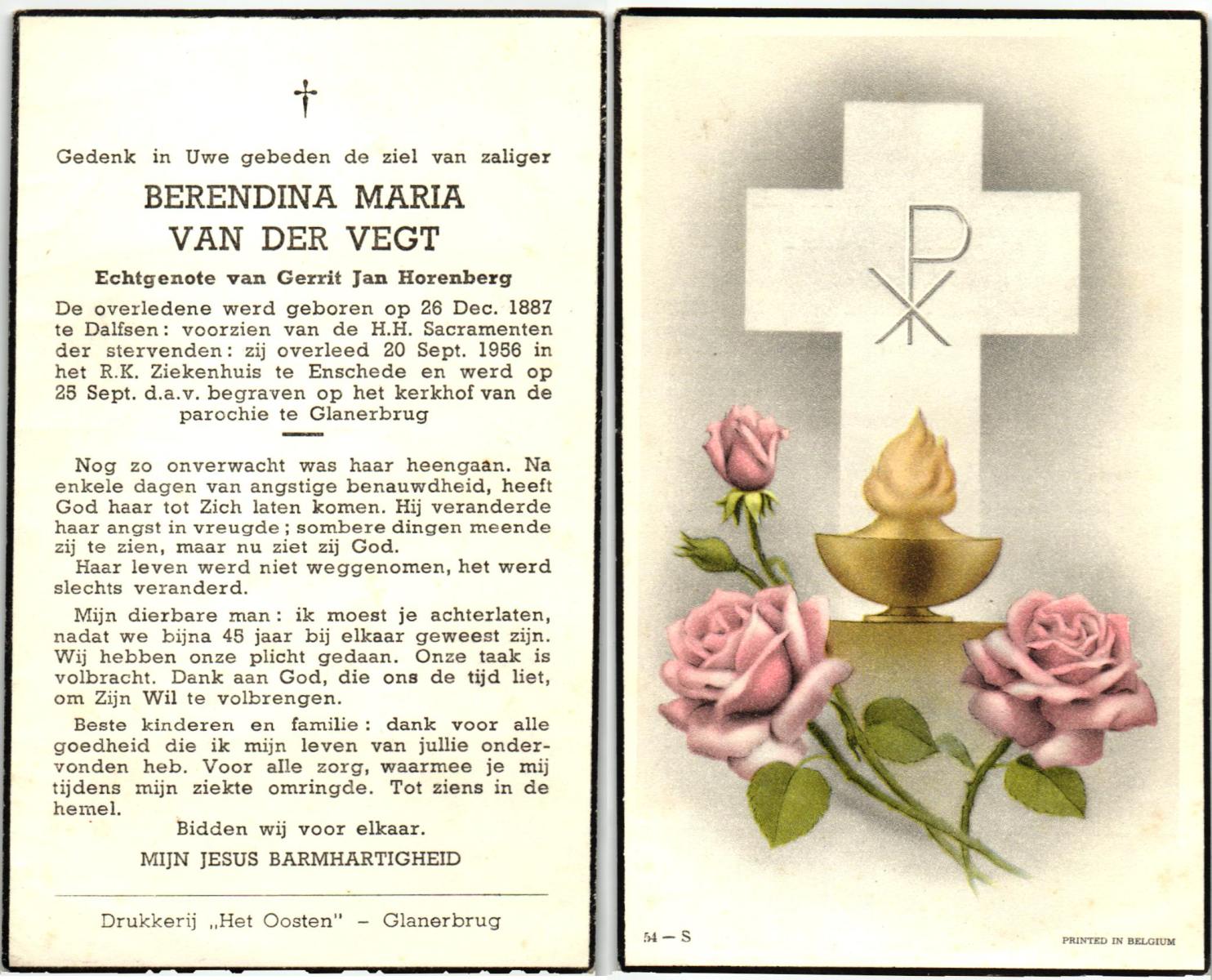 VEGT, van der, Berendina Maria, geboren op 26-12-1887 te Dalfsen, overleden op 20-9-1956 te Enschede, ziekenhuis op 68-jarige leeftijd, begraven op 28-9-1956 te Glanerbrug.