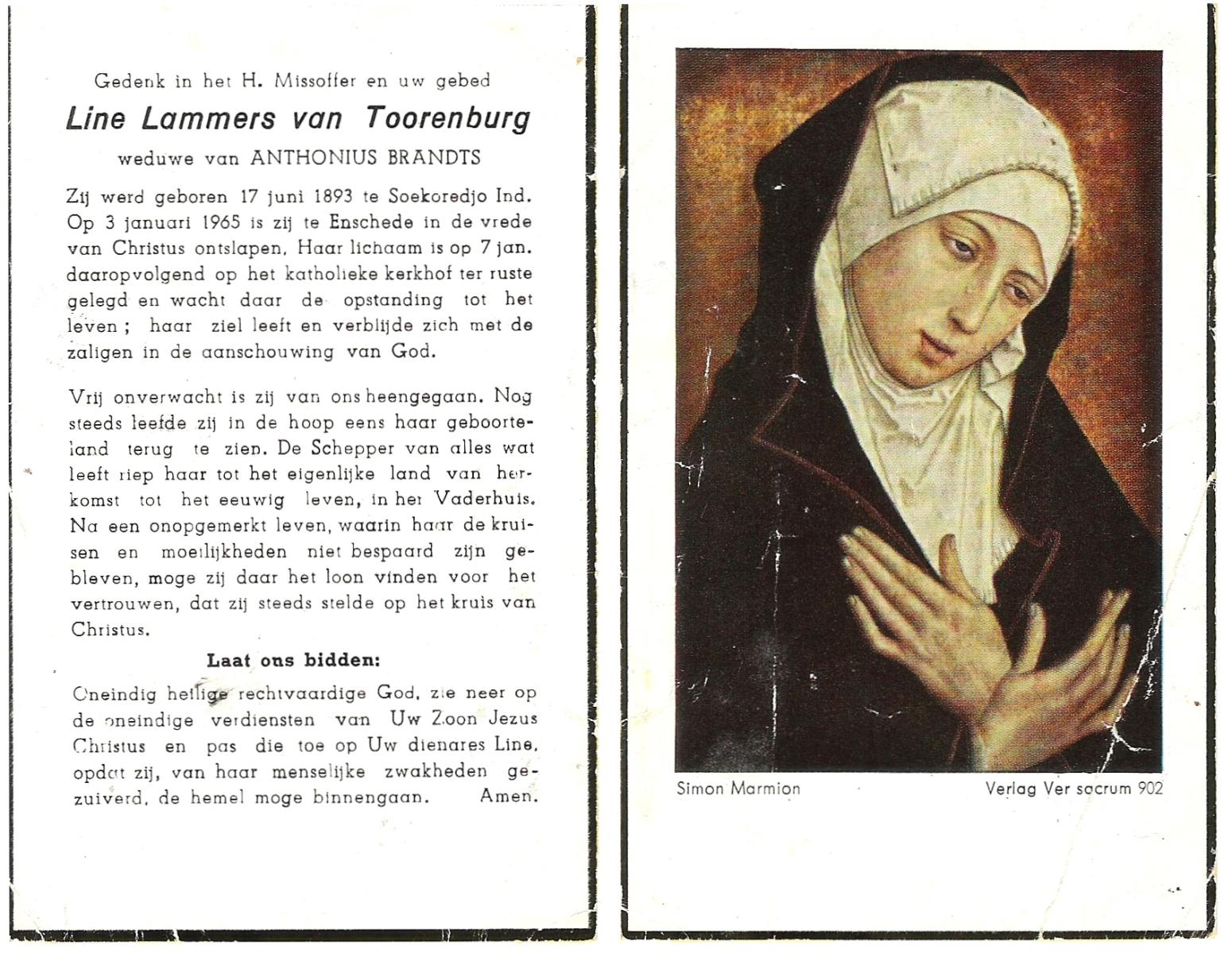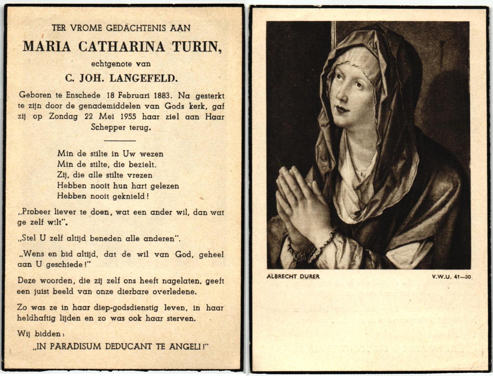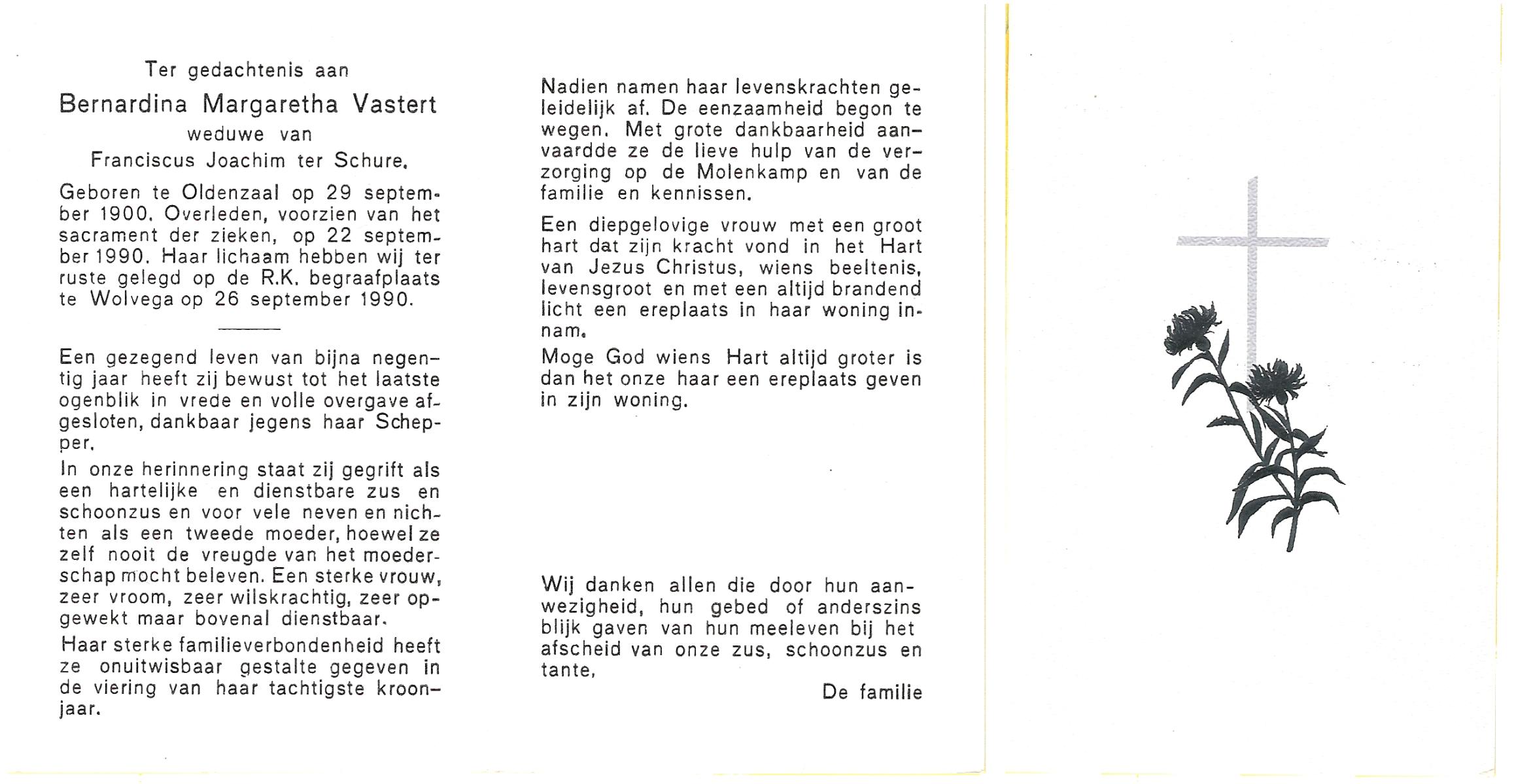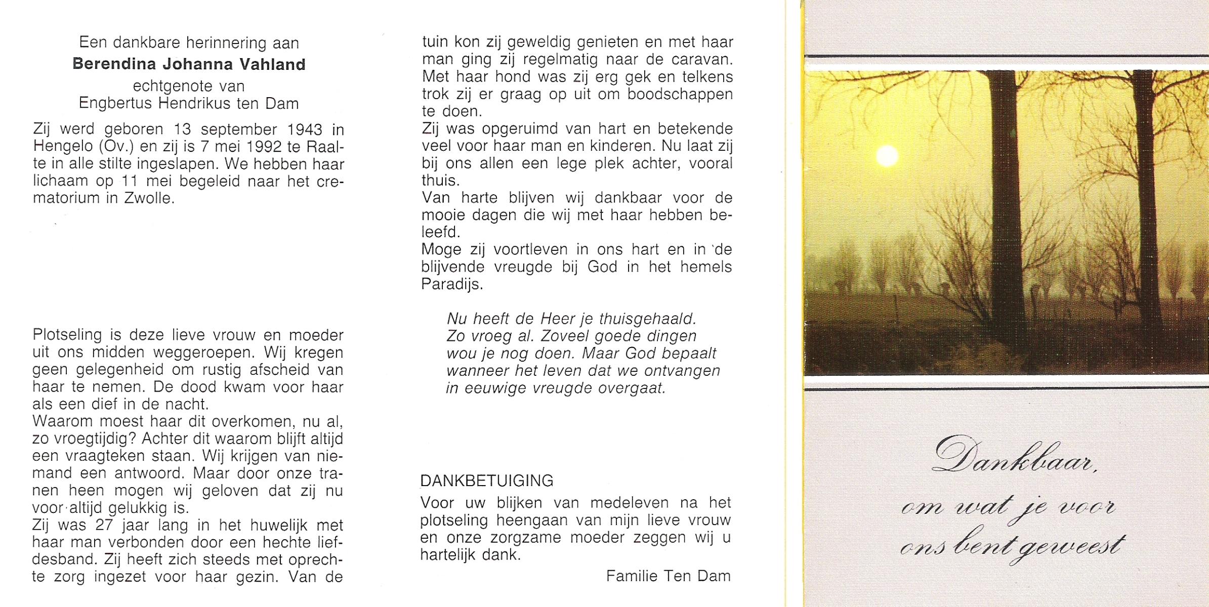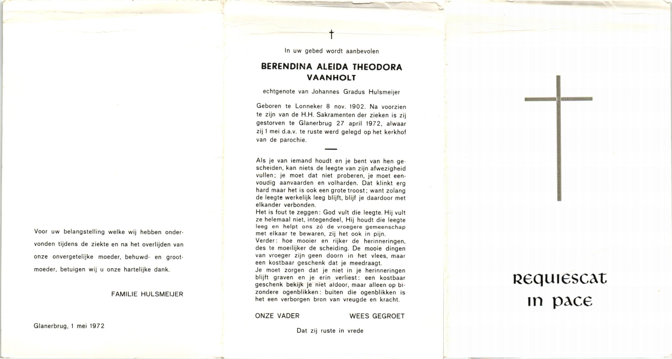 VEGT, van der, Berendina Maria, geboren op 26-12-1887 te Dalfsen, overleden op 20-9-1956 te Enschede, ziekenhuis op 68-jarige leeftijd, begraven op 28-9-1956 te Glanerbrug.