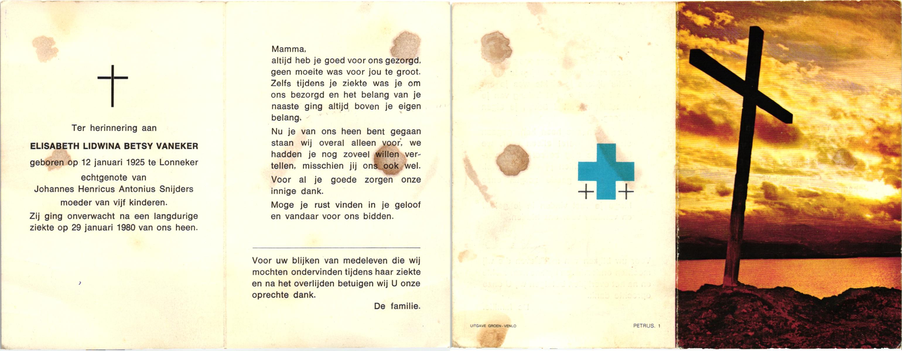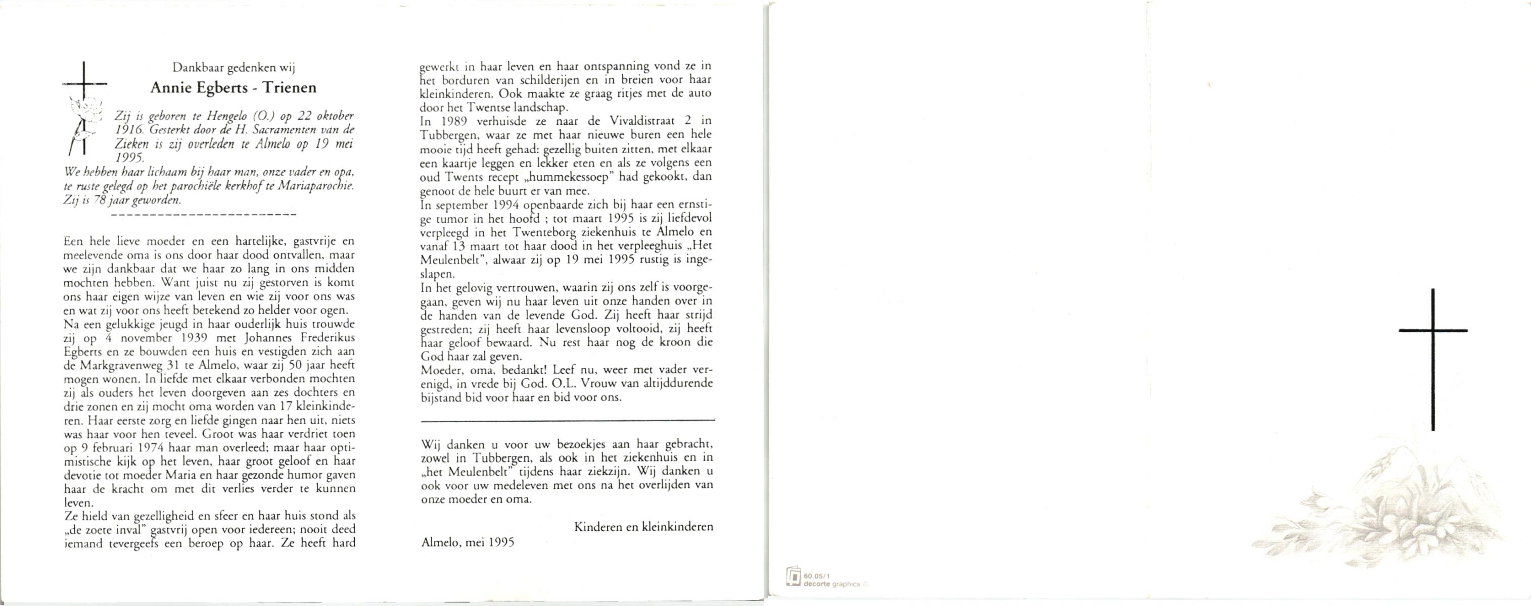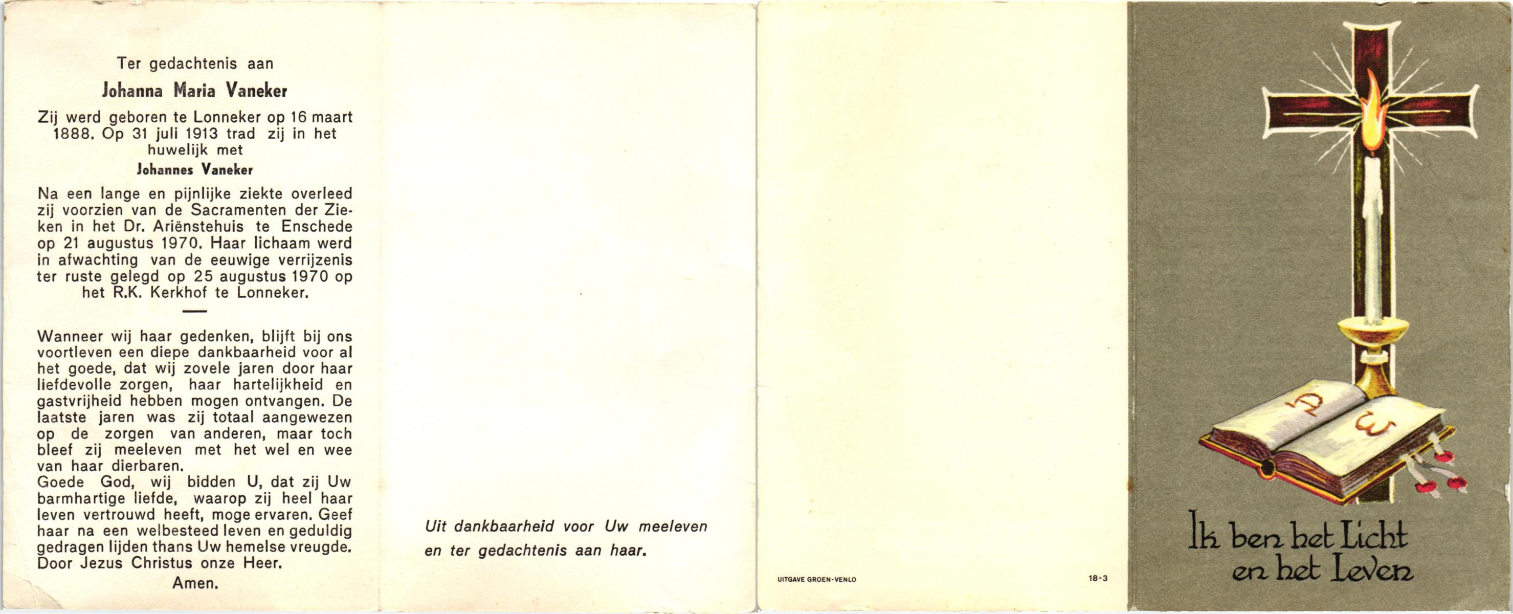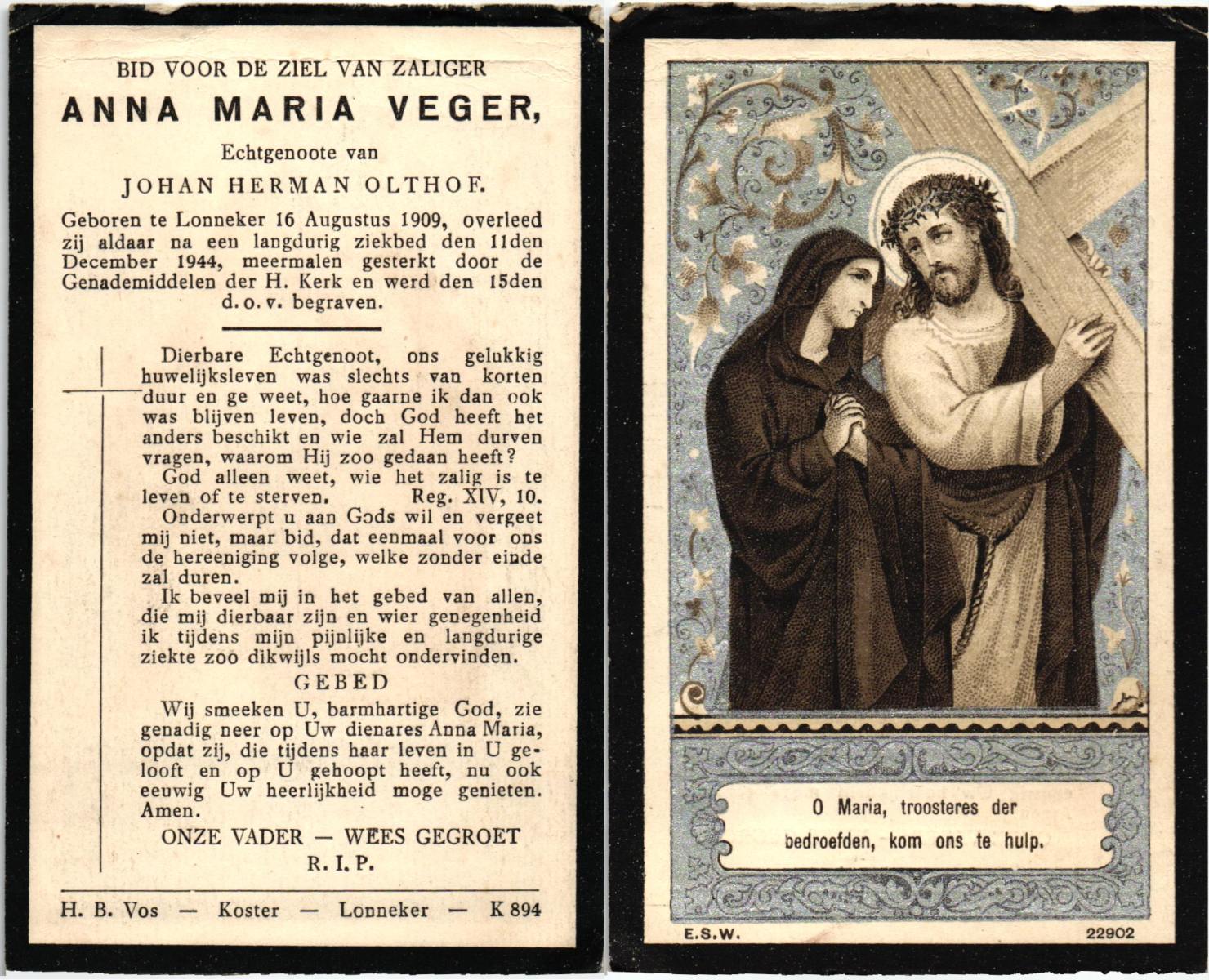 VEGER, Anna Maria, geboren op 16-8-1909 te Lonneker, overleden op 11-12-1944 te Lonneker op 35-jarige leeftijd, begraven op 15-12-1944 te Lonneker.