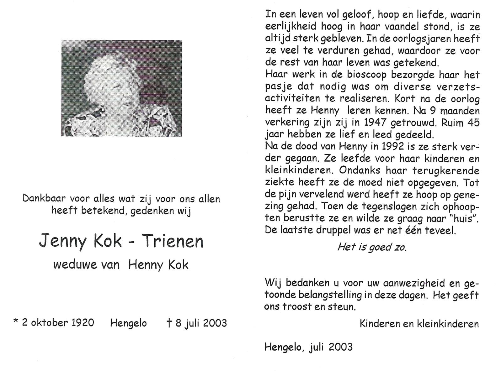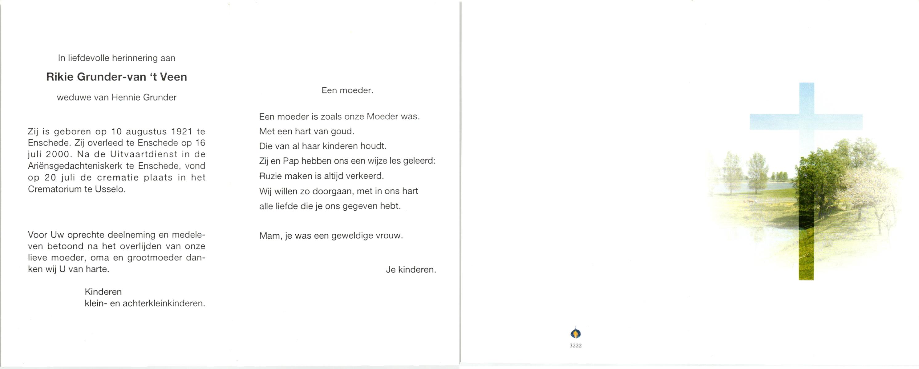 VEEN, van t, Rikie, geboren op 10-8-1921 te Enschede, overleden op 16-7-2000 te Enschede op 78-jarige leeftijd, gecremeerd op 20-7-2000 te Usselo.