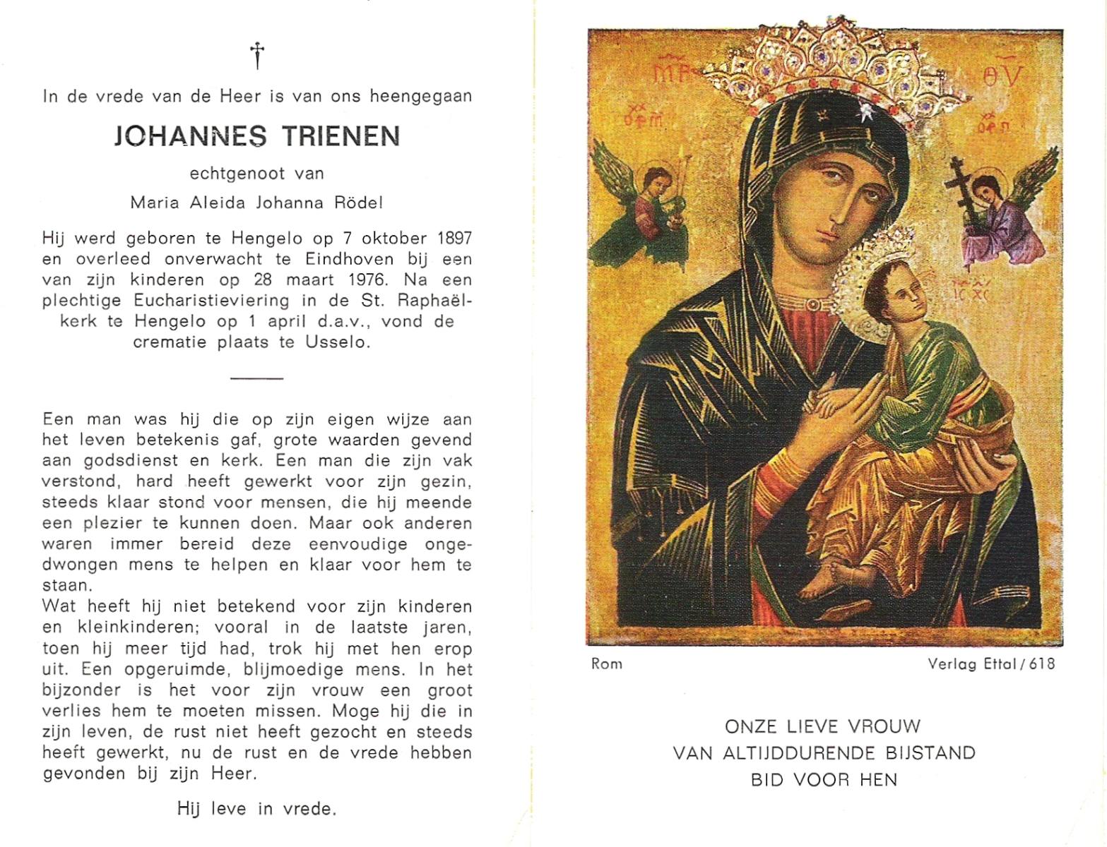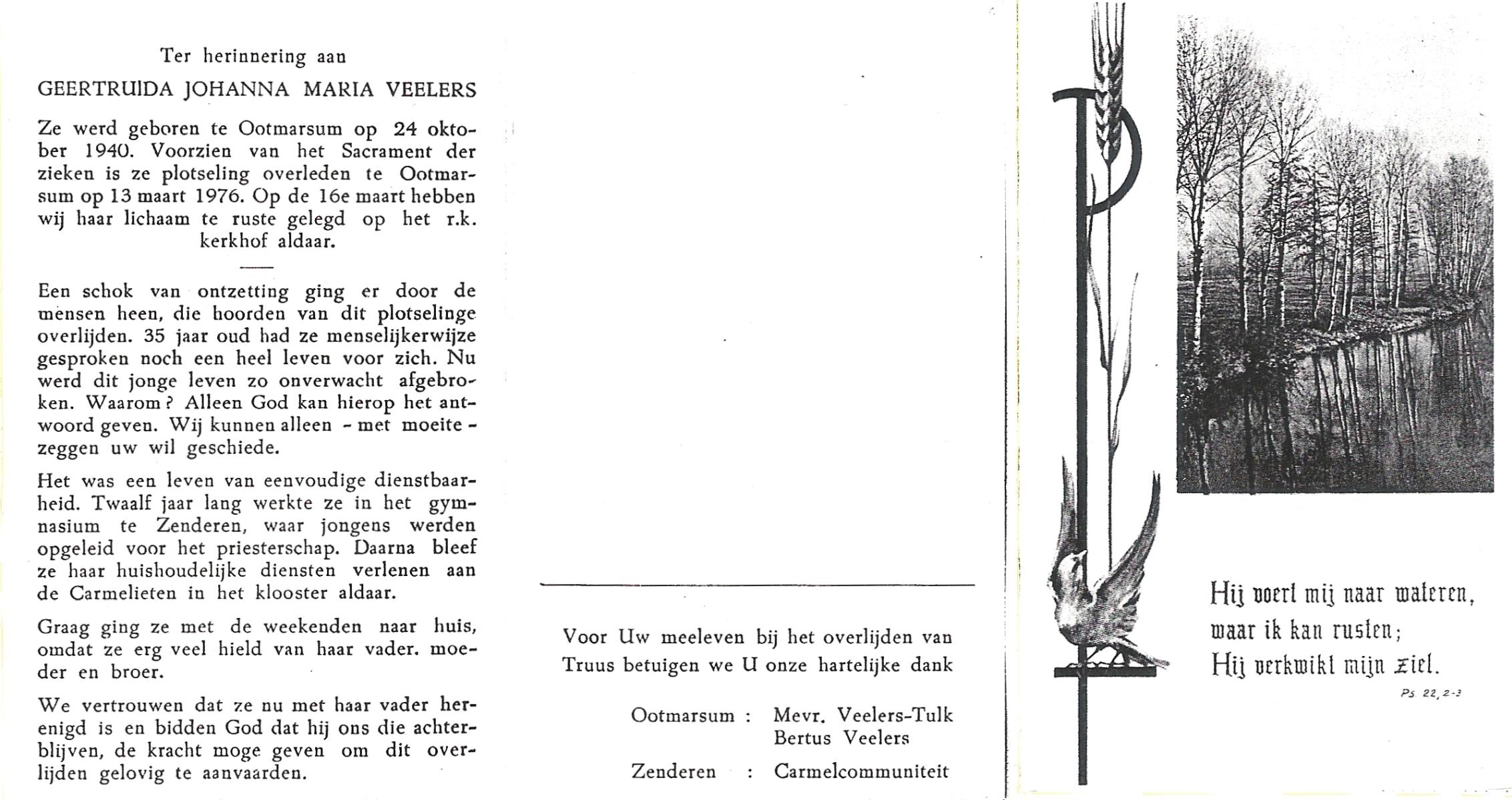 VEELERS, Geertruida Johanna Maria, geboren op 24-10-1940 te Ootmarsum, overleden op 13-3-1976 te Ootmarsum op 35-jarige leeftijd, begraven op 16-3-1976 te Ootmarsum.
