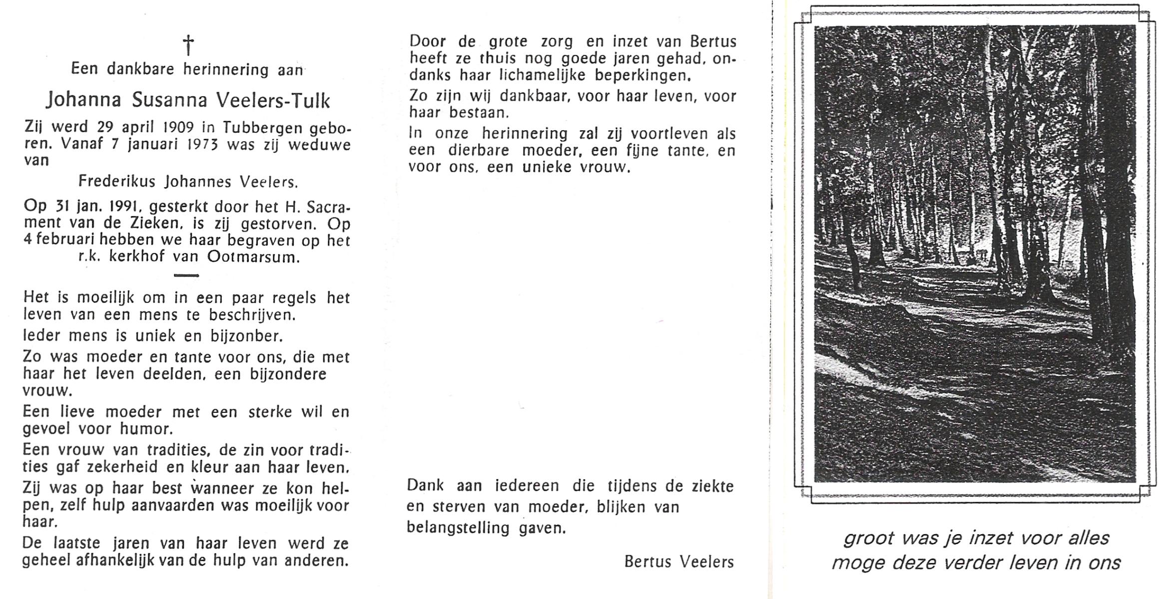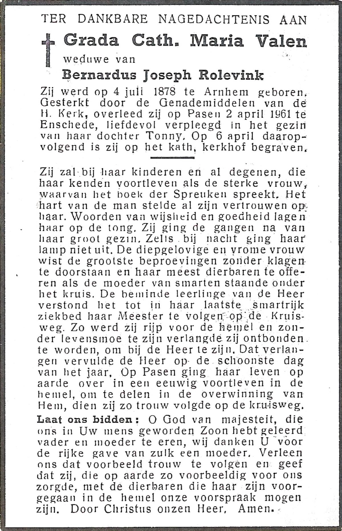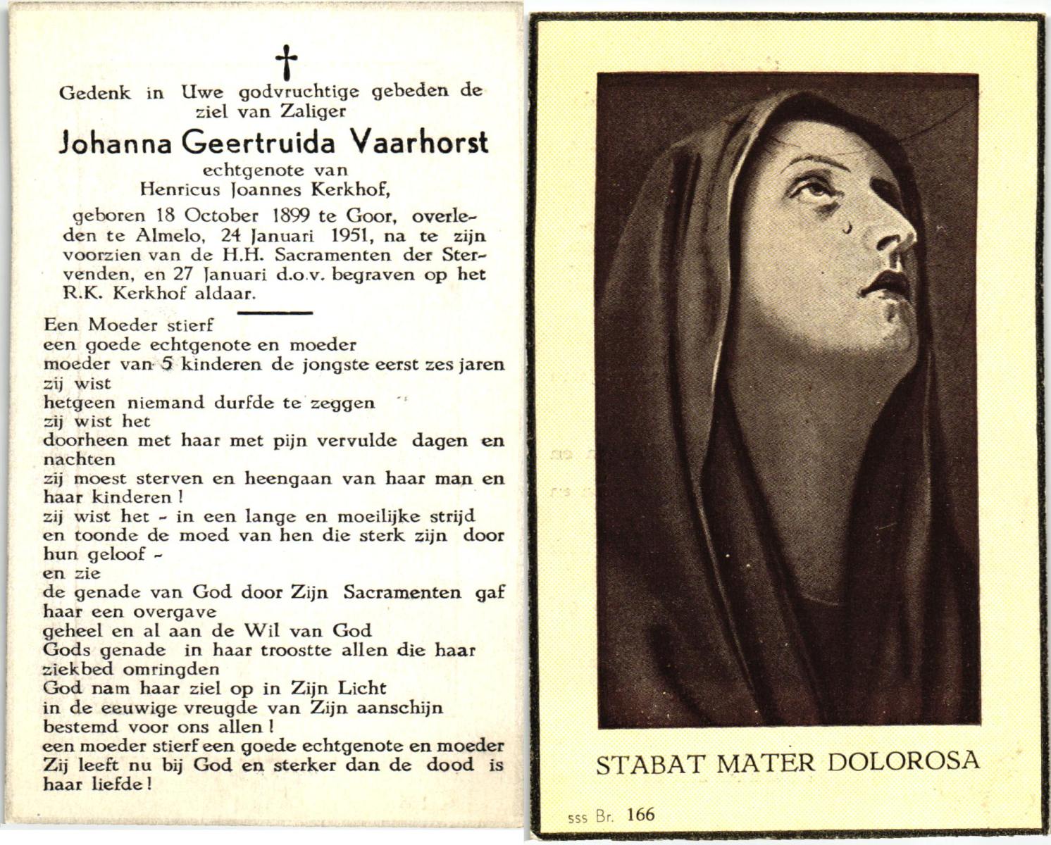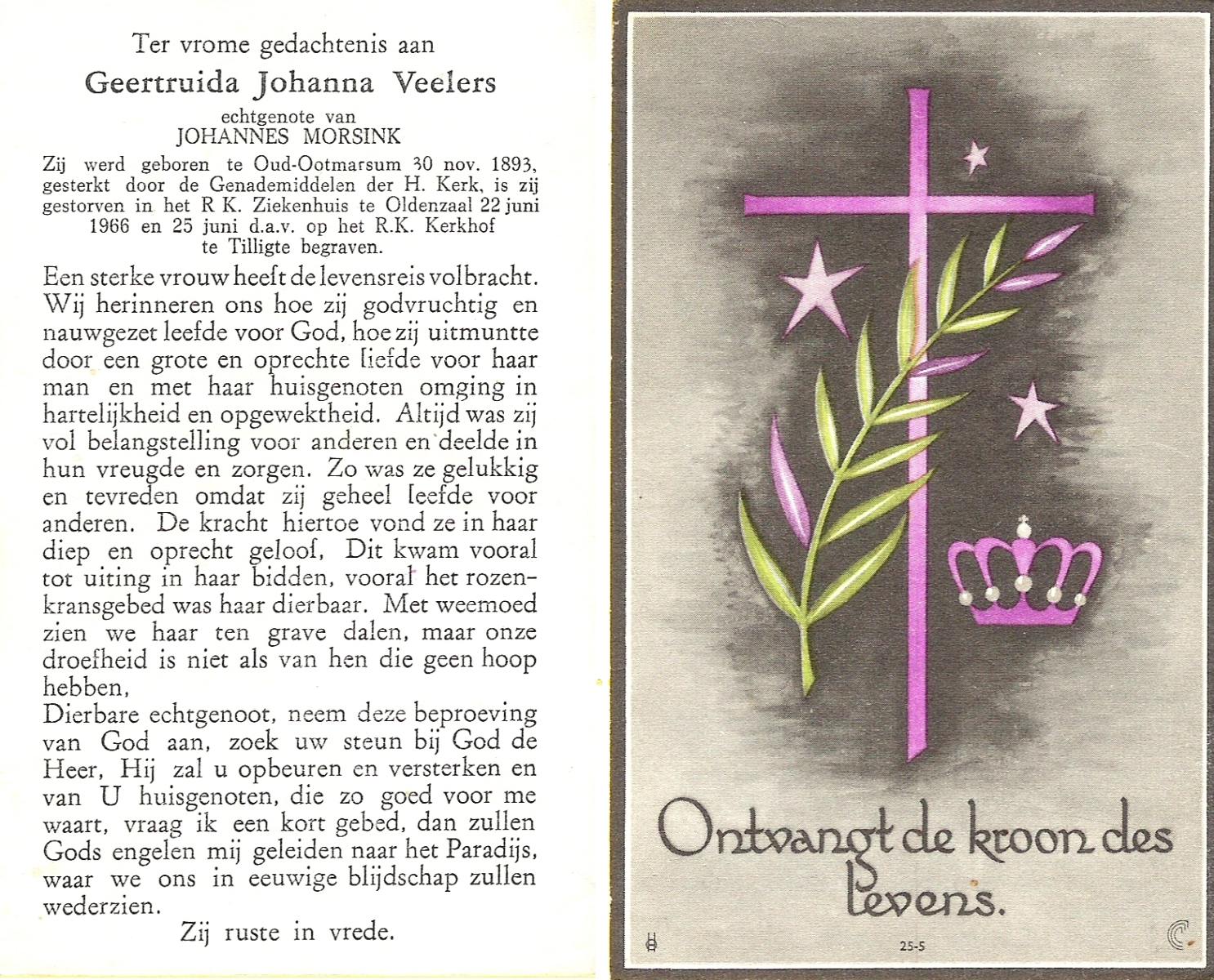 VEELERS, Geertruida Johanna, geboren op 30-11-1893 te Oud Ootmarsum, overleden op 22-6-1966 te Oldenzaal op 72-jarige leeftijd, begraven op 25-6-1966 te Tilligte R.K.kerhof.