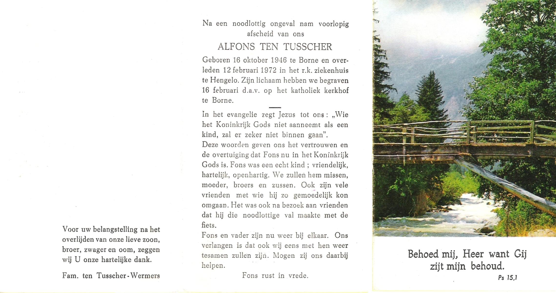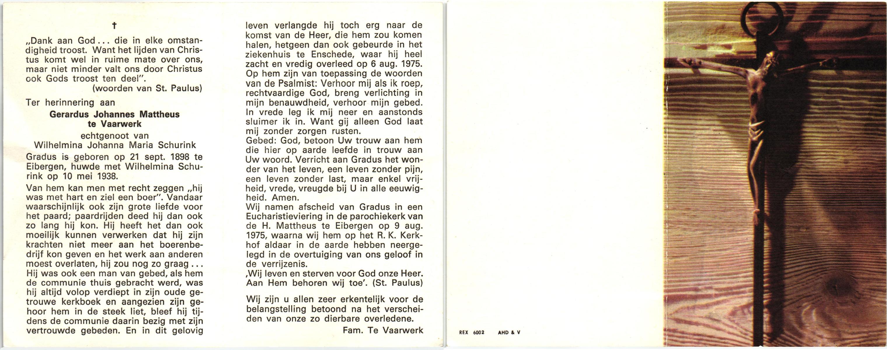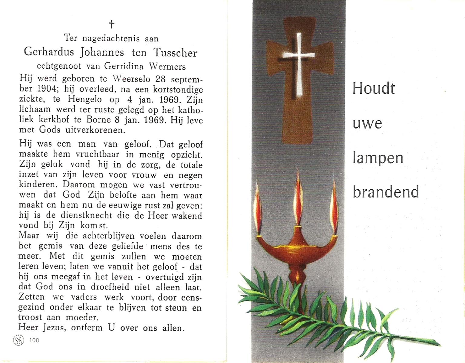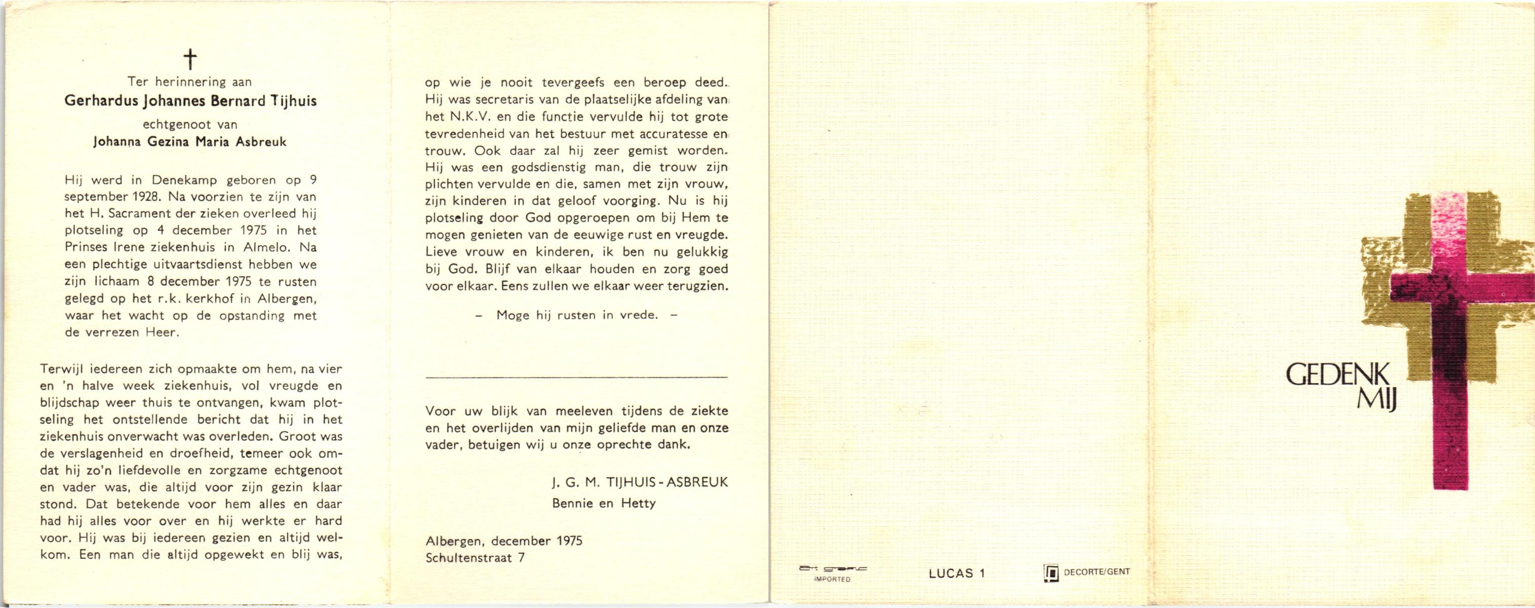 TIJHUIS, Gerhardus Johannes Bernard, geboren op 9-9-1928 te Denekamp, overleden op 4-12-1975 te Almelo, ziekenhuis op 47-jarige leeftijd, begraven op 8-12-1975 te Albergen.