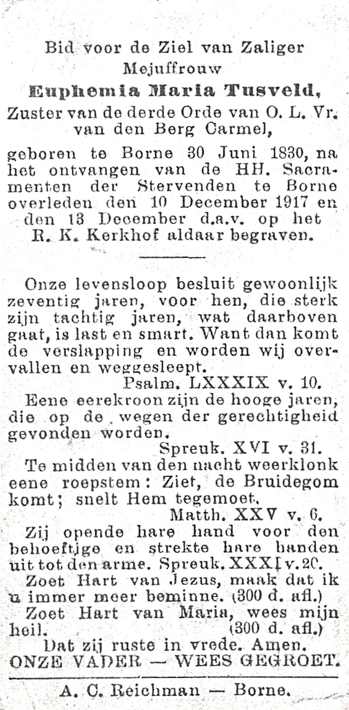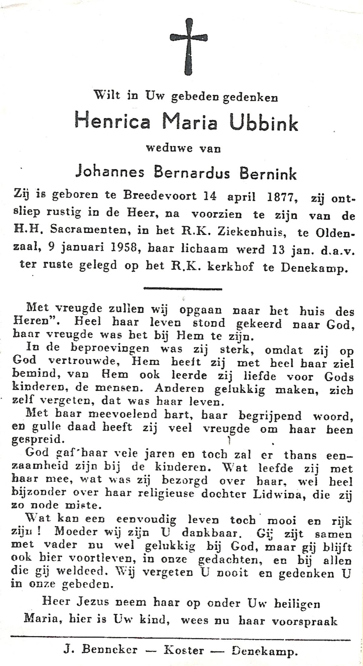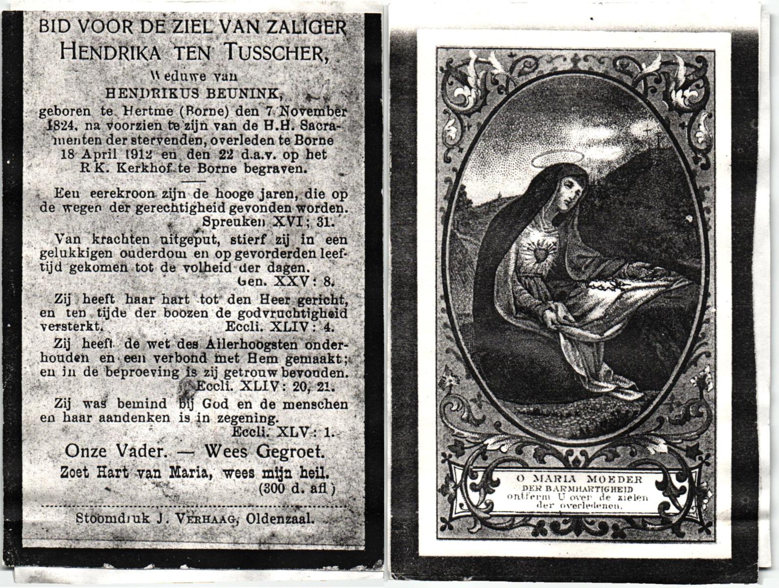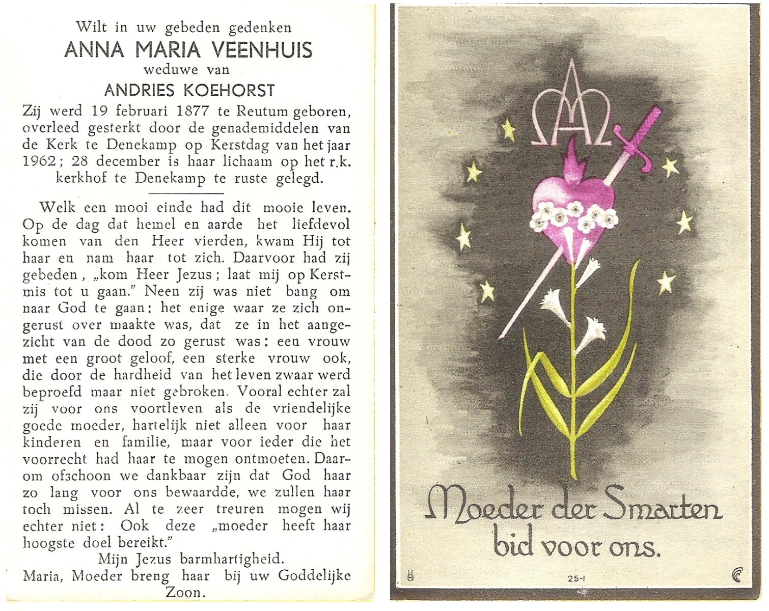 VEENHUIS, Anna Maria, geboren op 19-02-1877 te Reutum, overleden op 25-12-1962 te Denekamp op 85-jarige leeftijd, begraven op 28-12-1962 te Denekamp R.K.kerkhof.