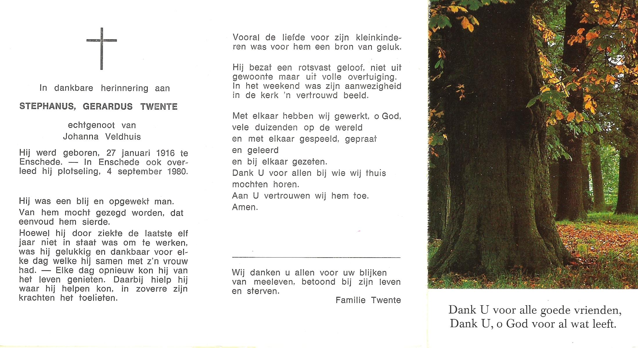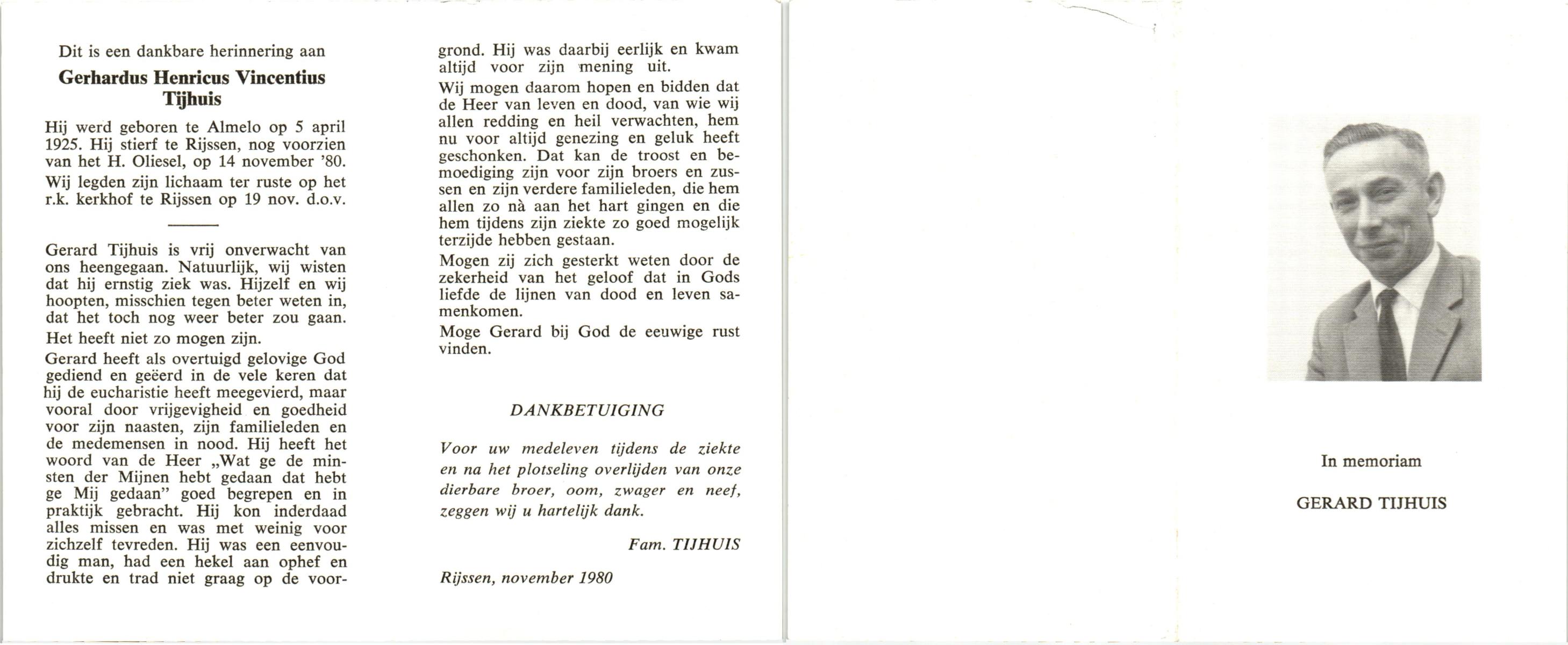 TIJHUIS, Gerhardus Henricus Vincentius, geboren op 5-4-1925 te Almelo, overleden op 14-11-1980 te Rijssen op 55-jarige leeftijd, begraven op 19-11-1980 te Rijssen, rk.
