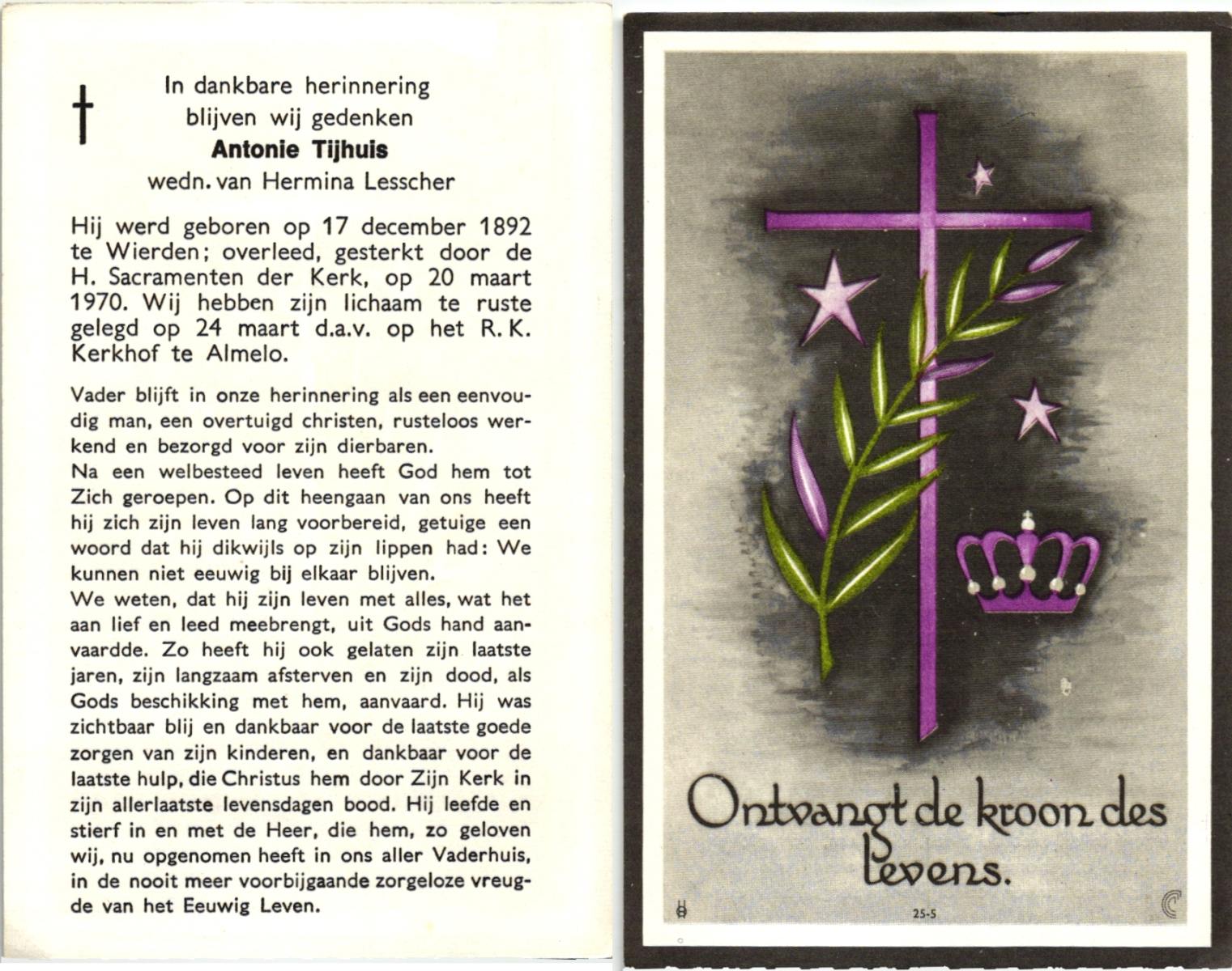 TIJHUIS, , Antonie, geboren op 17-12-1892 te Wierden, overleden op 20-3-1970 op 77-jarige leeftijd, begraven op 24-3-1970 te Almelo, rk.