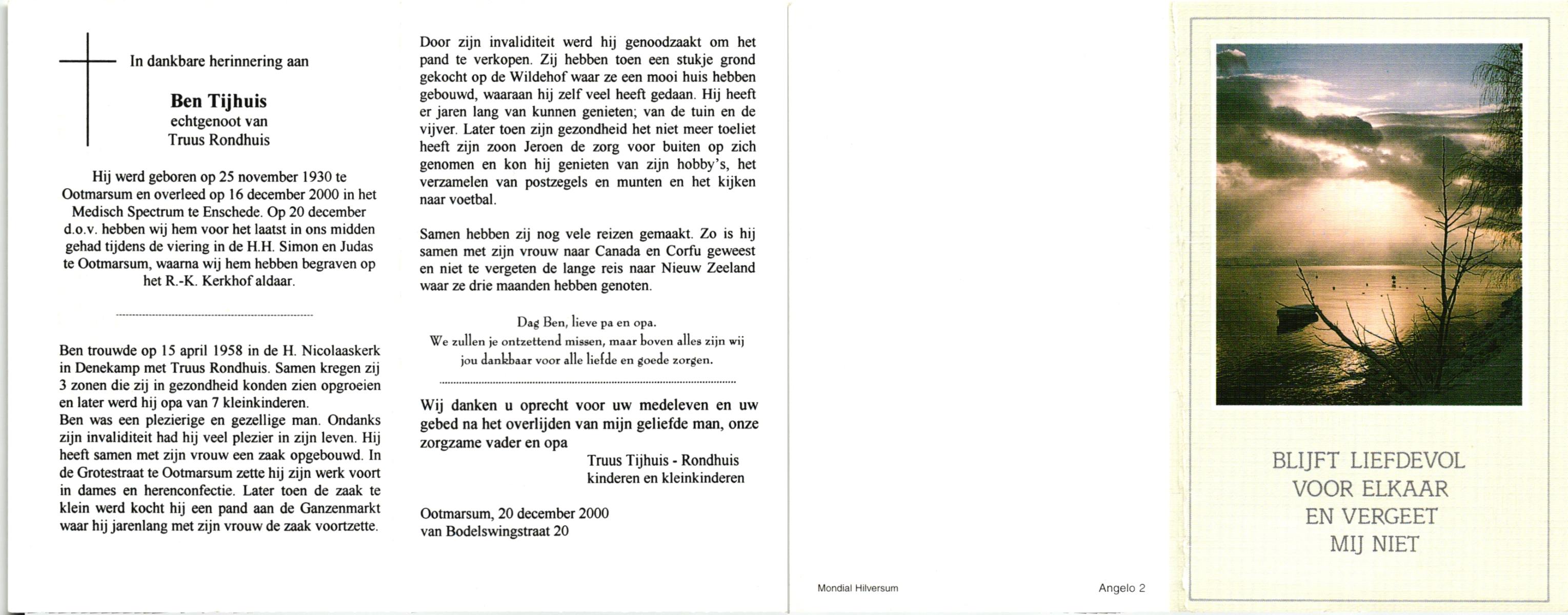 TIJHUIS, , Ben, geboren op 25-11-1930 te Ootmarsum, overleden op 16-12-2000 te Enschede op 70-jarige leeftijd, begraven op 20-12-2000 te Ootmarsum.