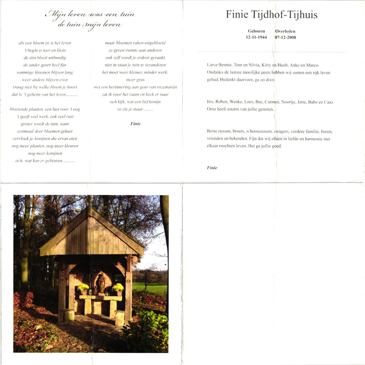 TIJHUIS, , Finie, geboren op 12-11-1944, overleden op 7-12-2008 op 64-jarige leeftijd.