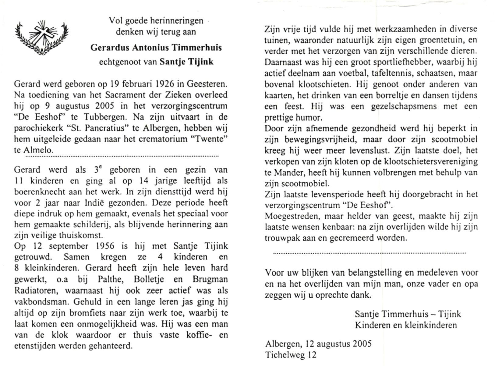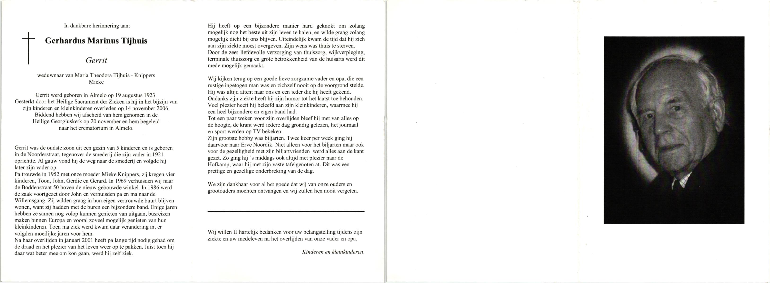 TIJHUIS, , Gerhardus Marinus (Gerrit), geboren op 19-8-1923 te Almelo, overleden op 14-11-2006 op 83-jarige leeftijd, gecremeerd op 20-11-2006 te Almelo.