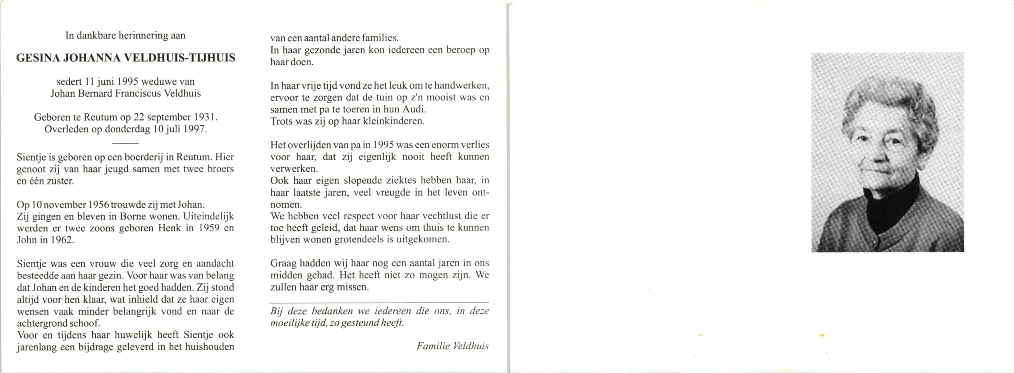 TIJHUIS, , Gesina Johanna, geboren op 22-9-1931 te Reutum, overleden op 10-7-1997 op 65-jarige leeftijd.