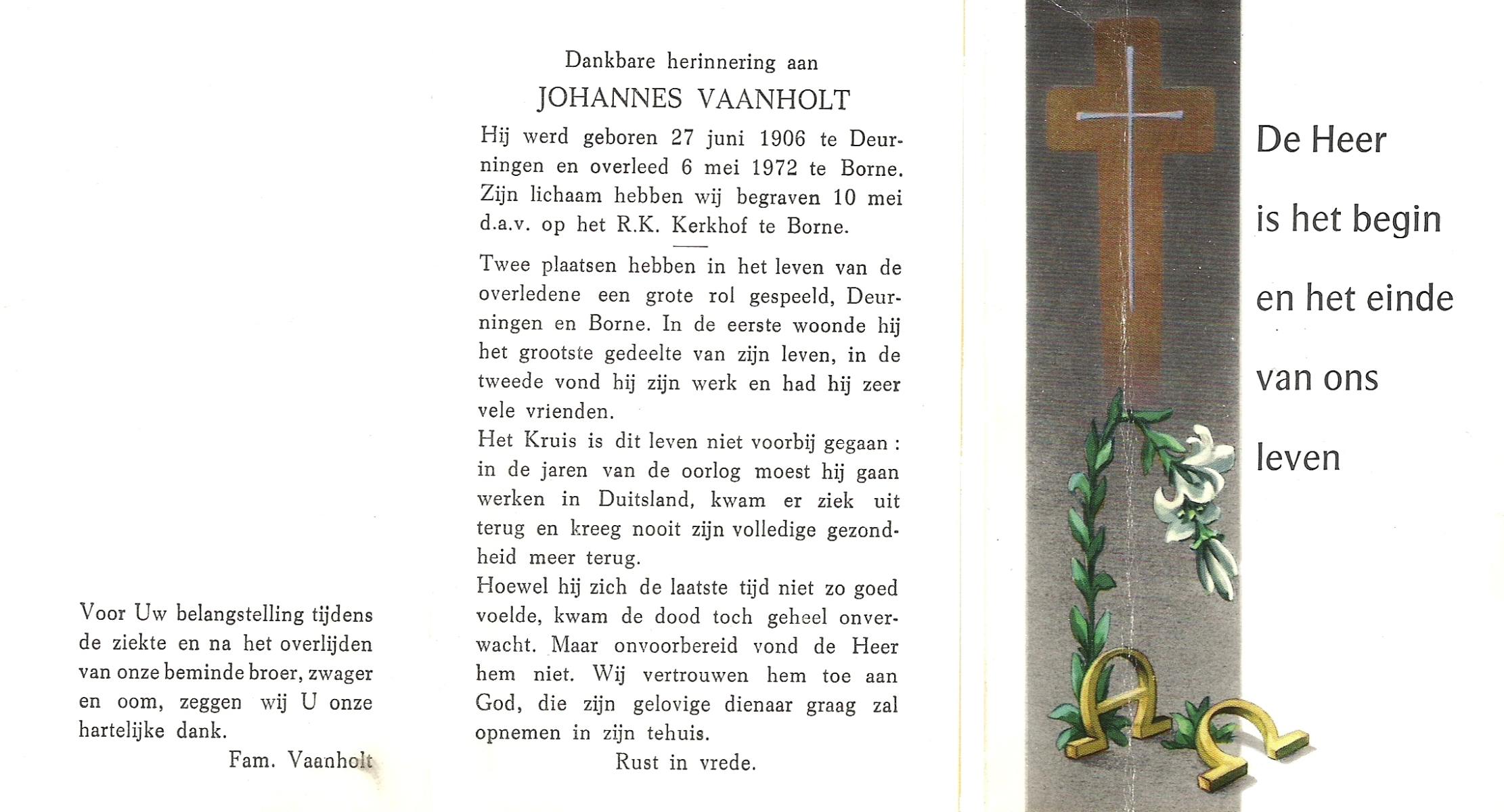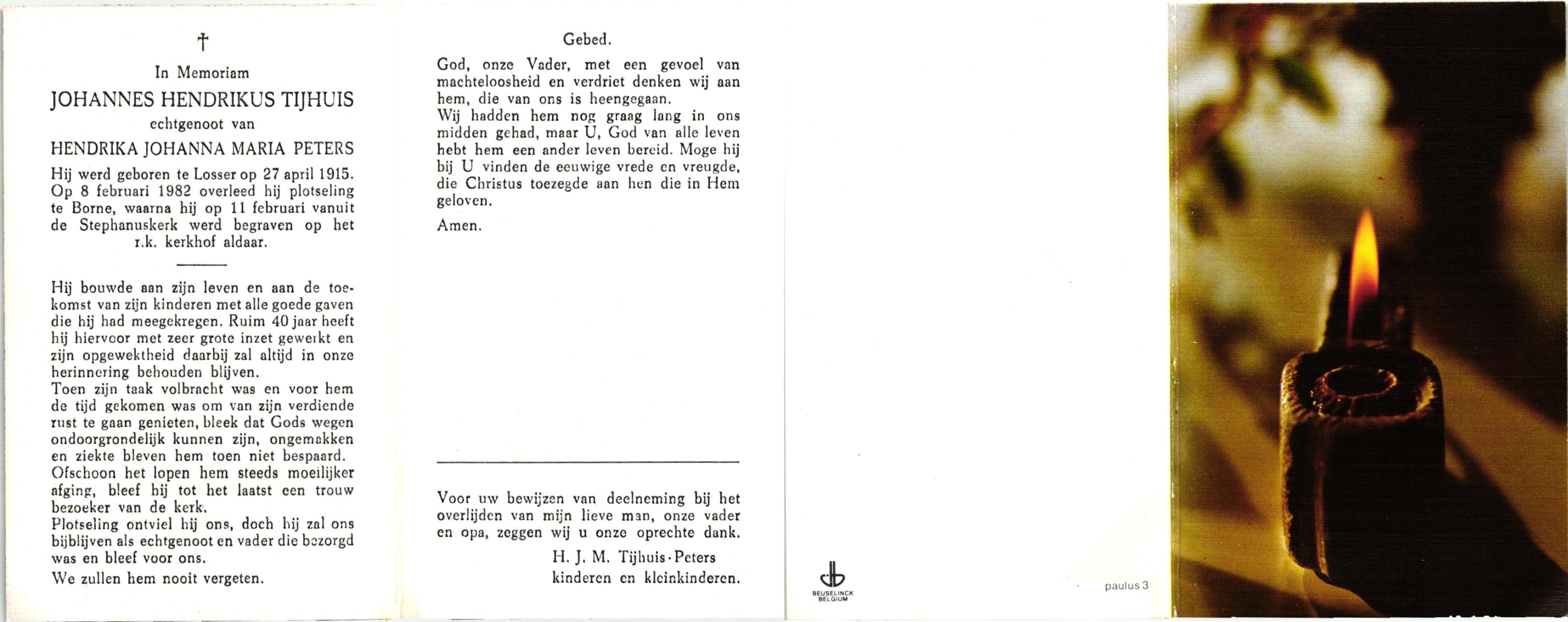 TIJHUIS, , Johannes Hendrikus, geboren op 27-4-1915 te Losser, overleden op 8-2-1982 te Borne op 66-jarige leeftijd, begraven op 11-2-1982 te Borne.