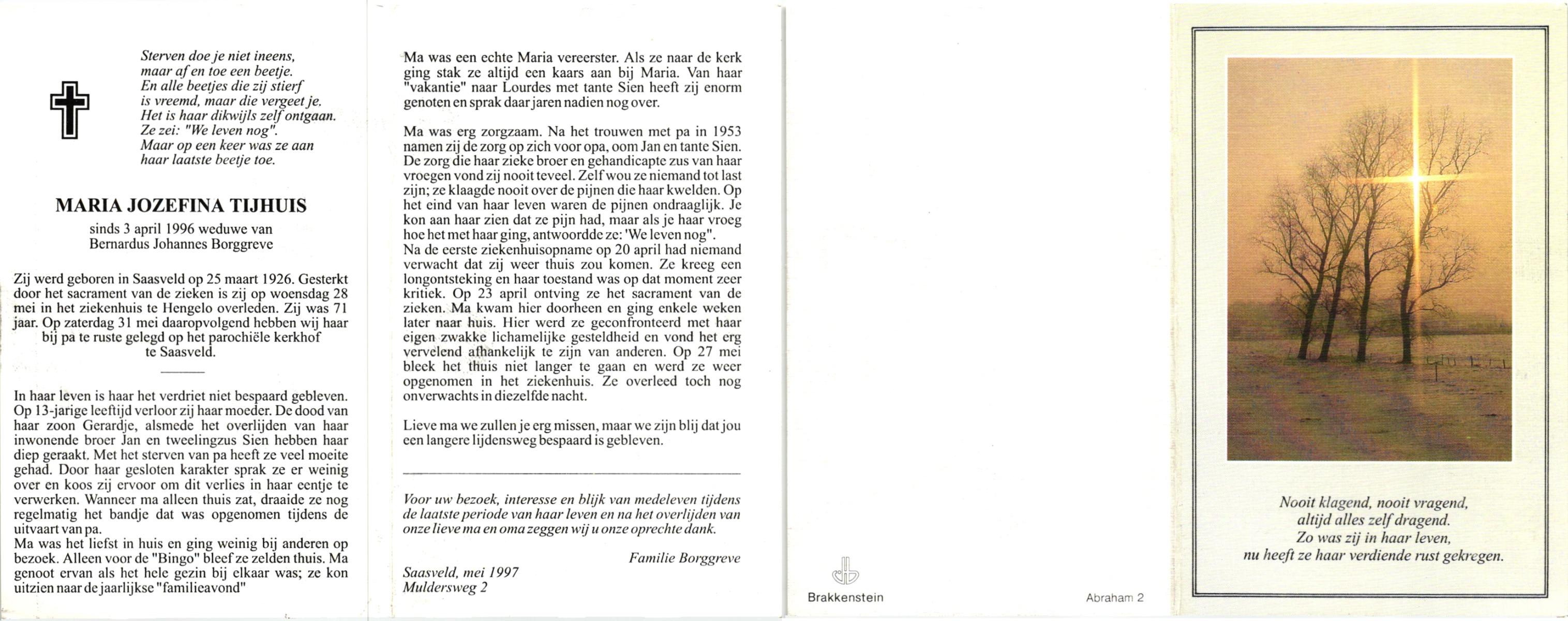 TIJHUIS, , Maria Jozefina, geboren op 25-3-1926 te Saasveld, overleden op 28-5-1997 te Hengelo (O) op 71-jarige leeftijd, begraven op 31-5-1997 te Saasveld.