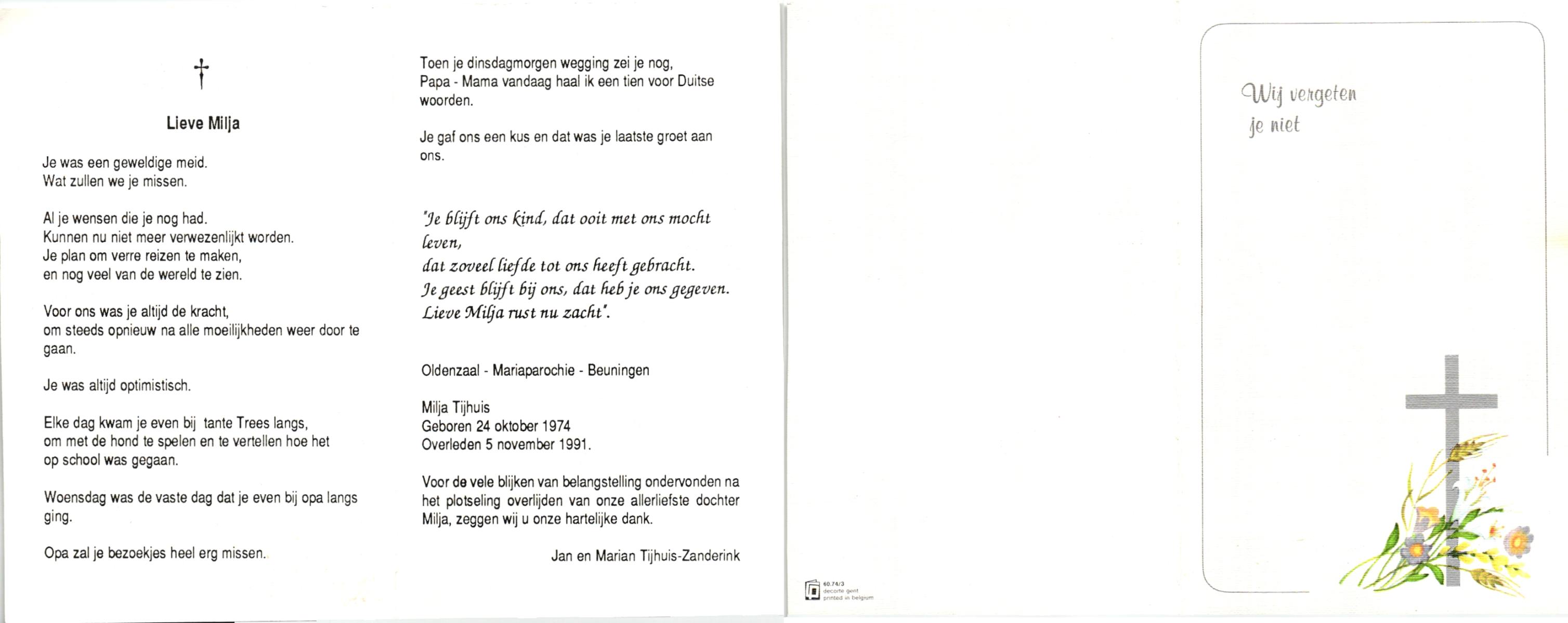 TIJHUIS, , Milja, geboren op 24-10-1974, overleden op 5-11-1991 op 17-jarige leeftijd.