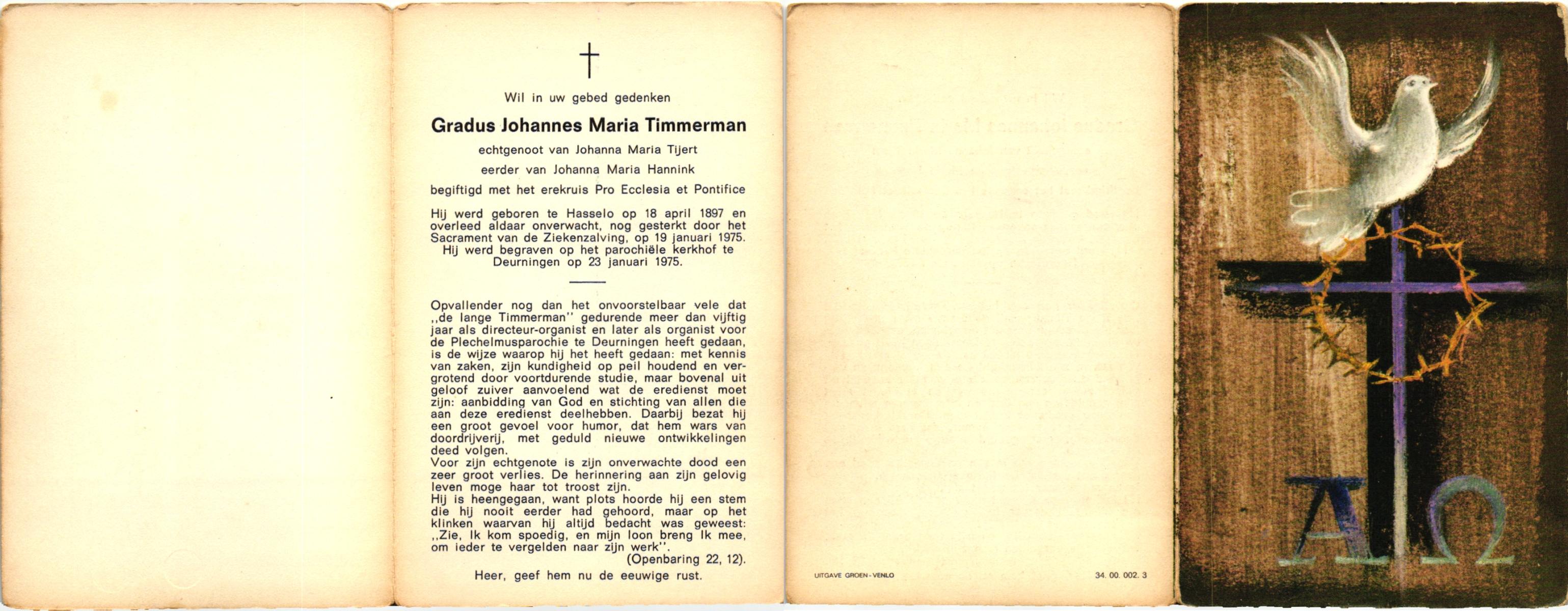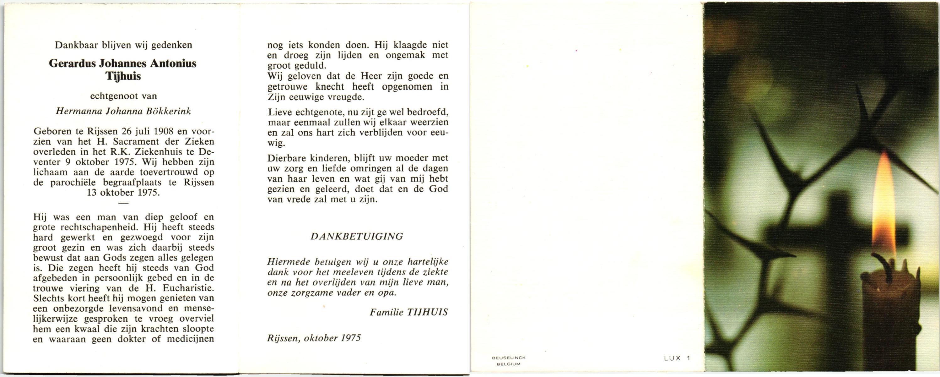 TIJHUIS, Gerhardus Johannes Antonius, geboren op 26-7-1908 te Rijssen, overleden op 9-10-1975 te Deventer, ziekenhuis op 67-jarige leeftijd, begraven op 13-10-1975 te Rijssen, rk.