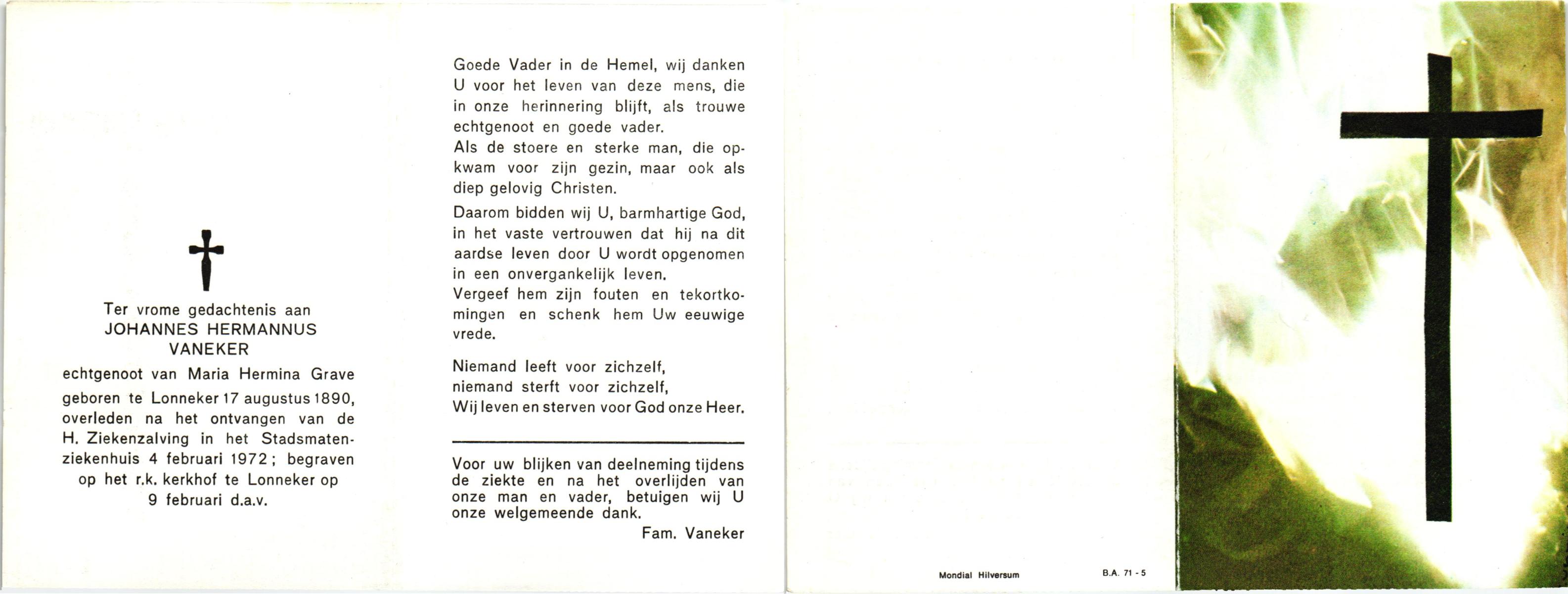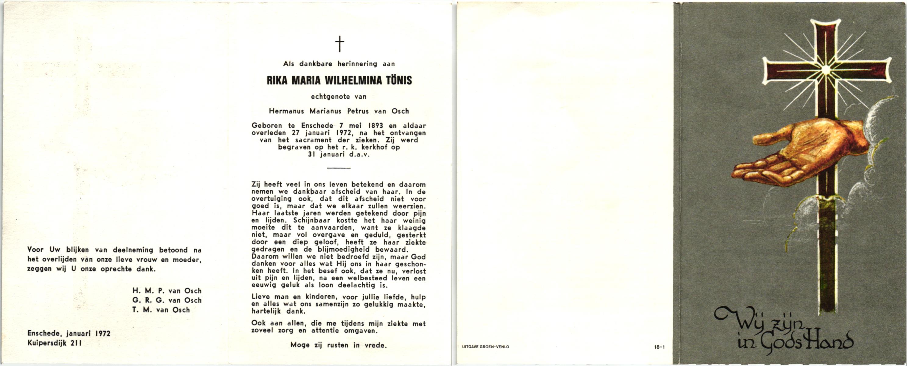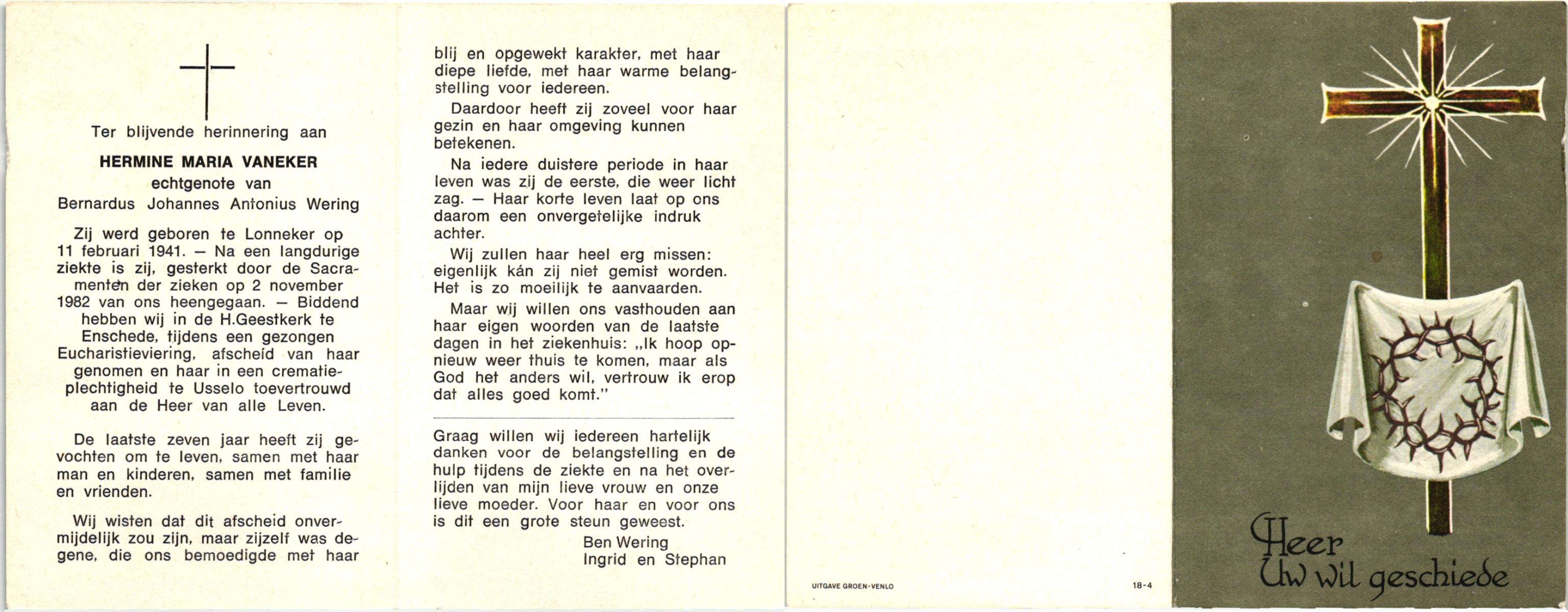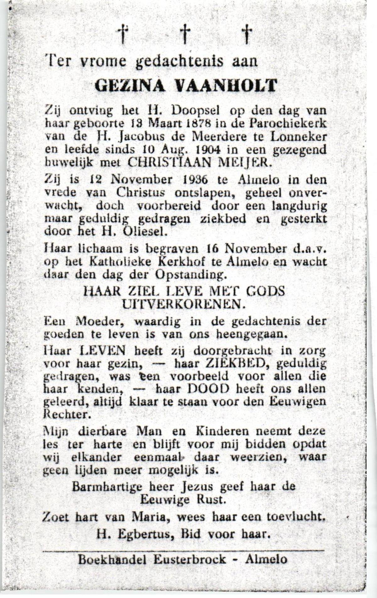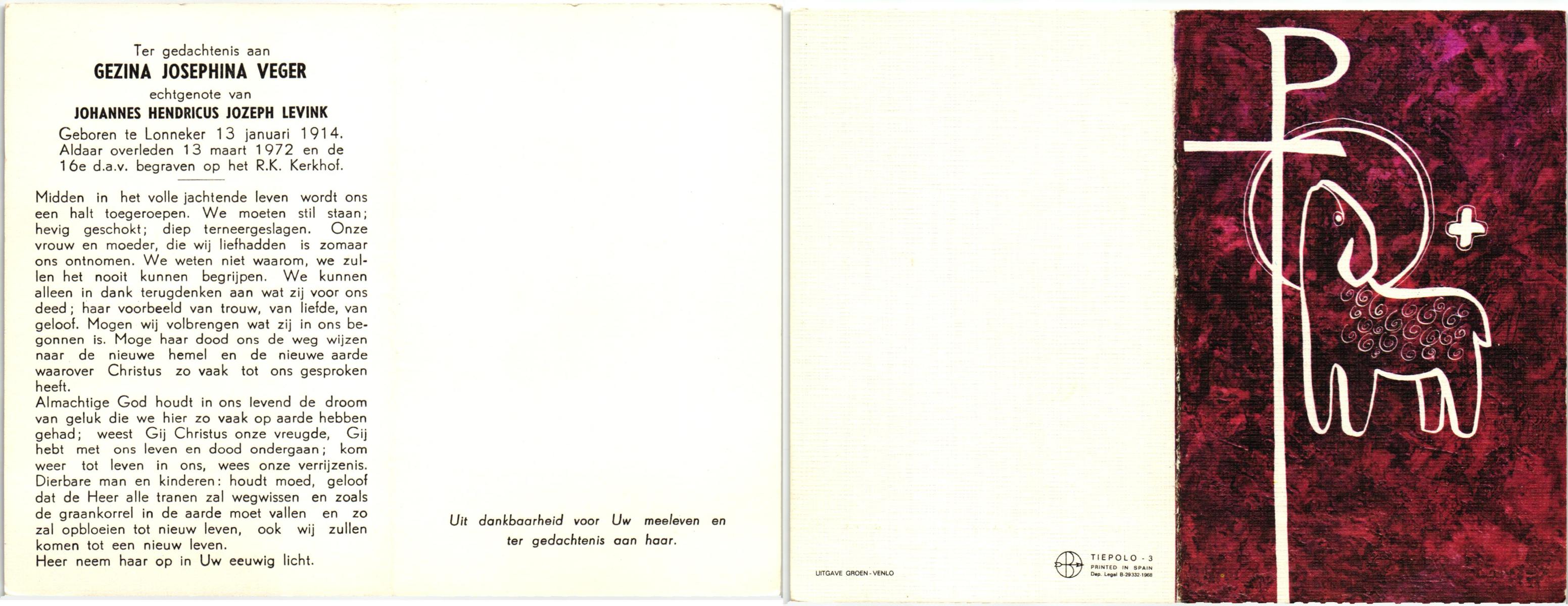 VEGER, Gezina Jozephina, geboren op 13-1-1914 te Lonneker, overleden op 13-3-1972 te Lonneker op 58-jarige leeftijd, begraven op 16-3-1972 te Lonneker.