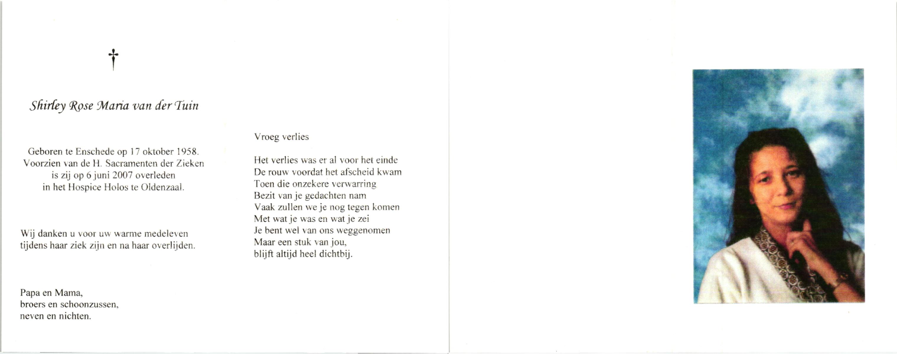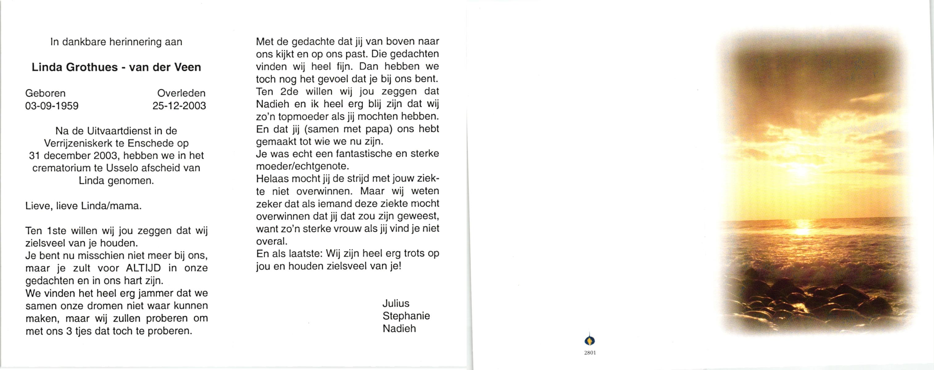 VEEN, van der, Linda, geboren op 3-9-1959, overleden op 25-12-2003 op 44-jarige leeftijd, gecremeerd op 31-12-2003 te Usselo.