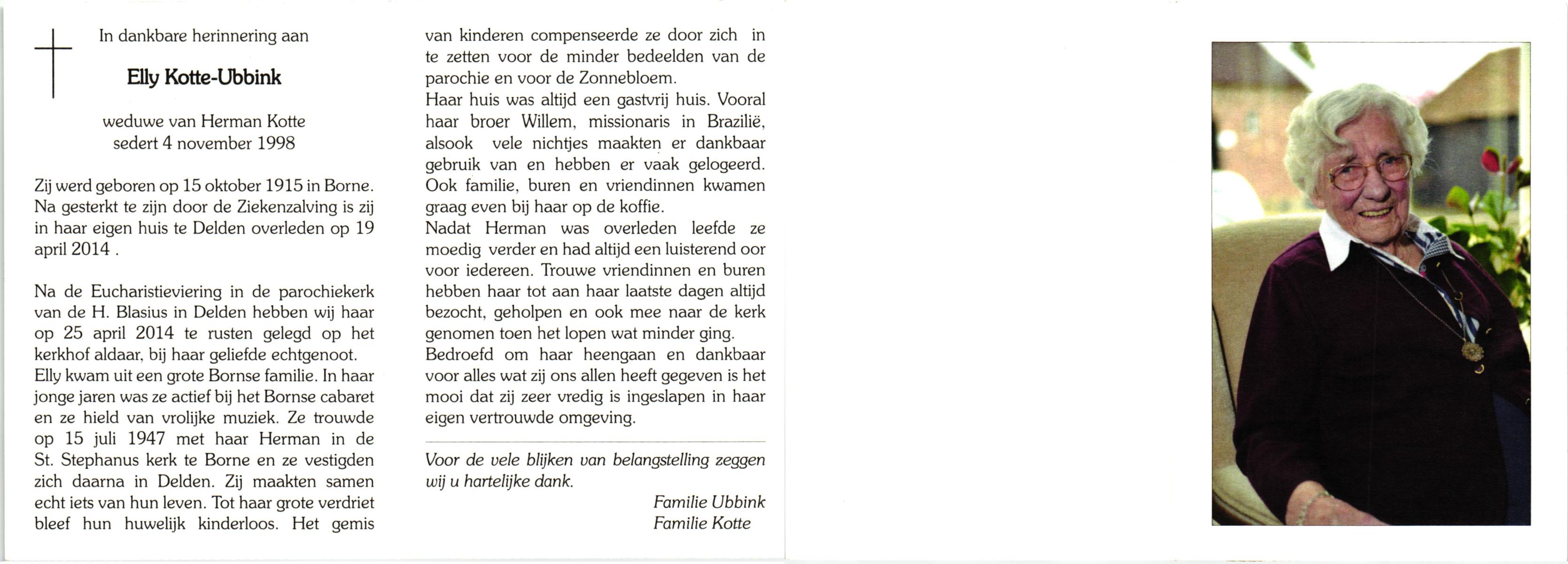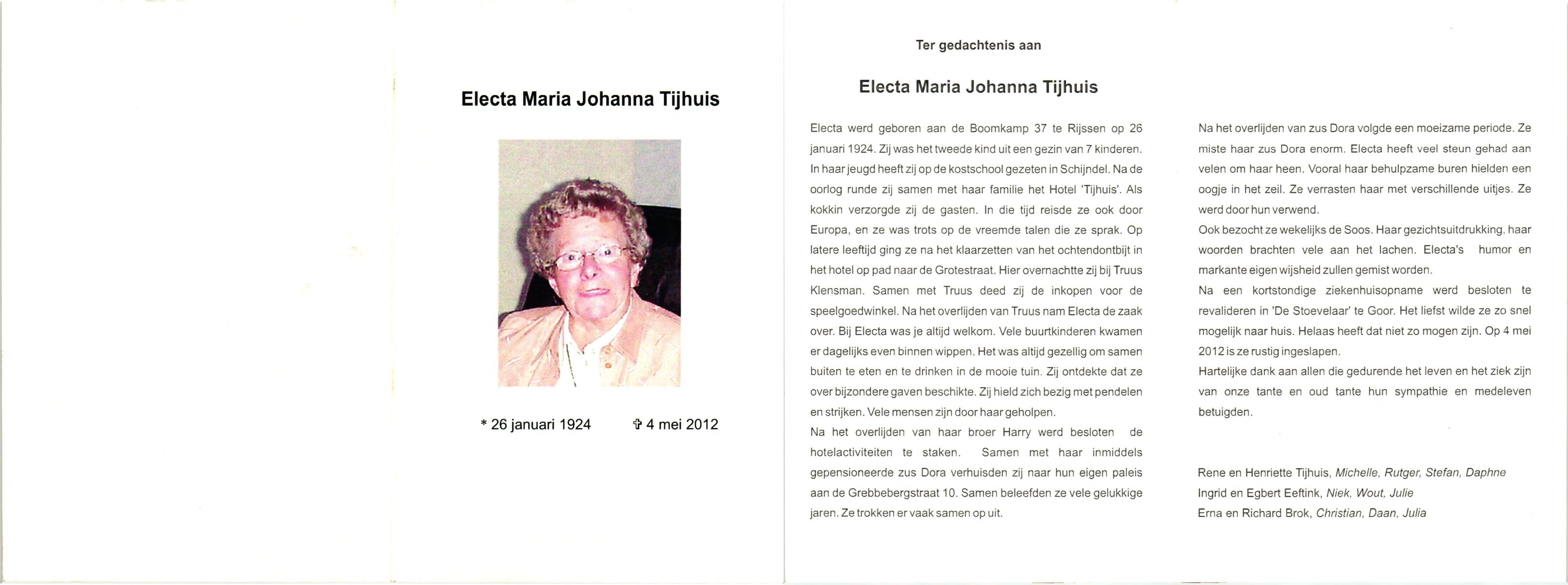 TIJHUIS, Electa Maria Johanna, geboren op 26-1-1924 te Rijssen, overleden op 4-5-2012 te Goor op 88-jarige leeftijd.