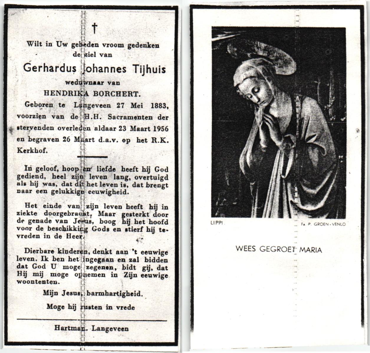 TIJHUIS, Gerhardus Johannes, geboren op 27-05-1883 te Langeveen, overleden op 23-3-1956 te Langeveen op 72-jarige leeftijd, begraven op 26-3-1956 te Langeveen.