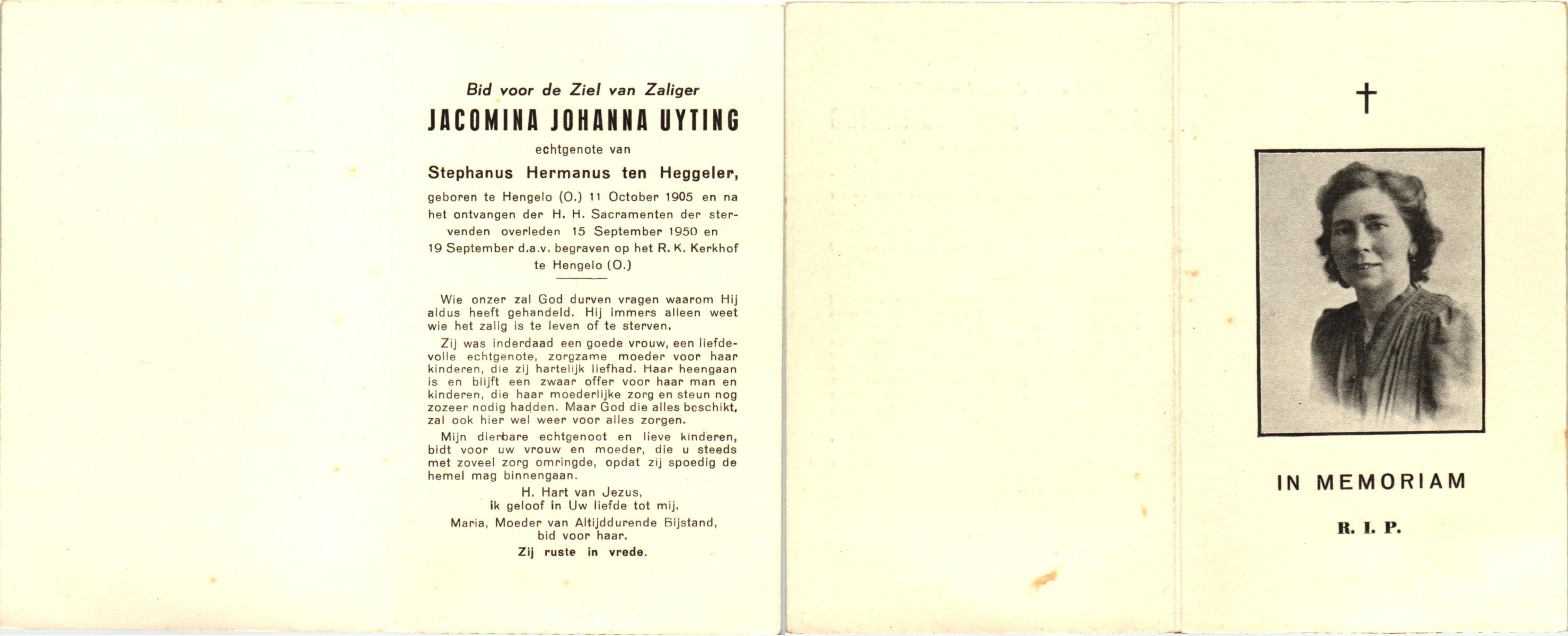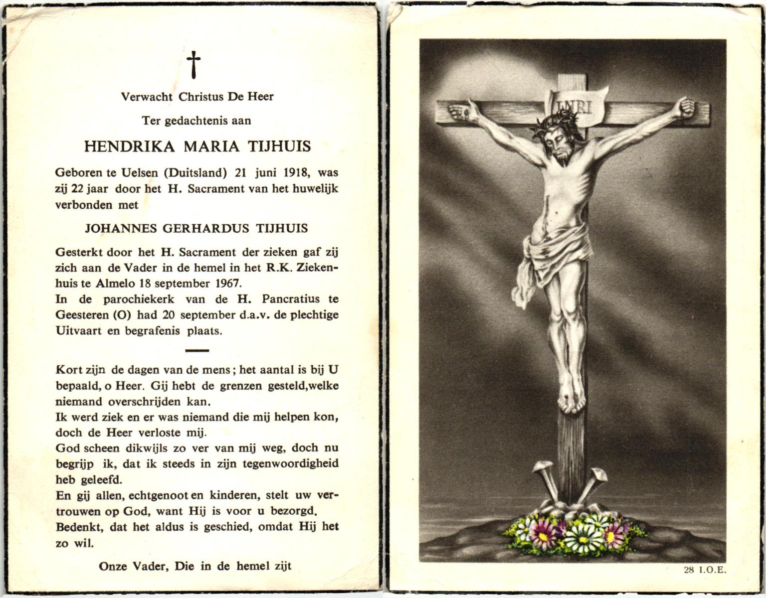 TIJHUIS, Hendrika Maria, geboren op 21-6-1918 te Uelsen, Dld, overleden op 18-9-1967 te Almelo, ziekenhuis op 49-jarige leeftijd, begraven op 20-9-1967 te Geesteren.