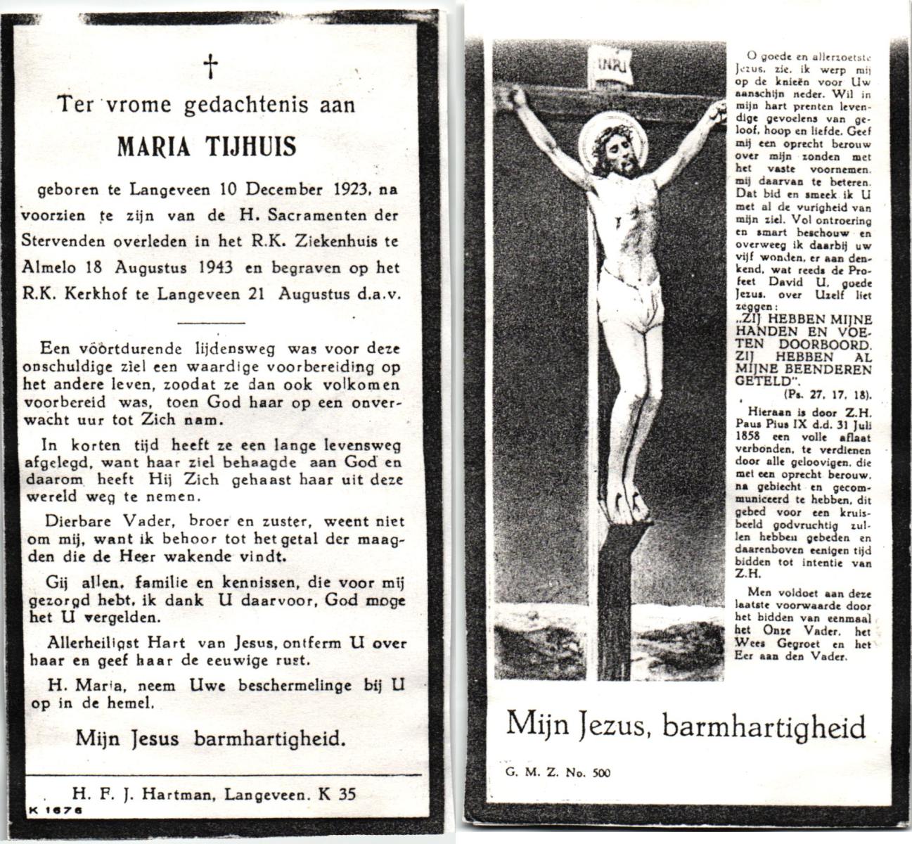 TIJHUIS, Maria, geboren op 10-12-1923 te Langeveen, overleden op 18-8-1943 te Almelo, ziekenhuis op 19-jarige leeftijd, begraven op 21-8-1943 te Langeveen.