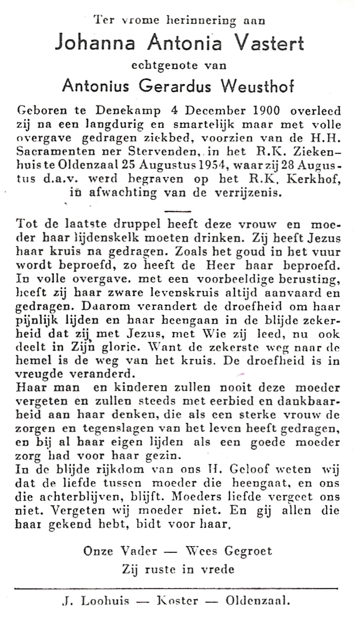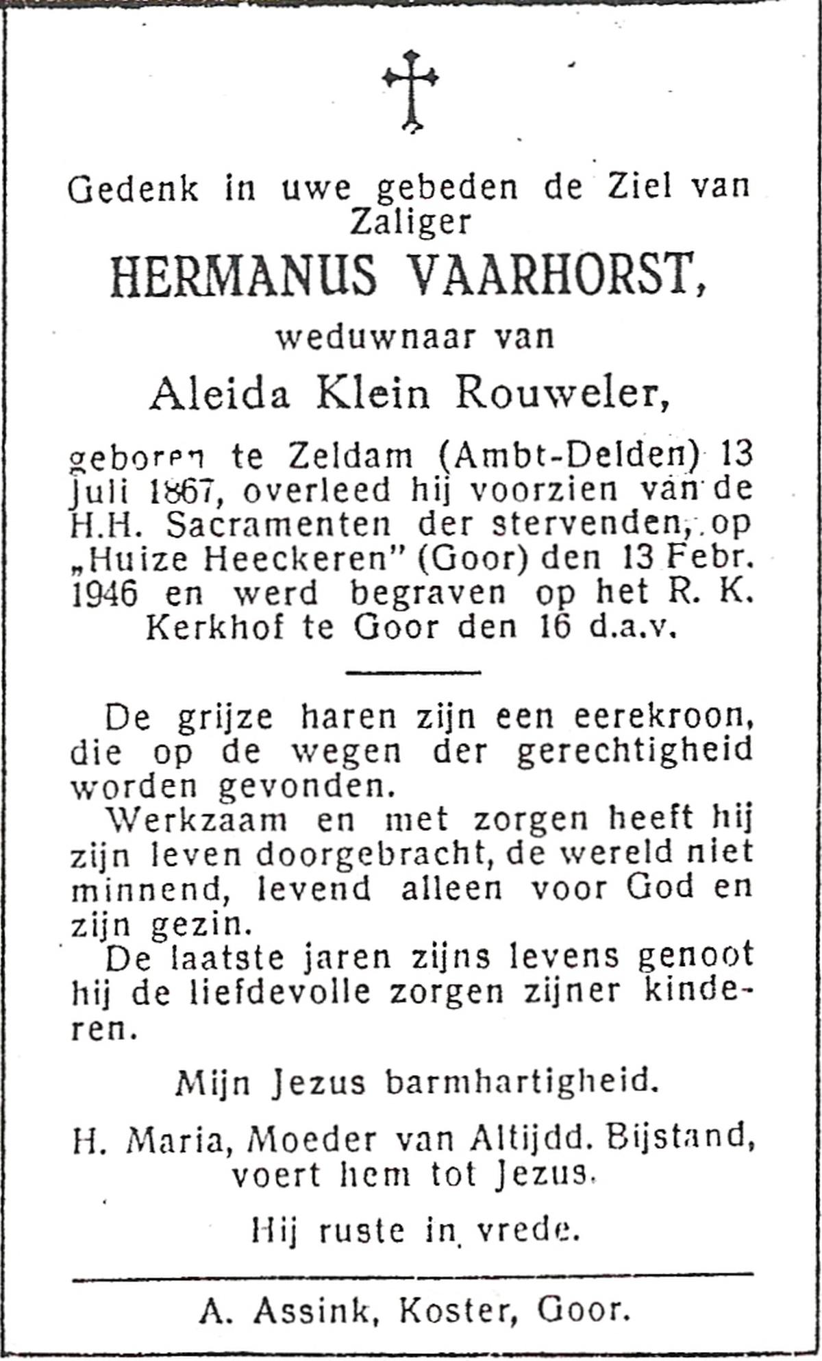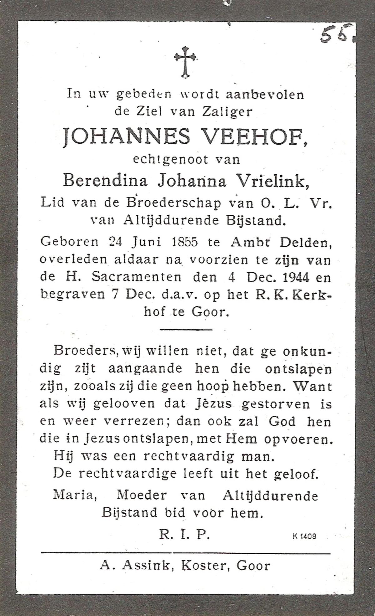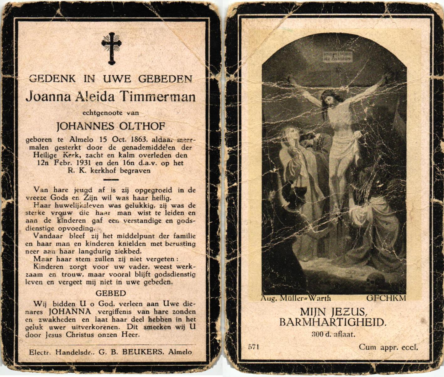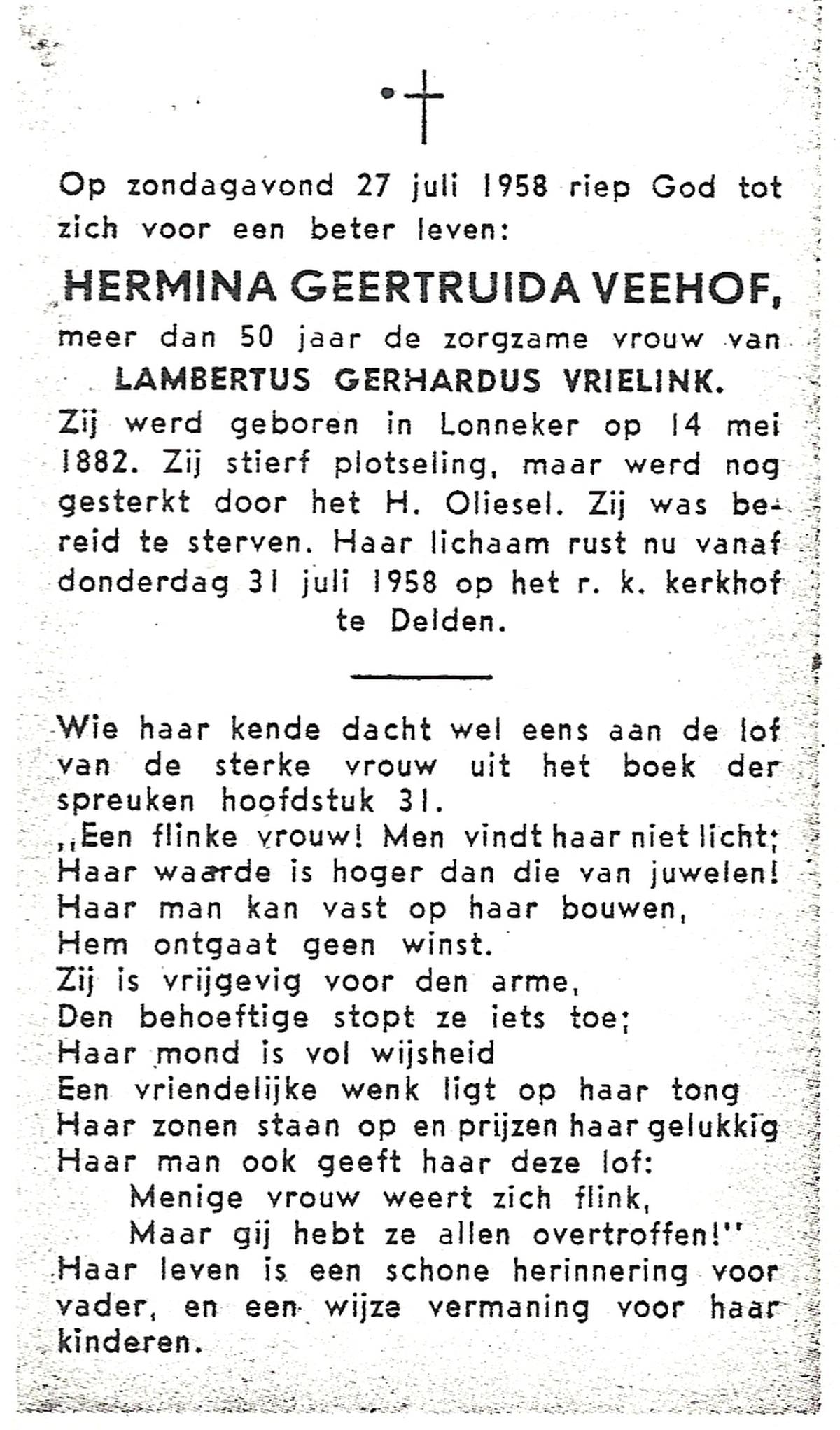 VEHOF, Aleida, geboren op 19-08-1866 te Zeldam, overleden op 4-8-1954 te Bentelo op 87-jarige leeftijd, begraven op 7-8-1954 te Delden.