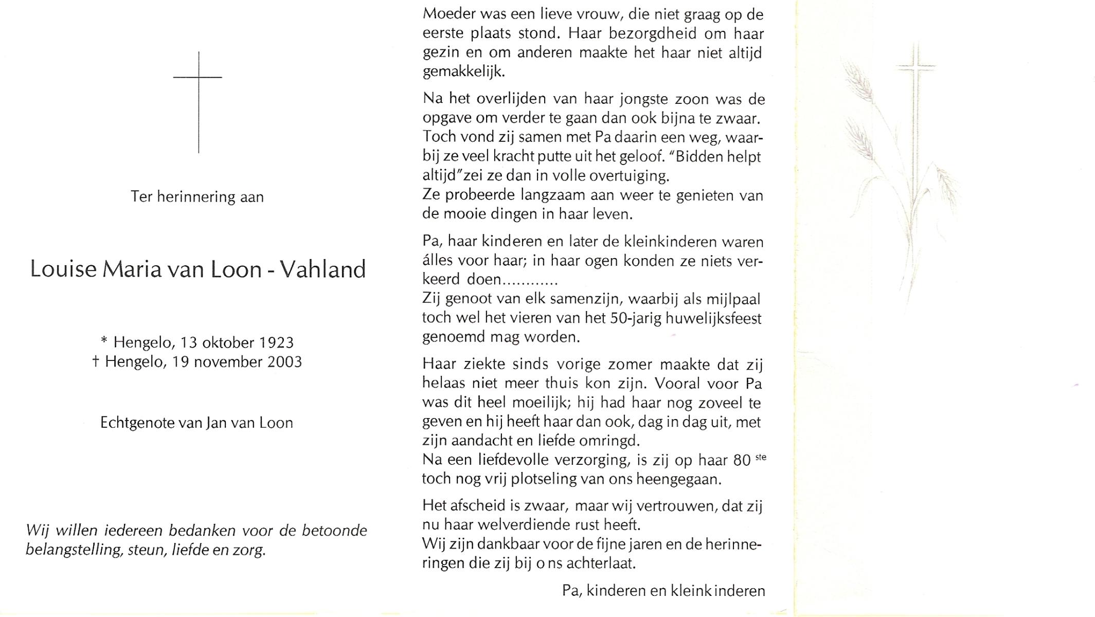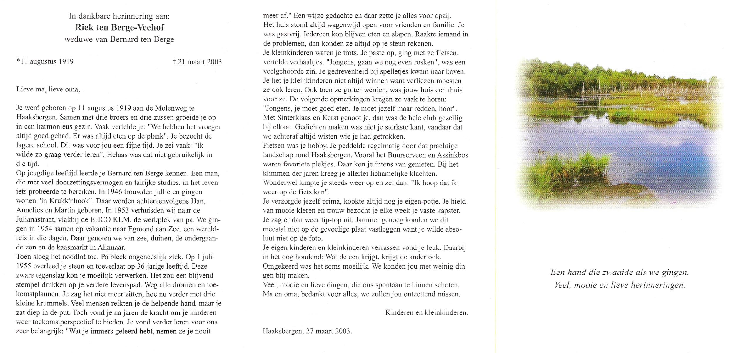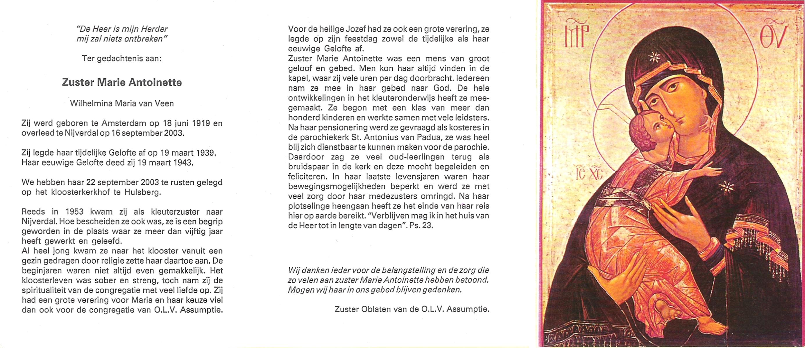 VEEN, van, Wilhelmina Maria, geboren op 18-6-1919 te Amsterdam, overleden op 16-9-2003 te Hellendoorn, Nijverdal op 84-jarige leeftijd, begraven op 22-9-2003 te Hulsberg.