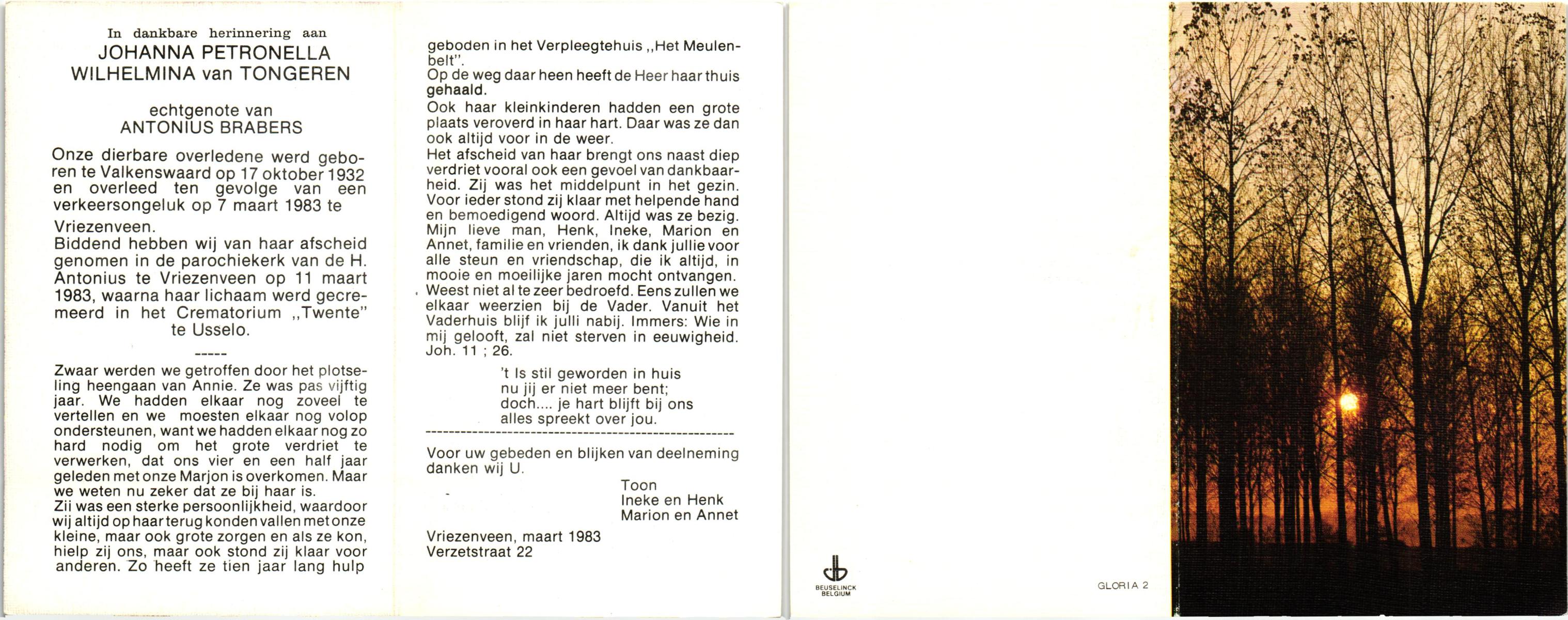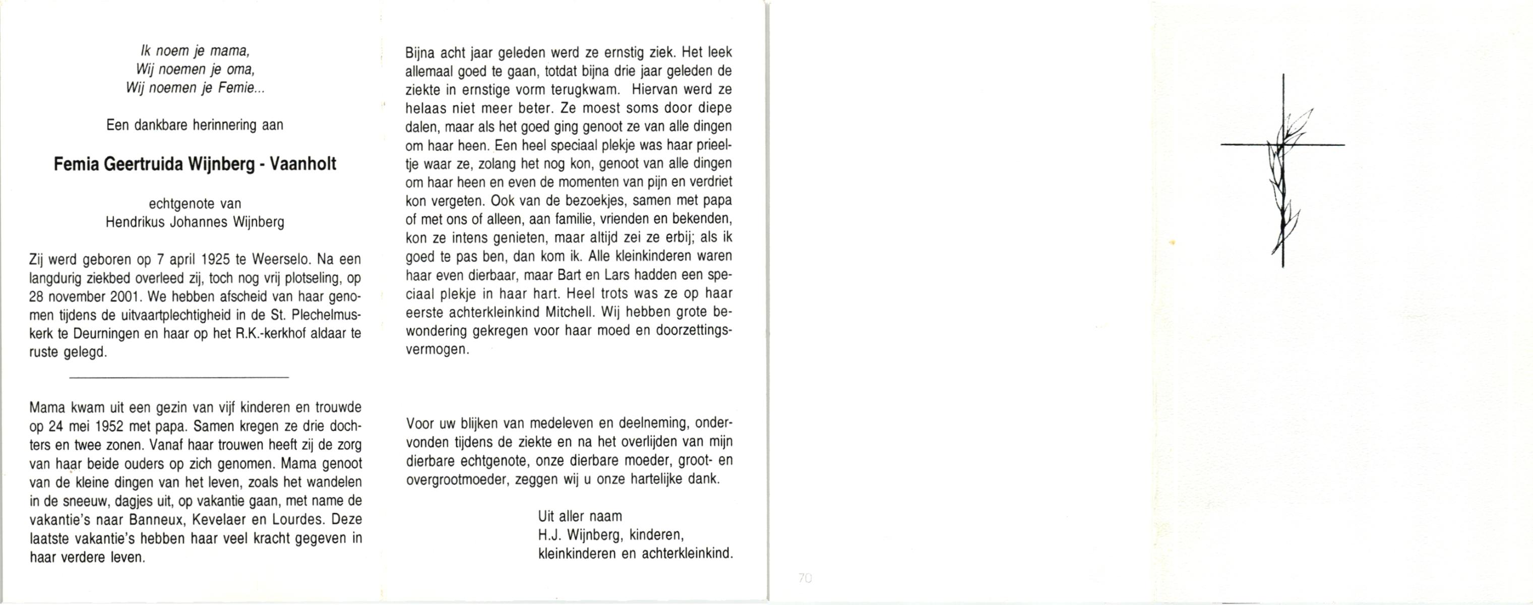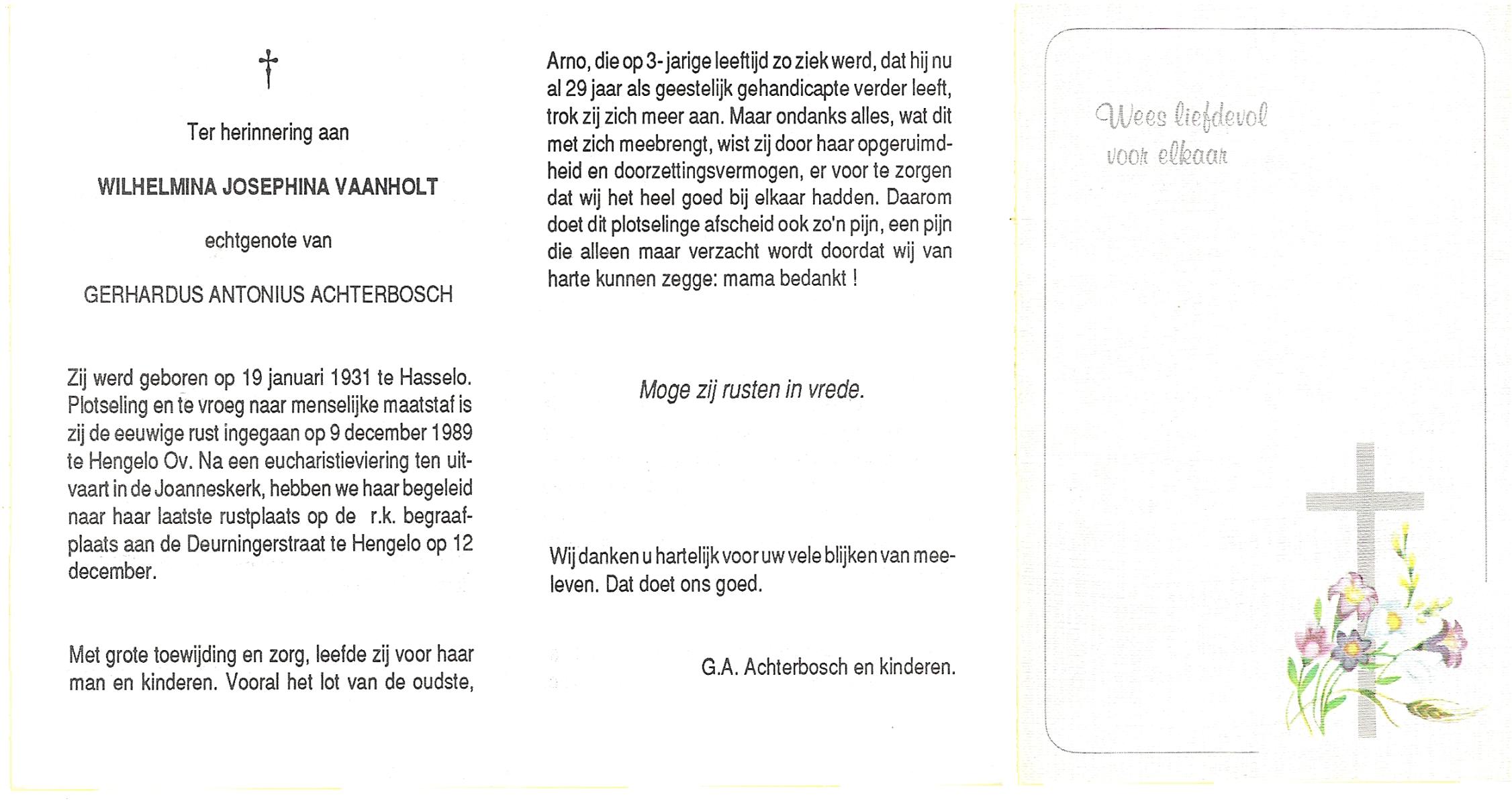 VEEN, van, Wilhelmina Maria, geboren op 18-6-1919 te Amsterdam, overleden op 16-9-2003 te Hellendoorn, Nijverdal op 84-jarige leeftijd, begraven op 22-9-2003 te Hulsberg.