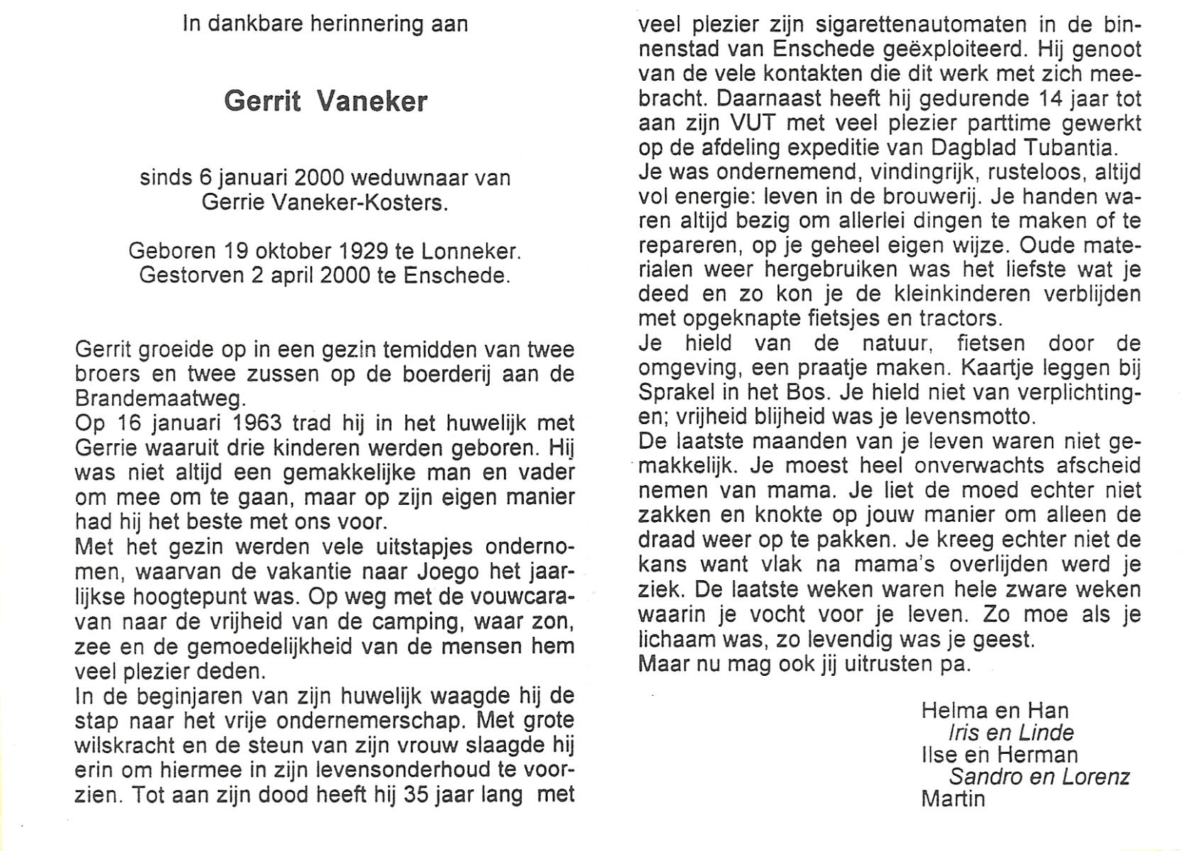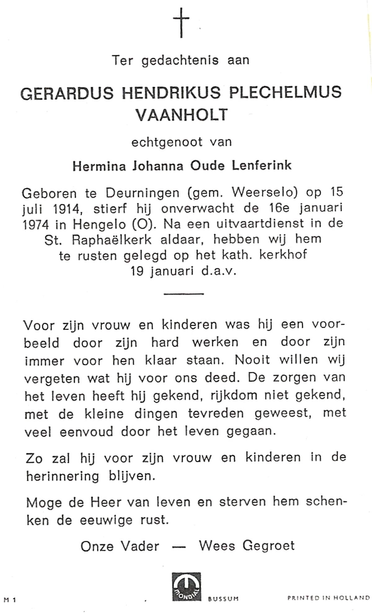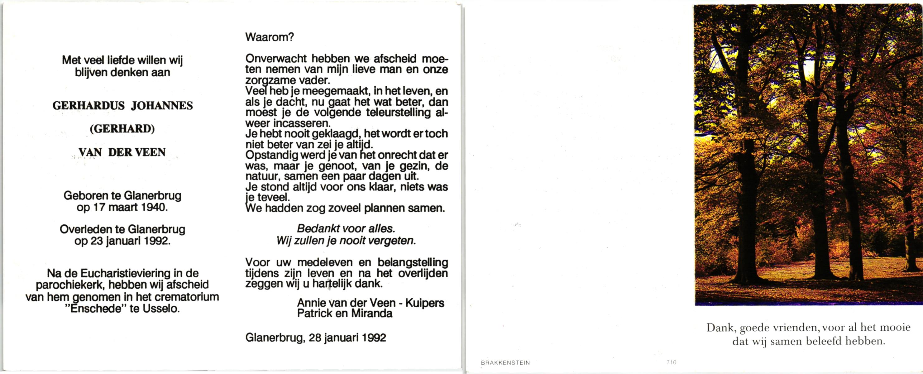 VEEN, van, Gerhardus Johannes (Gerhard), geboren op 17-3-1940 te Glanerbrug, overleden op 23-1-1992 te Glanerbrug op 51-jarige leeftijd, gecremeerd te Usselo.