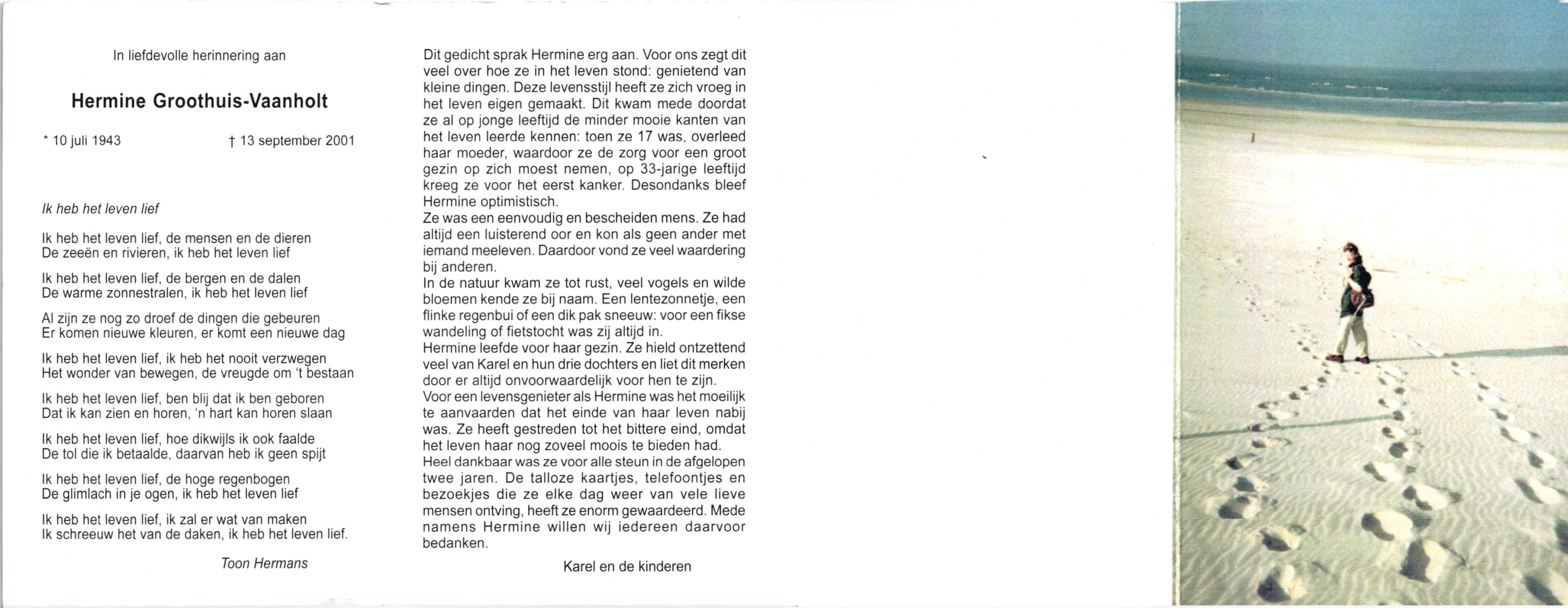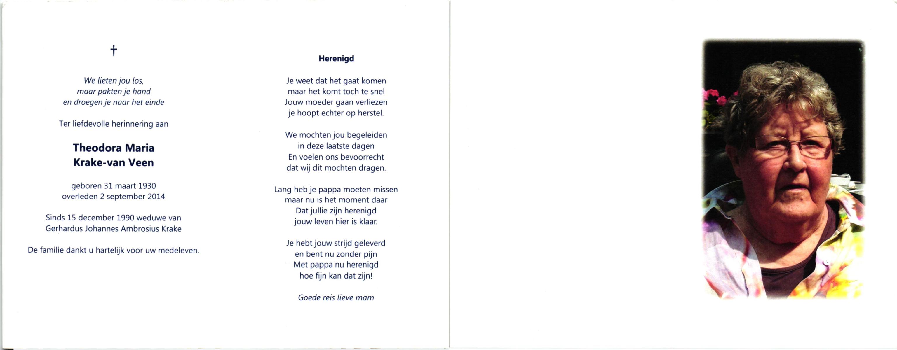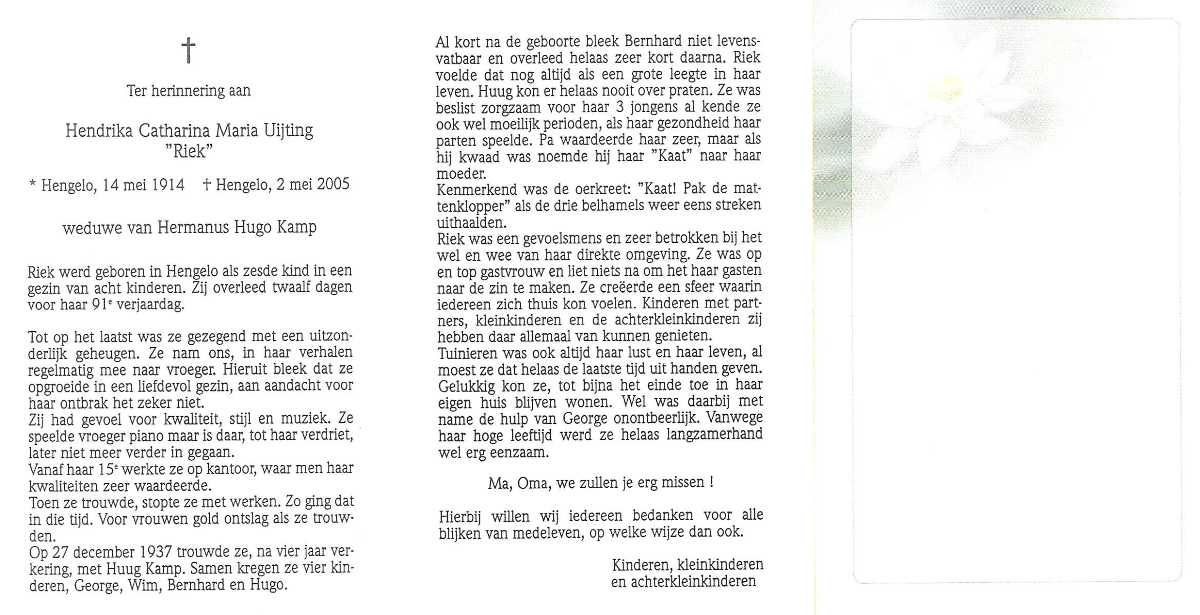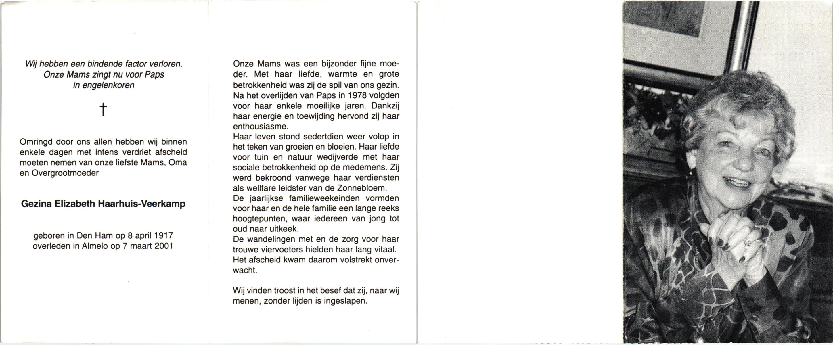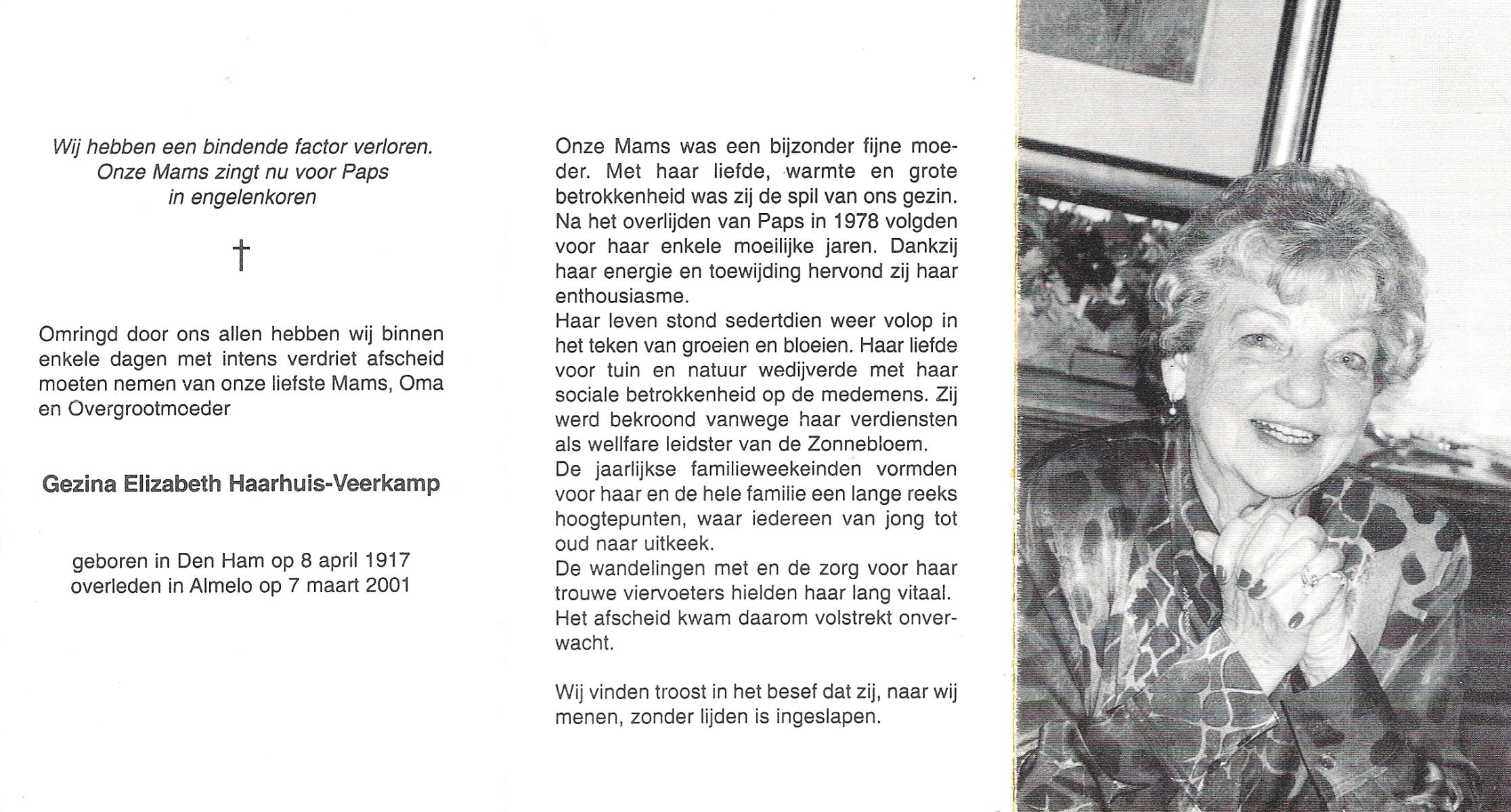 VEERKAMP, Gezina Elizabeth, geboren op 8-4-1917 te Den Ham, overleden op 7-3-2001 te Almelo op 83-jarige leeftijd.