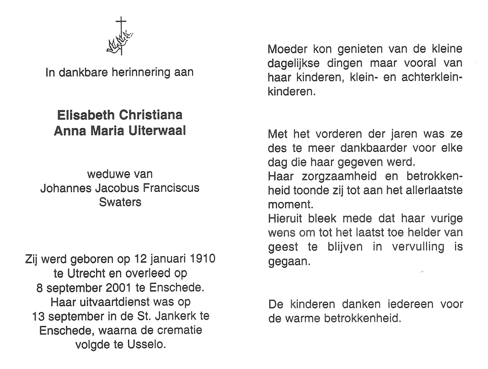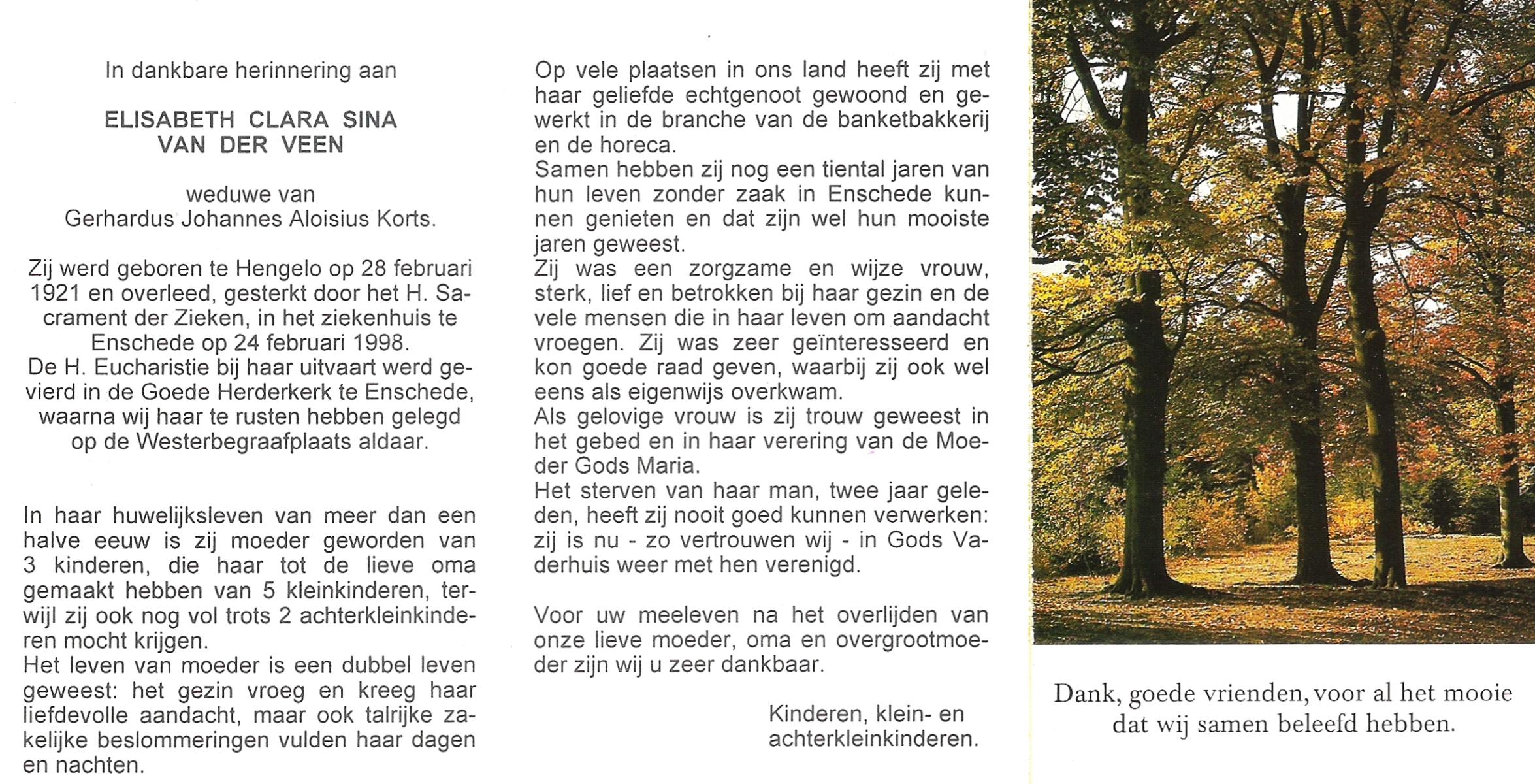 VEEN, van der, Elisabeth Clara Sina, geboren op 28-2-1921 te Hengelo (O), overleden op 24-2-1998 te Enschede op 76-jarige leeftijd, begraven te Enschede.