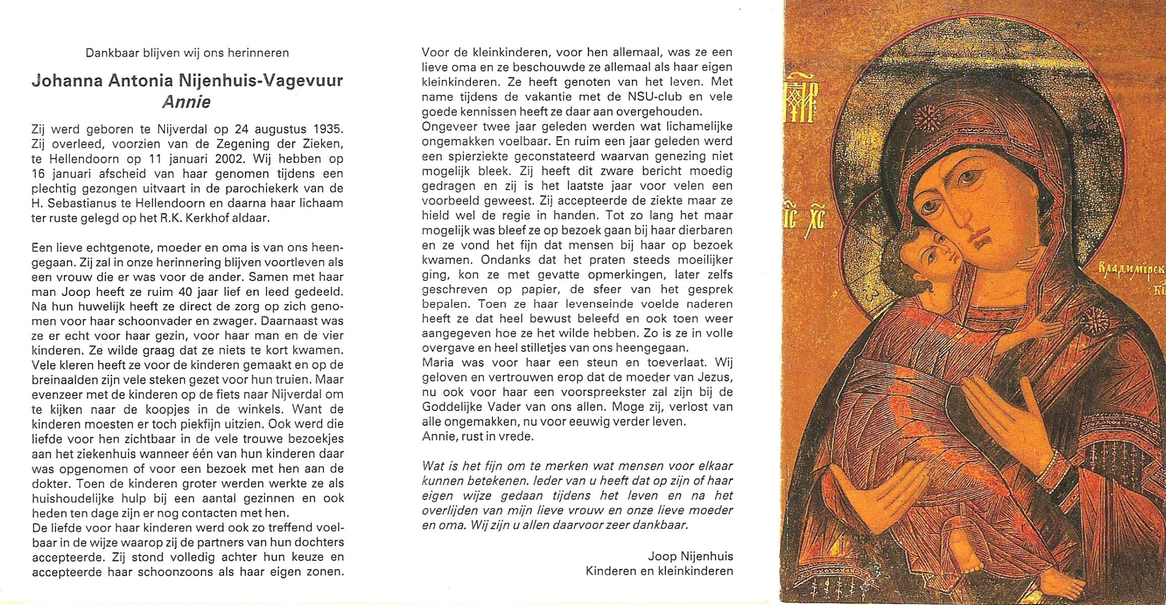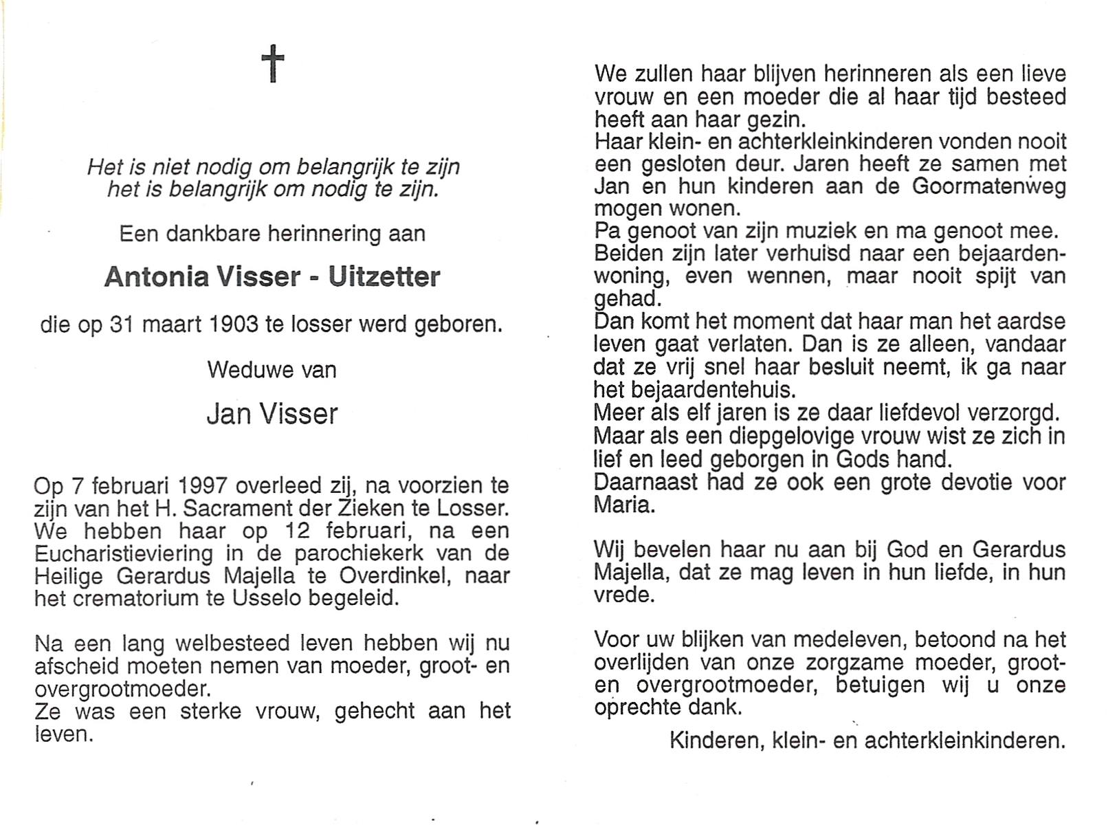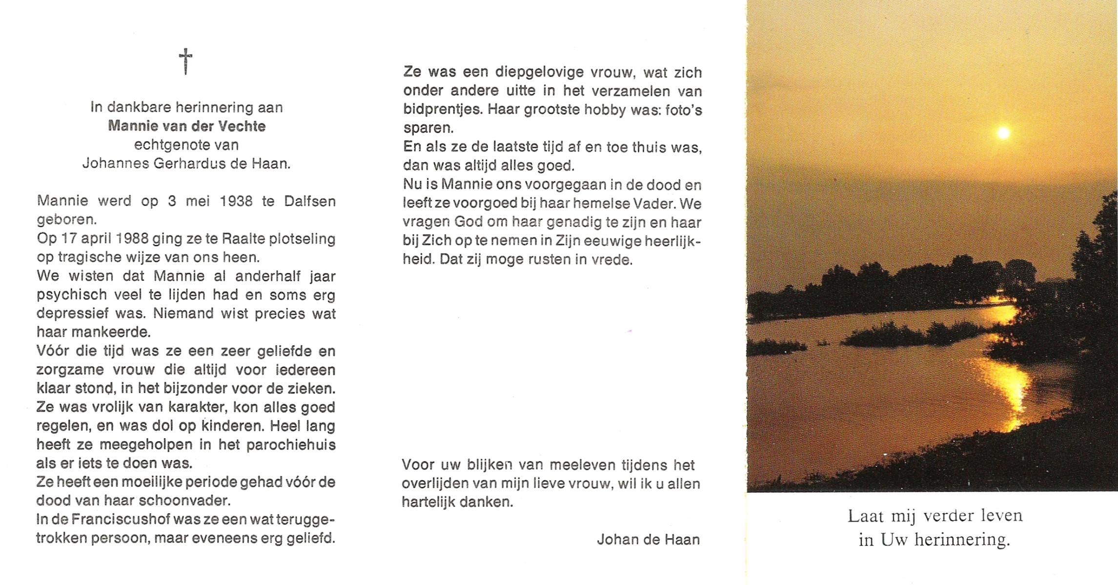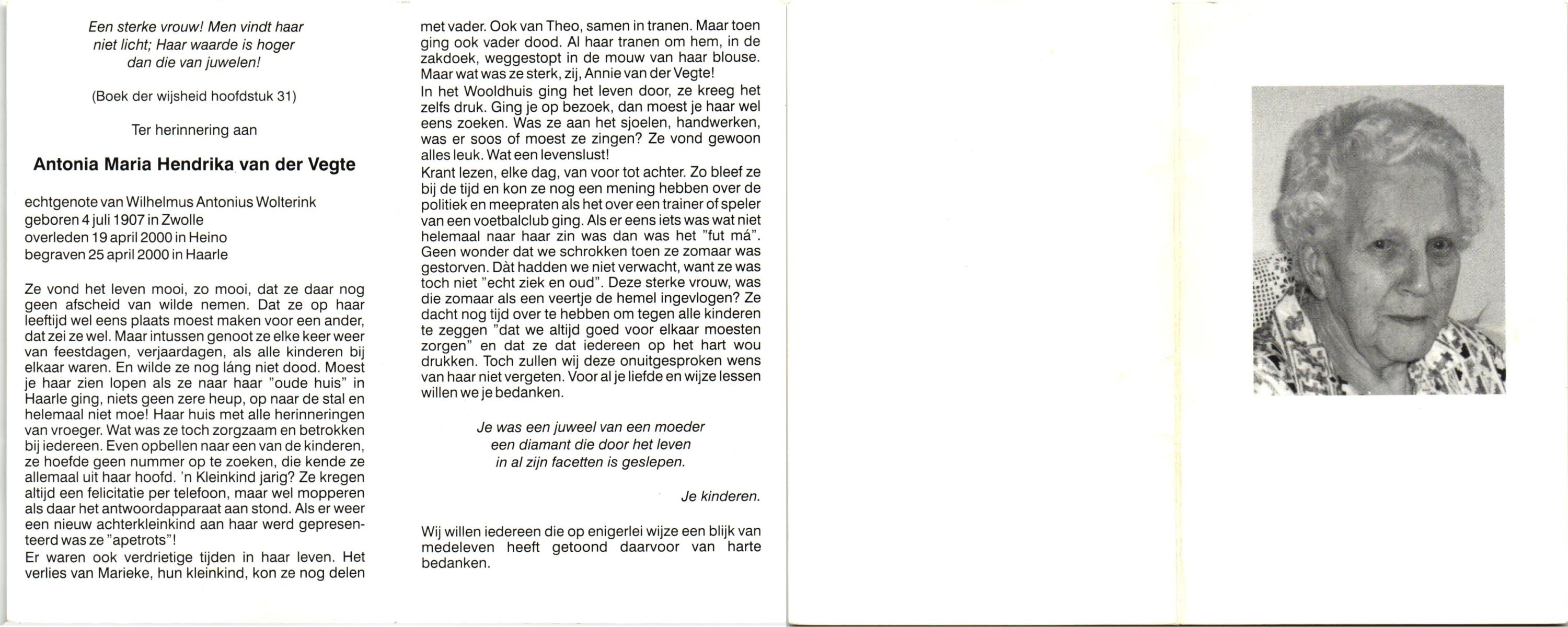VEGTE, van der, Antonia Maria Hendrika, geboren op 4-7-1907 te Zwolle, overleden op 19-4-2000 te Heino op 92-jarige leeftijd, begraven op 25-4-2000 te Hellendoorn, Haarle.