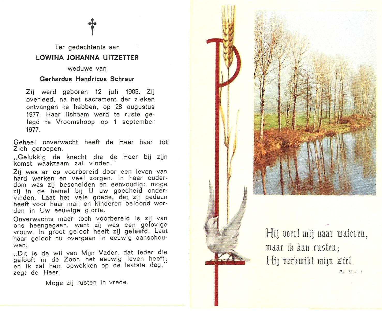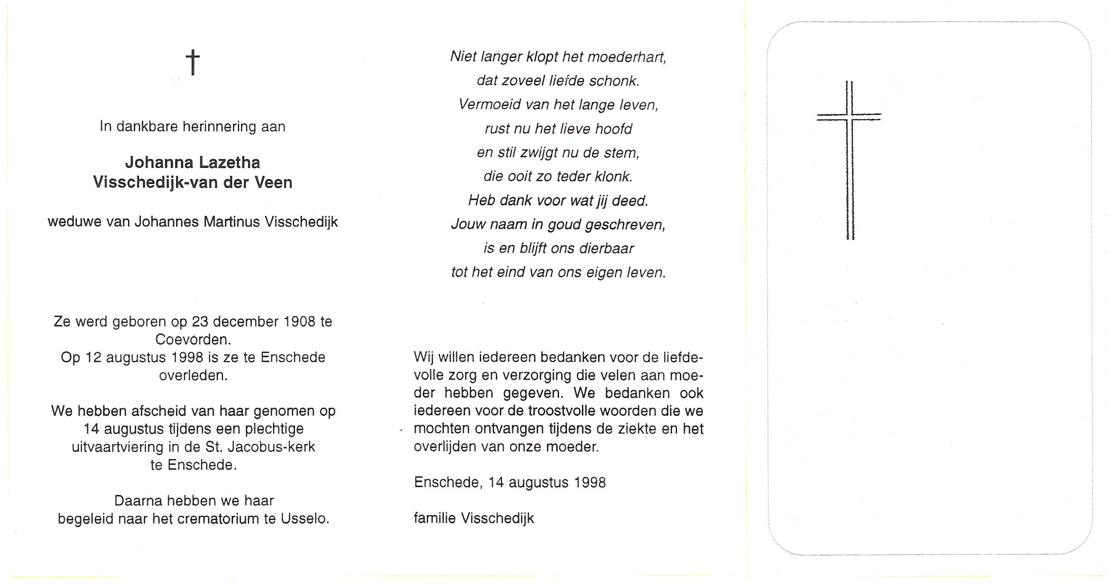 VEEN, van der, Johanna Lazetha, geboren op 23-12-1908 te Coevorden, overleden op 12-8-1998 te Enschede op 89-jarige leeftijd, gecremeerd op 14-8-1998 te Usselo.