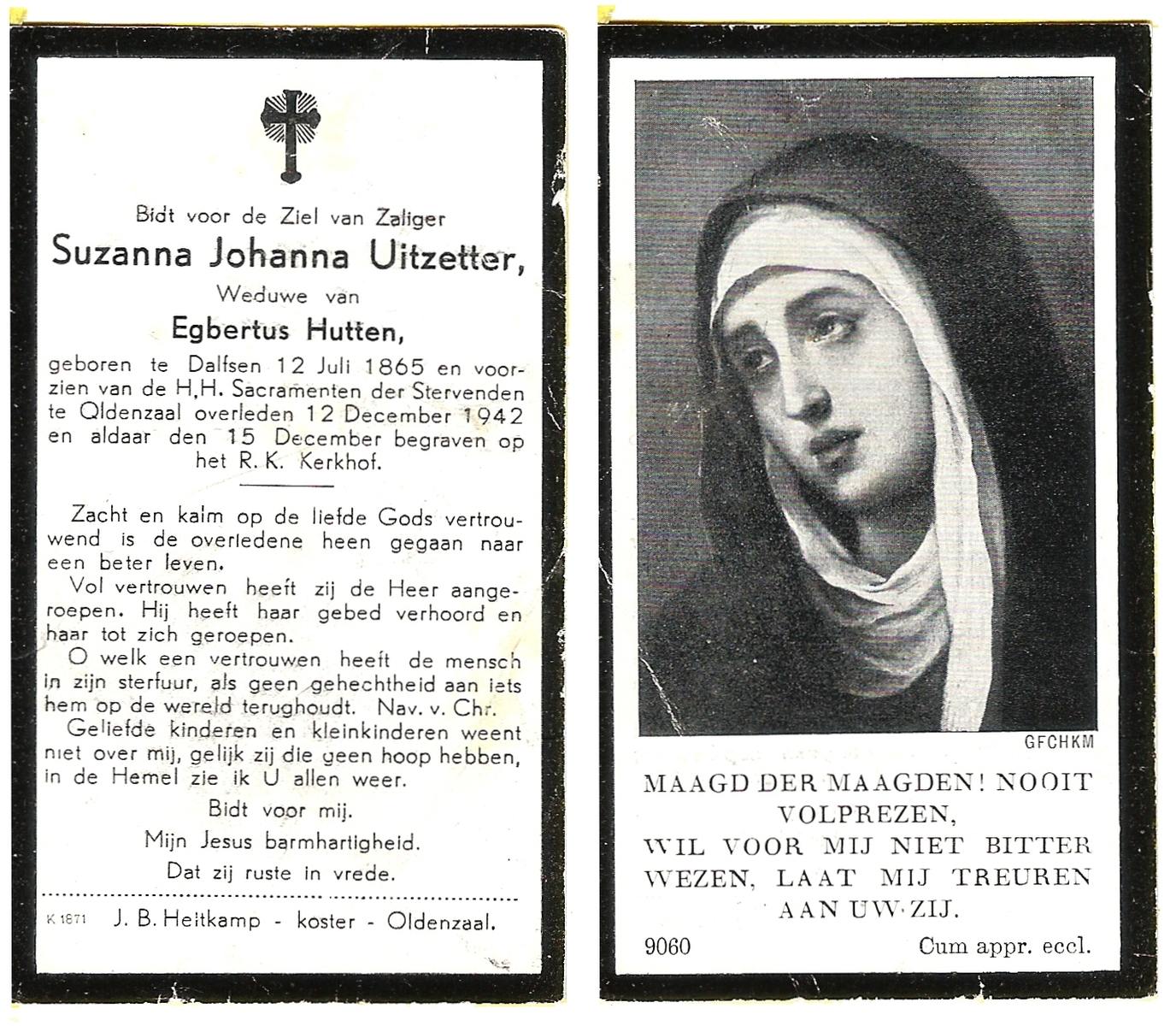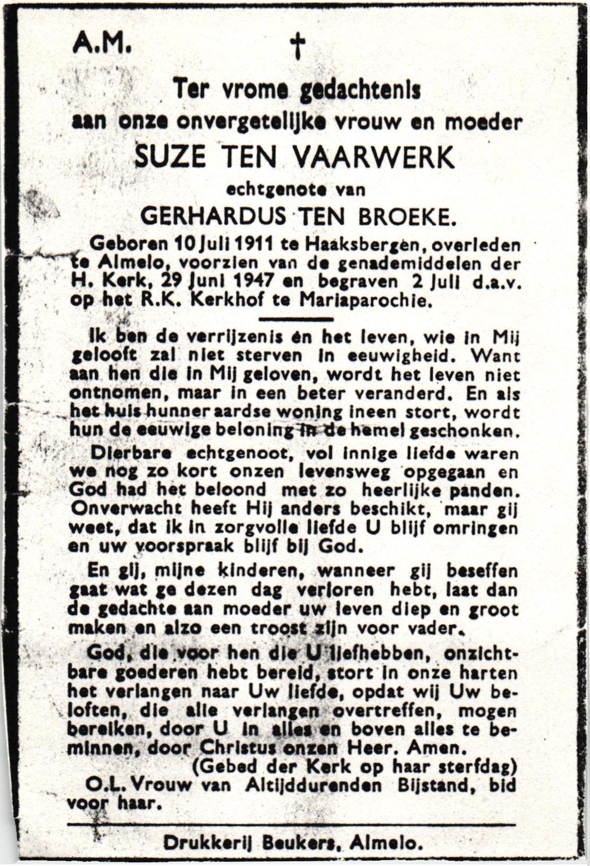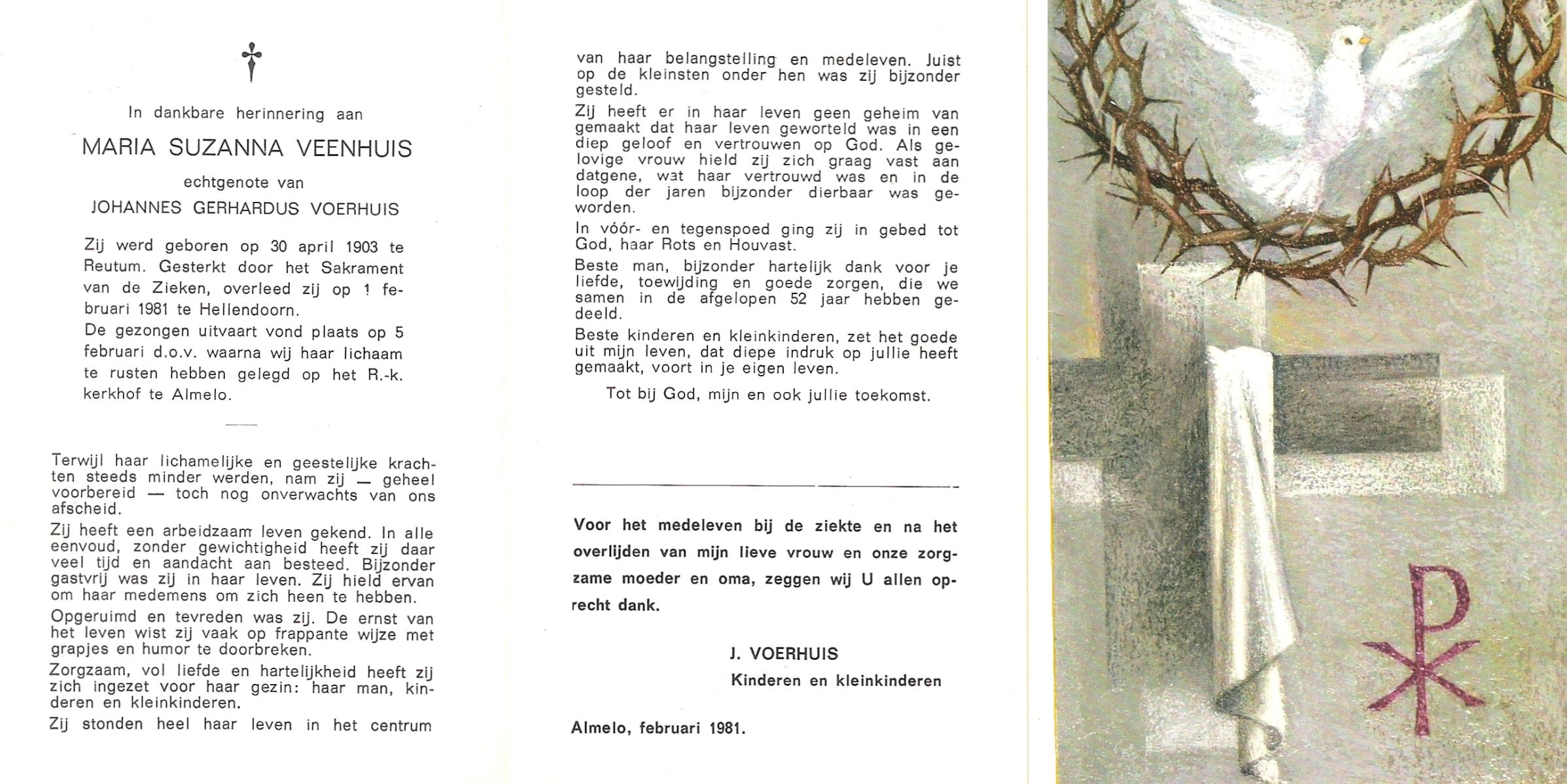 VEENHUIS, Maria Suzanna, geboren op 30-4-1903 te Reutum, overleden op 1-2-1981 te Hellendoorn op 77-jarige leeftijd, begraven op 5-2-1981 te Almelo.