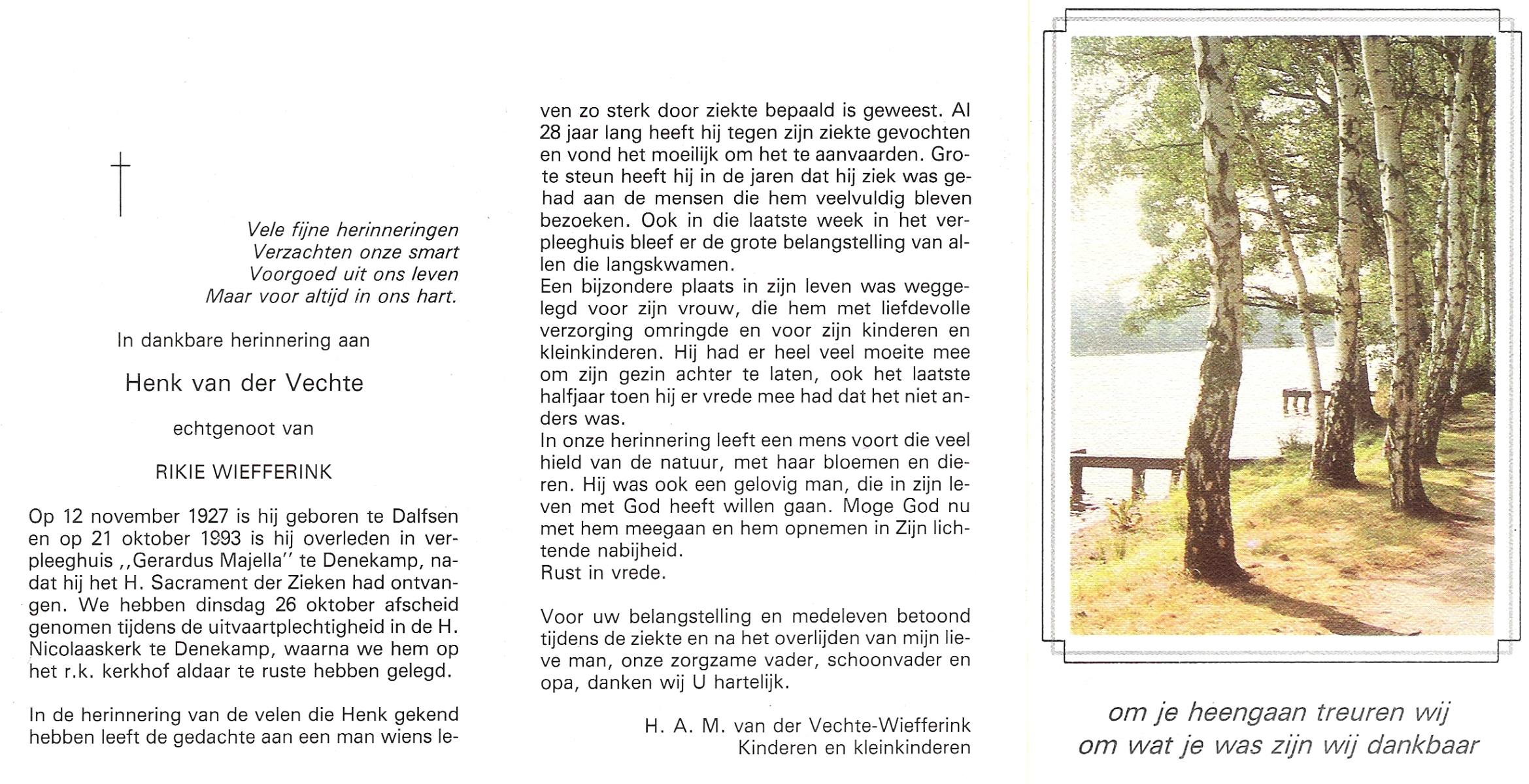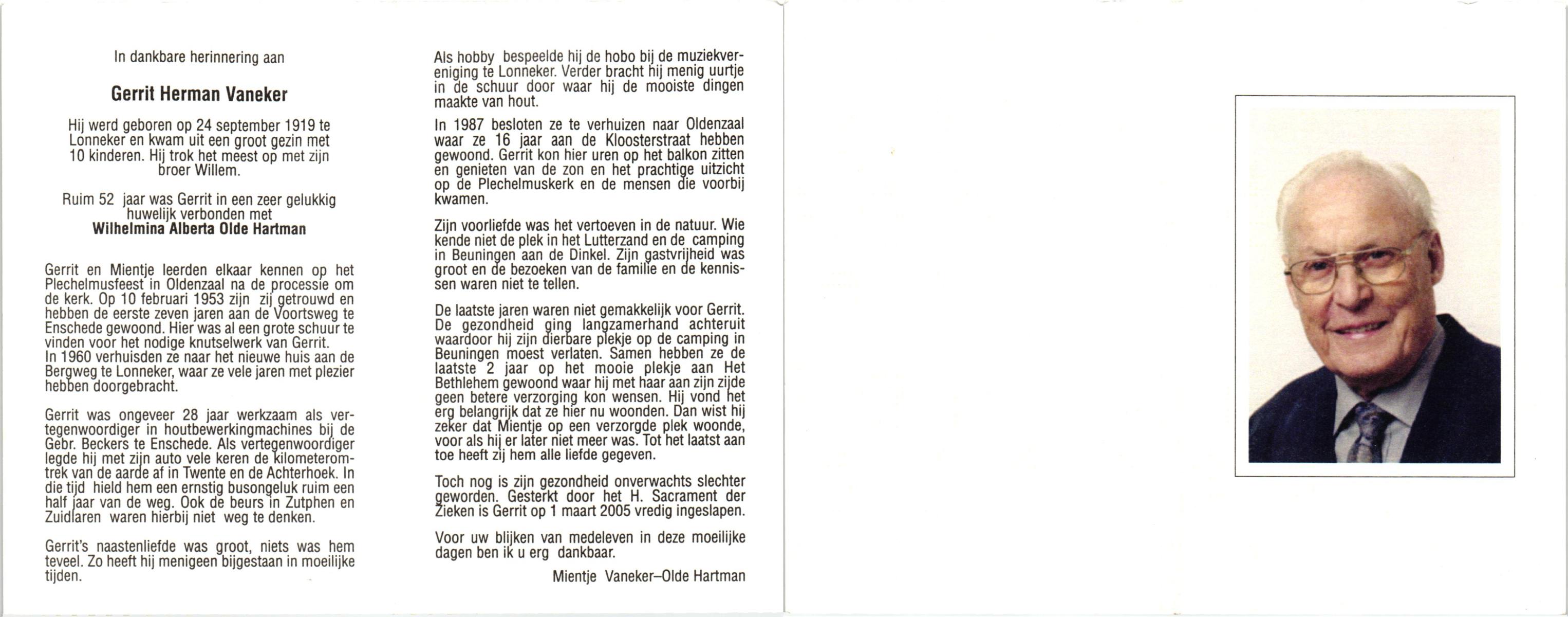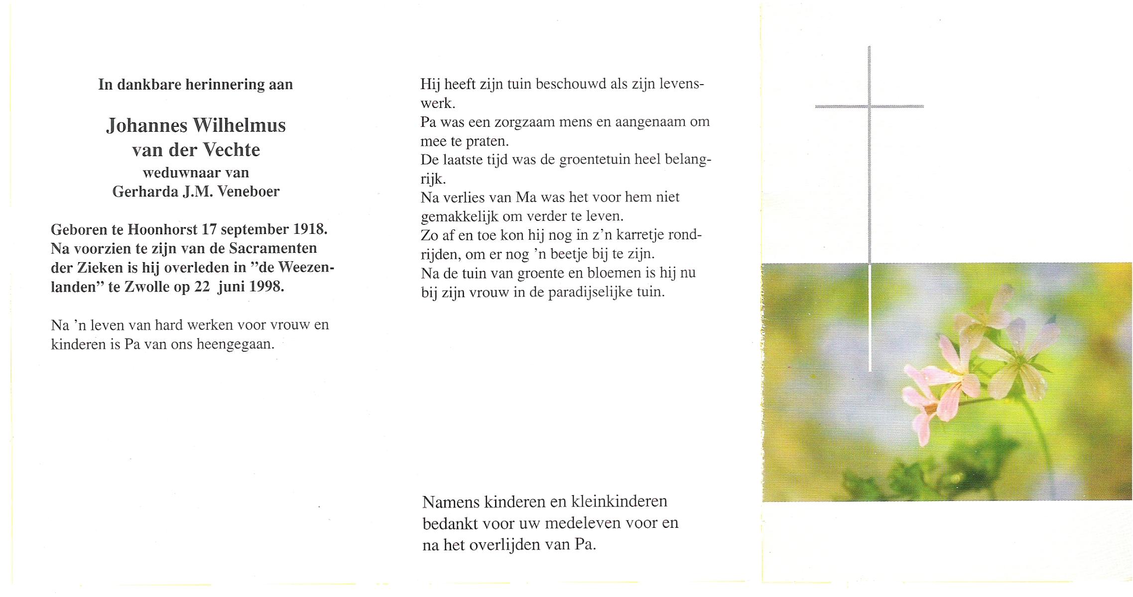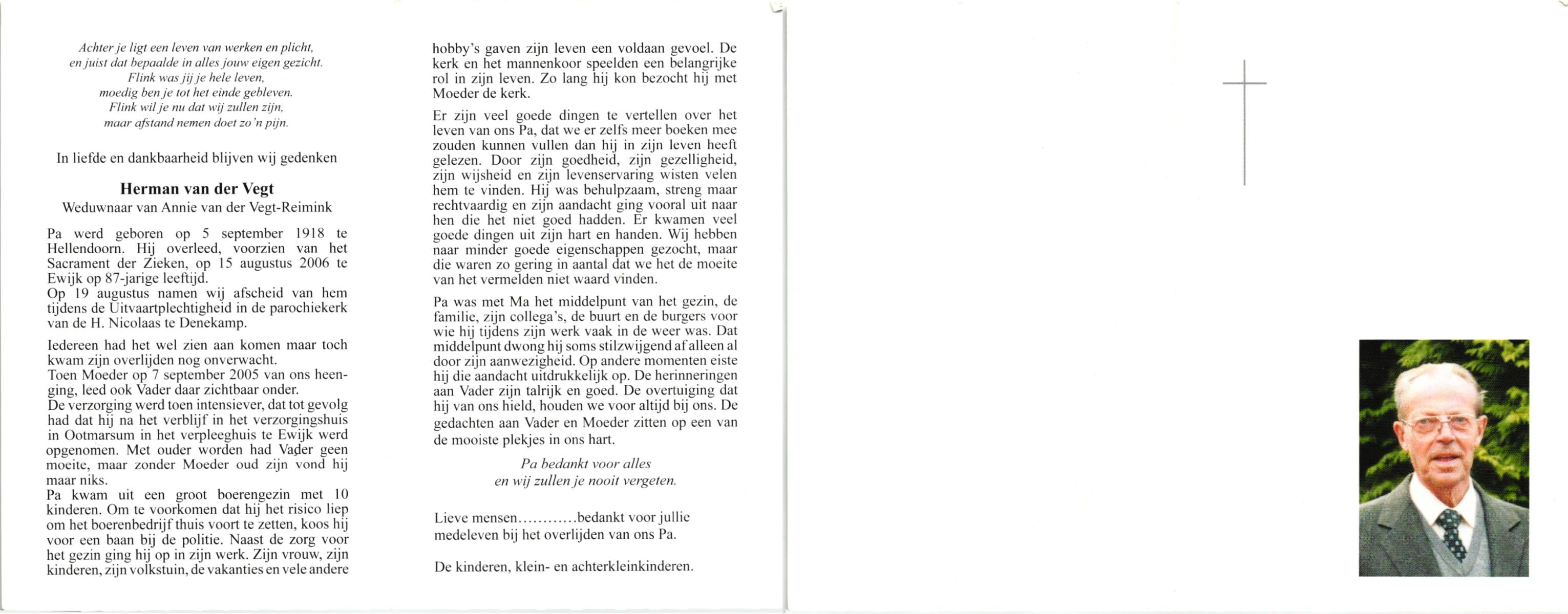 VEGT, van der, Herman, geboren op 5-9-1918 te Hellendoorn, overleden op 15-8-2006 te Ewijk op 87-jarige leeftijd, begraven op 19-8-2006 te Denekamp.