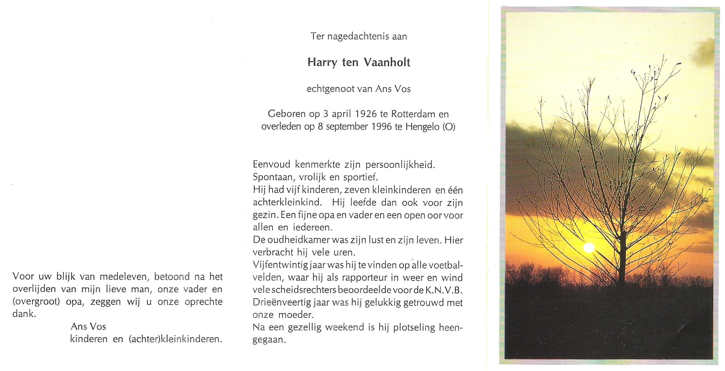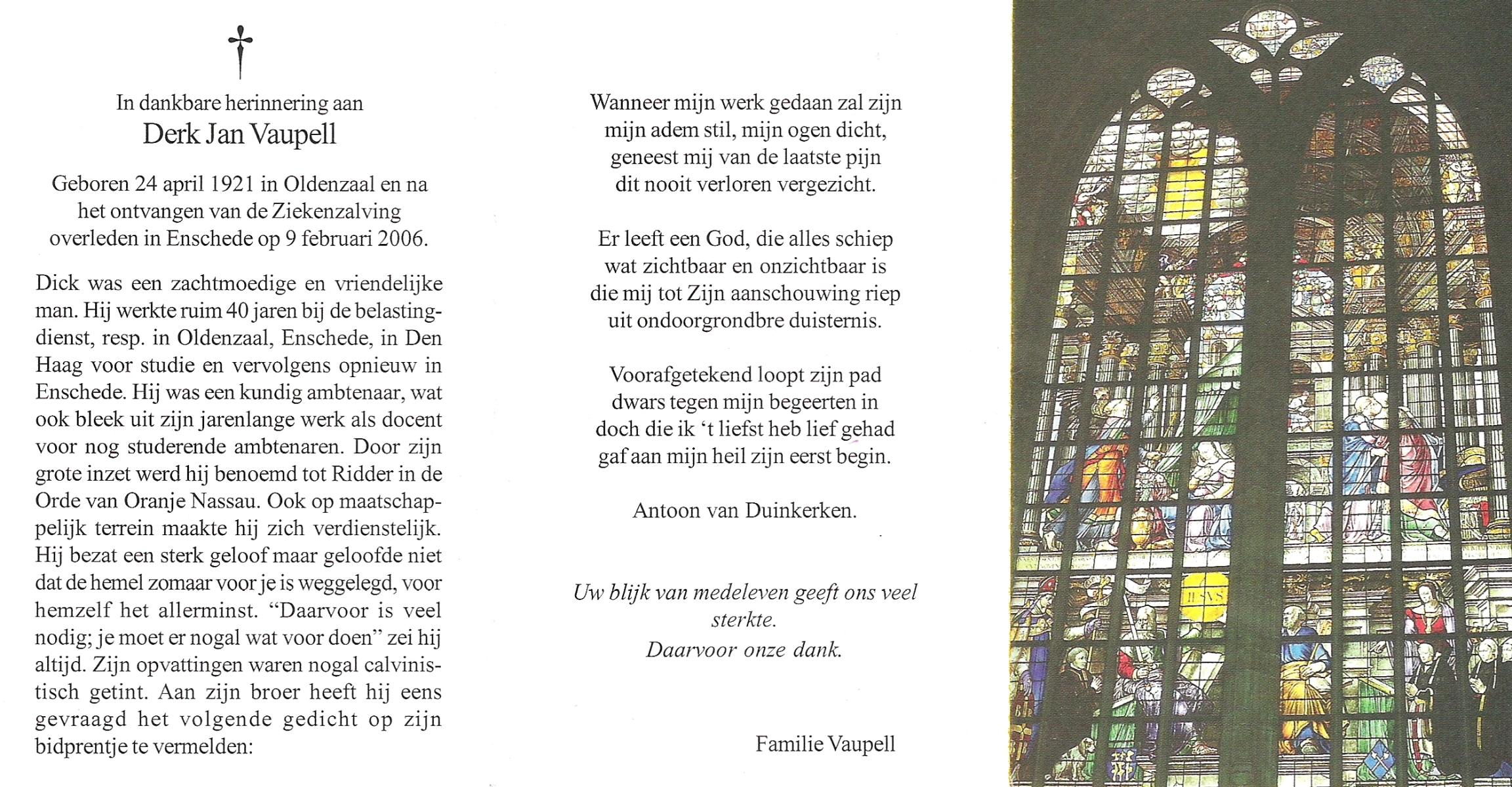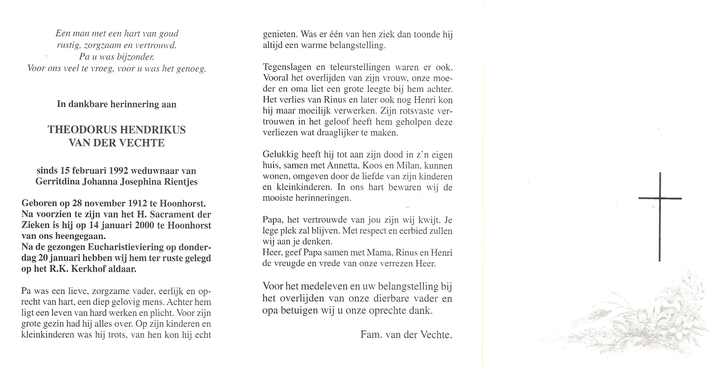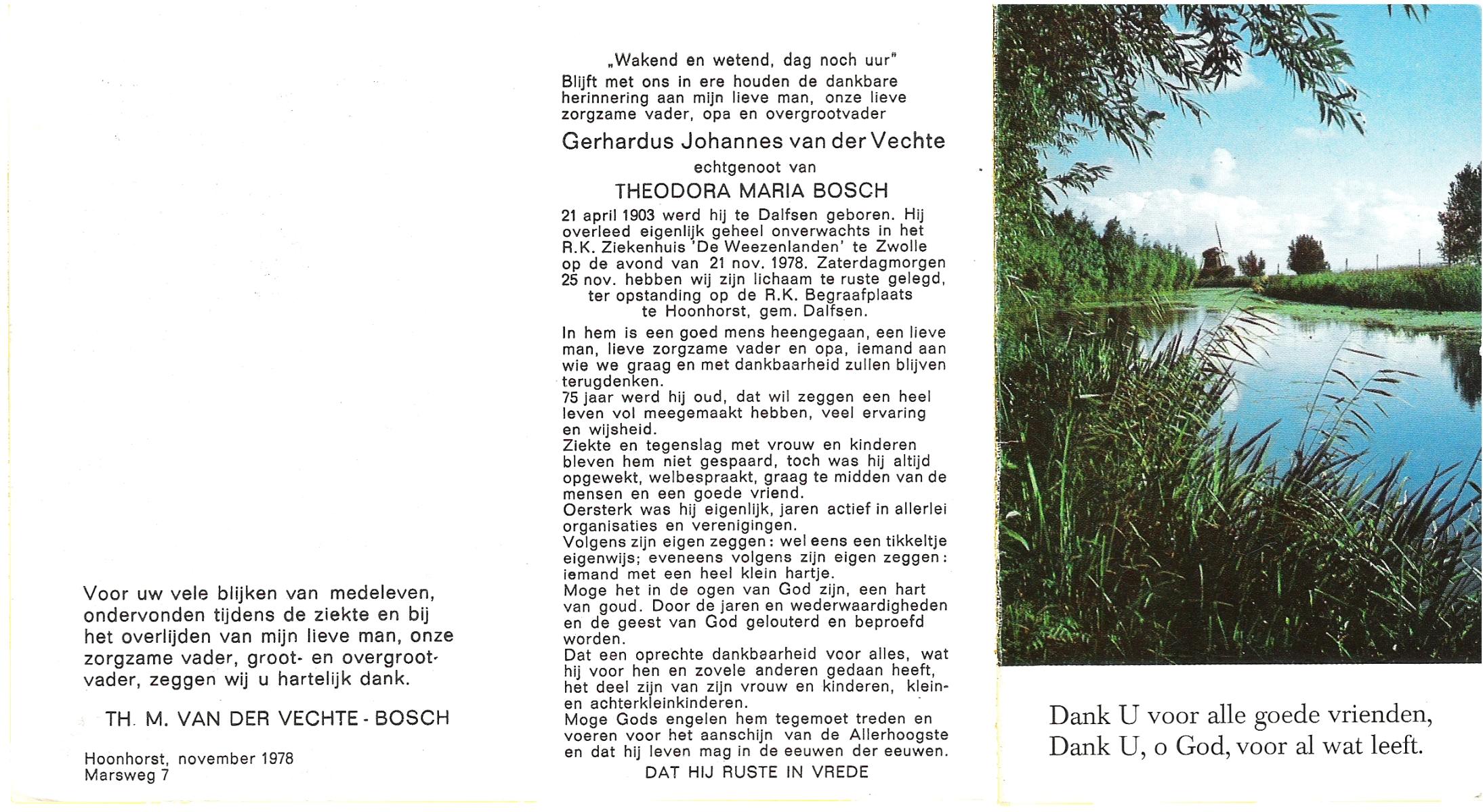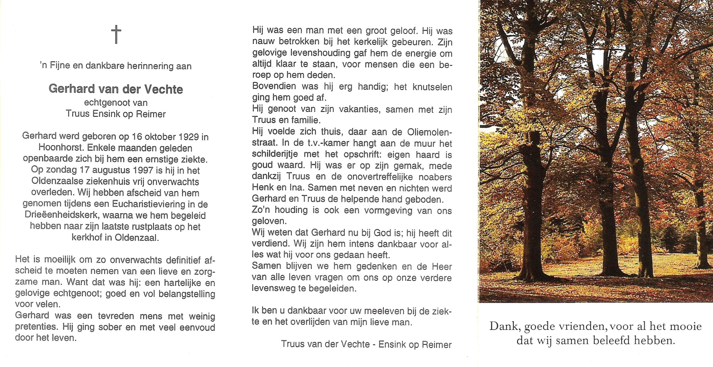 VEGT, van der, Herman, geboren op 5-9-1918 te Hellendoorn, overleden op 15-8-2006 te Ewijk op 87-jarige leeftijd, begraven op 19-8-2006 te Denekamp.