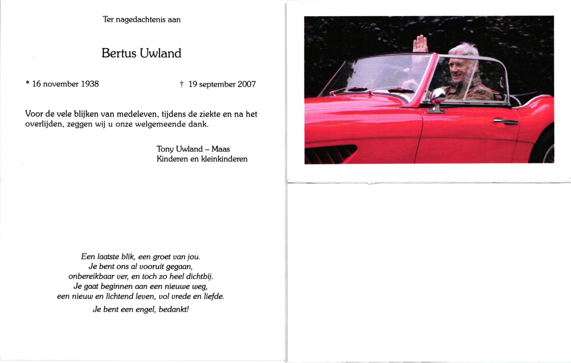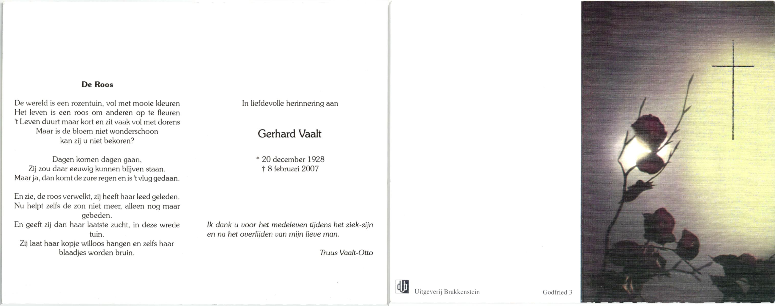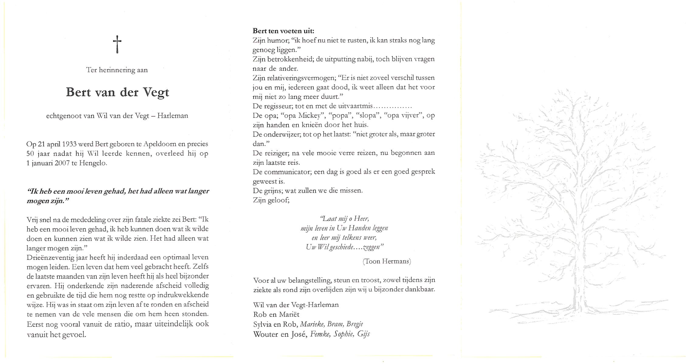 VEGT, van der, Bert, geboren op 21-4-1933 te Apeldoorn, overleden op 1-1-2007 te Hengelo (Ov.) op 73-jarige leeftijd.