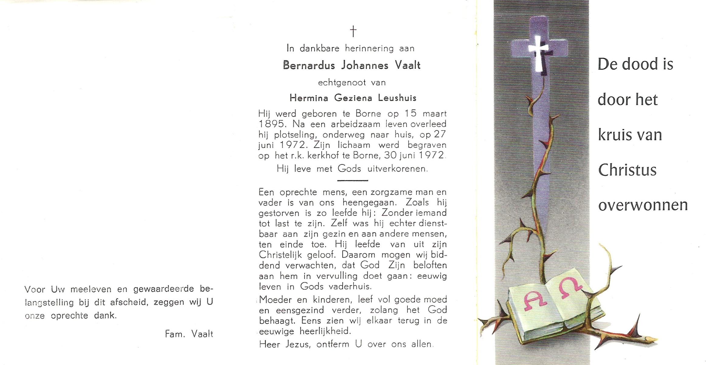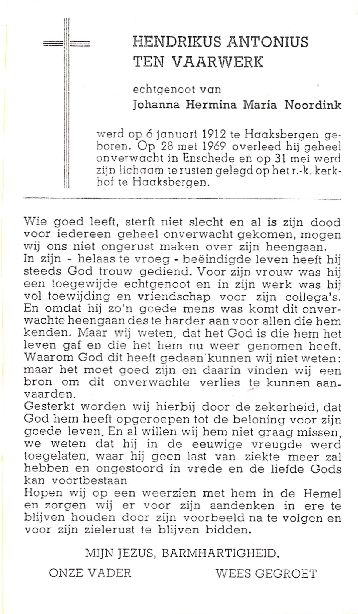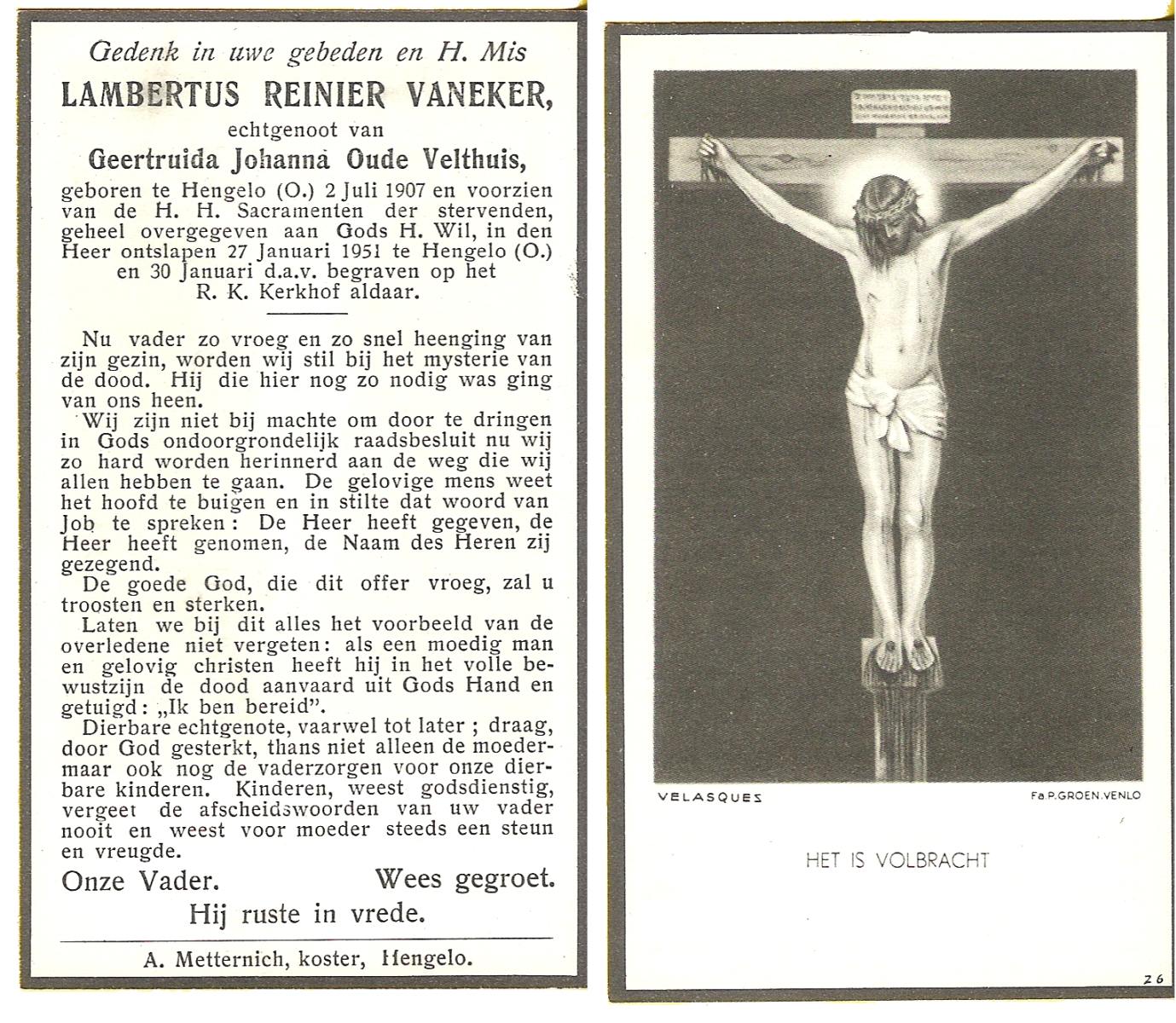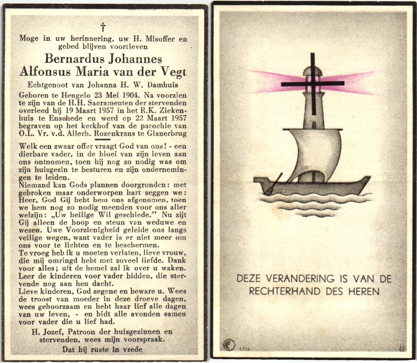 VEGT, van der, Bernardus Johannes Alfonsus, geboren op 23-5-1904 te Hengelo, overleden op 19-3-1957 te Enschede, ziekenhuis op 52-jarige leeftijd, begraven op 22-3-1957 te Glanerbrug.