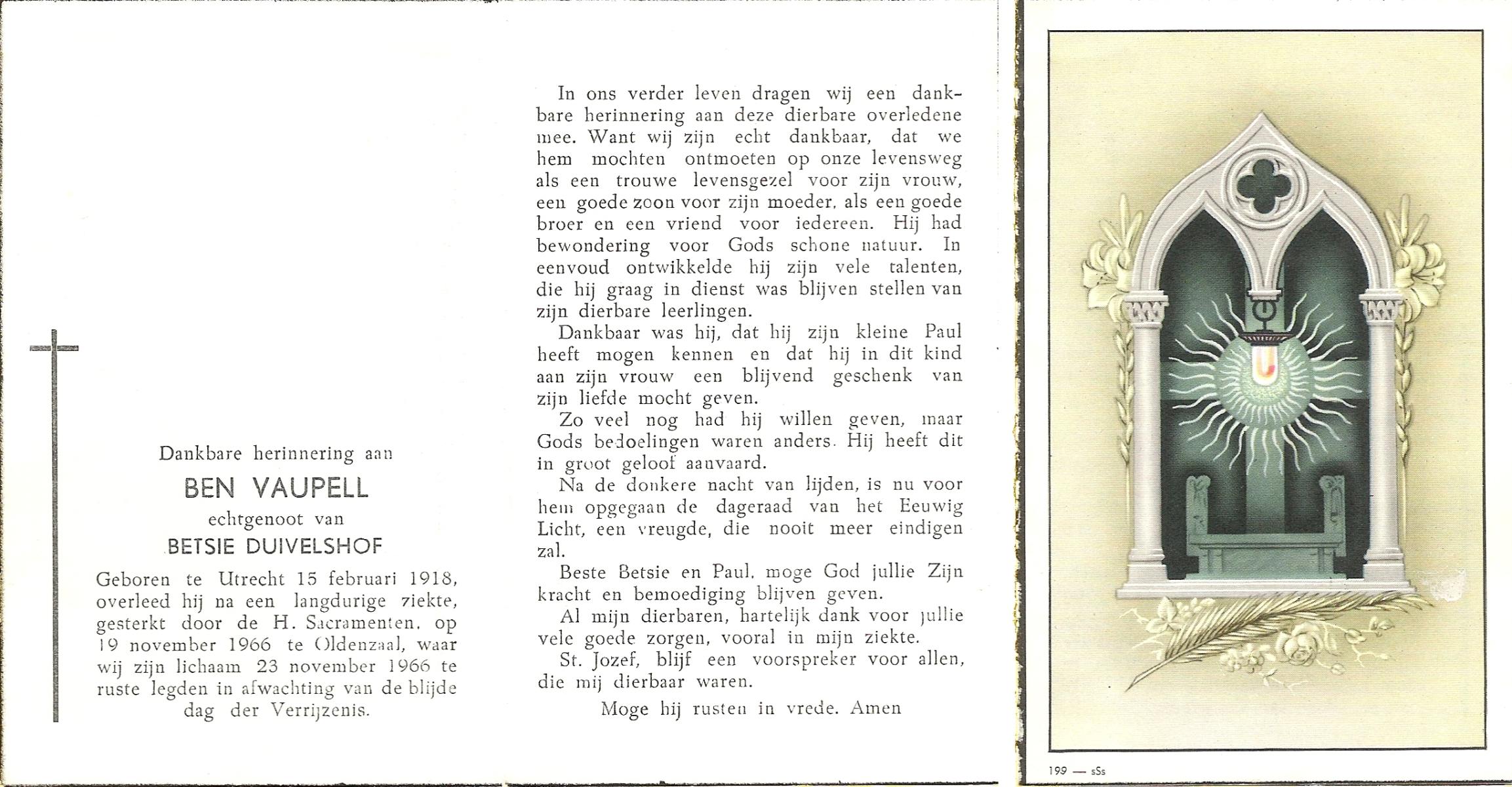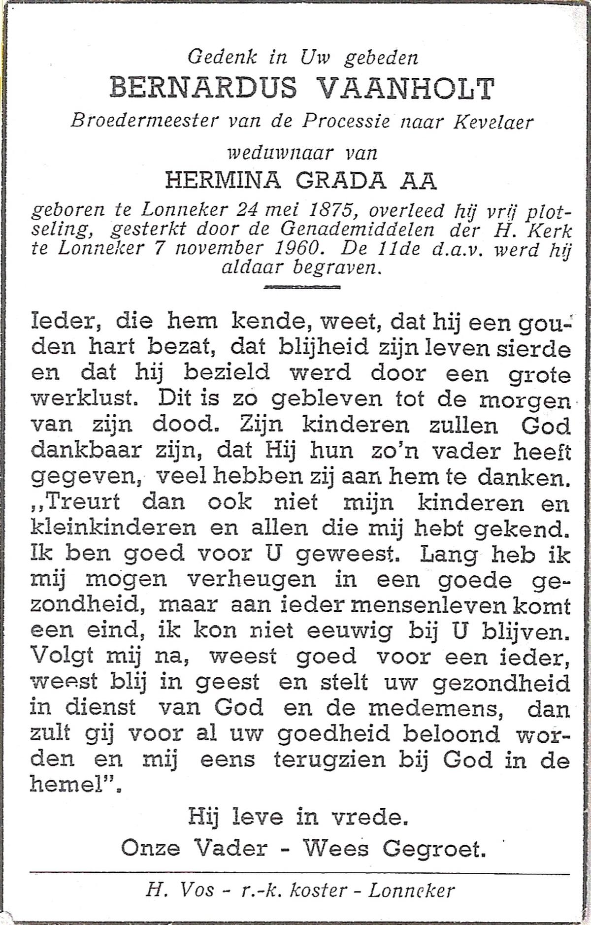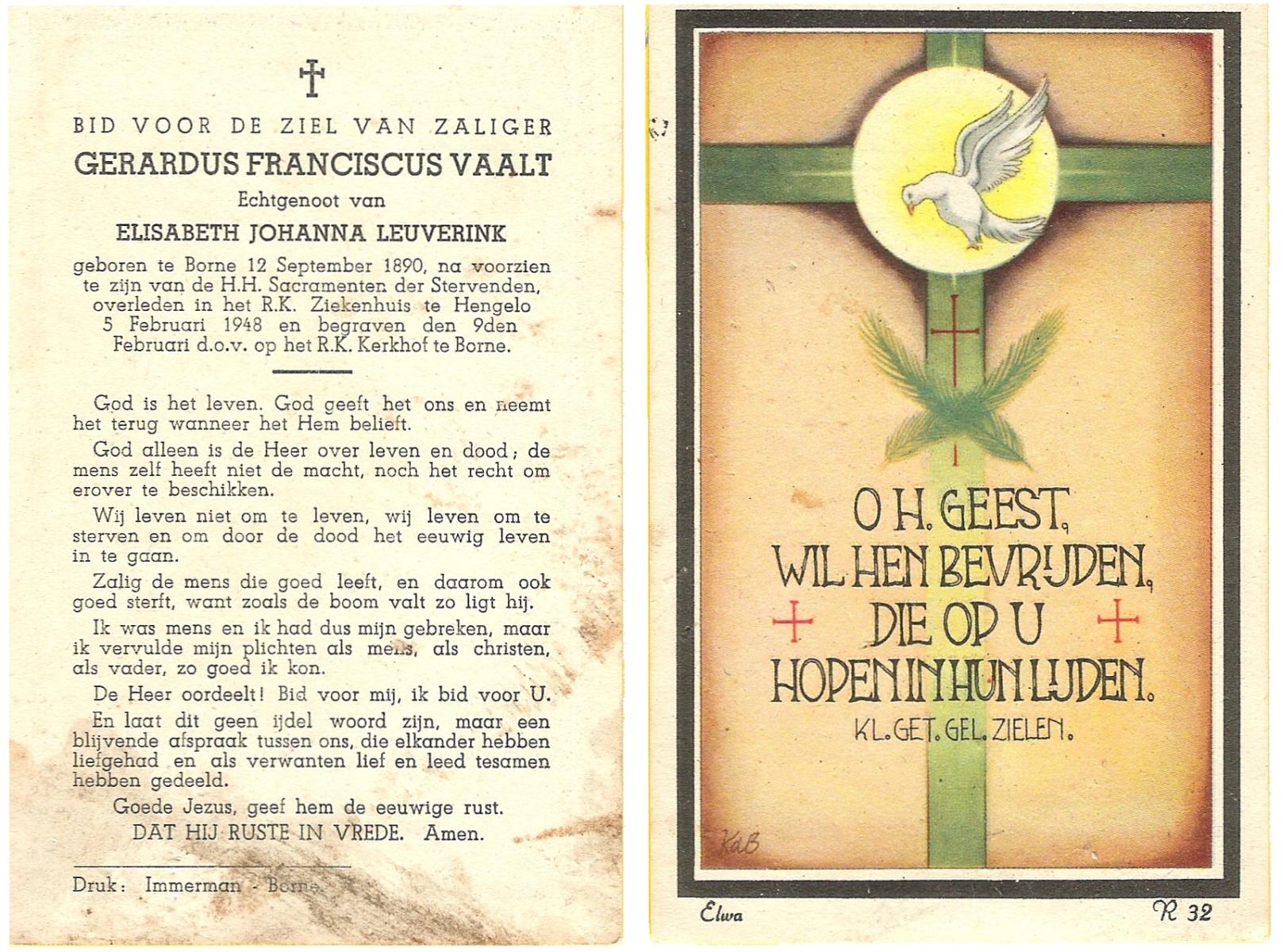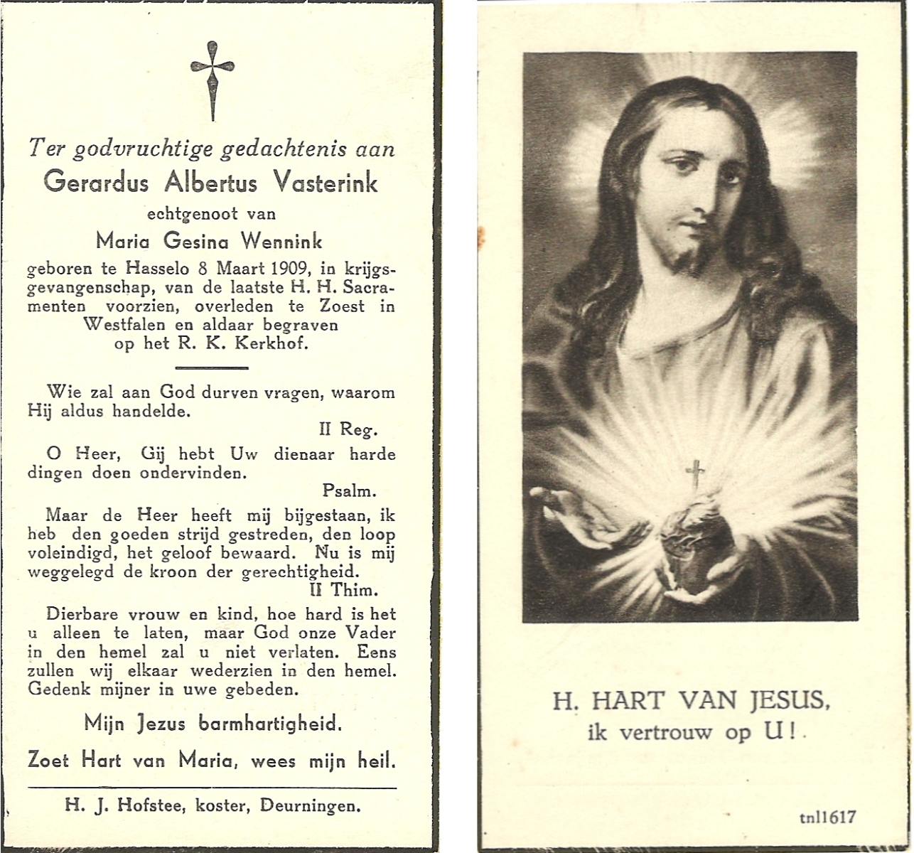 VEGT, van der, Bernardus Johannes Alfonsus, geboren op 23-5-1904 te Hengelo, overleden op 19-3-1957 te Enschede, ziekenhuis op 52-jarige leeftijd, begraven op 22-3-1957 te Glanerbrug.