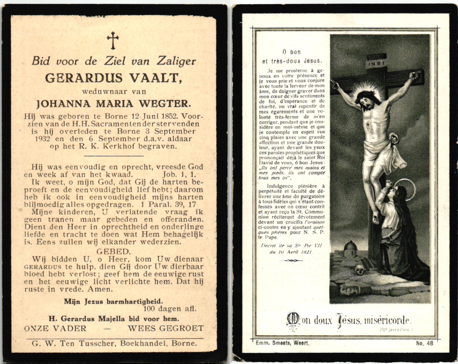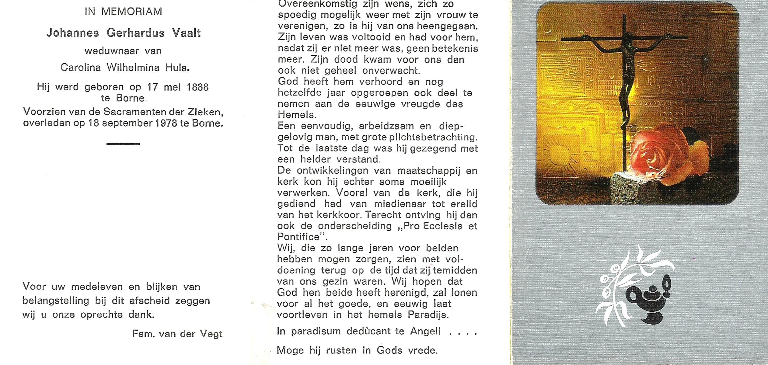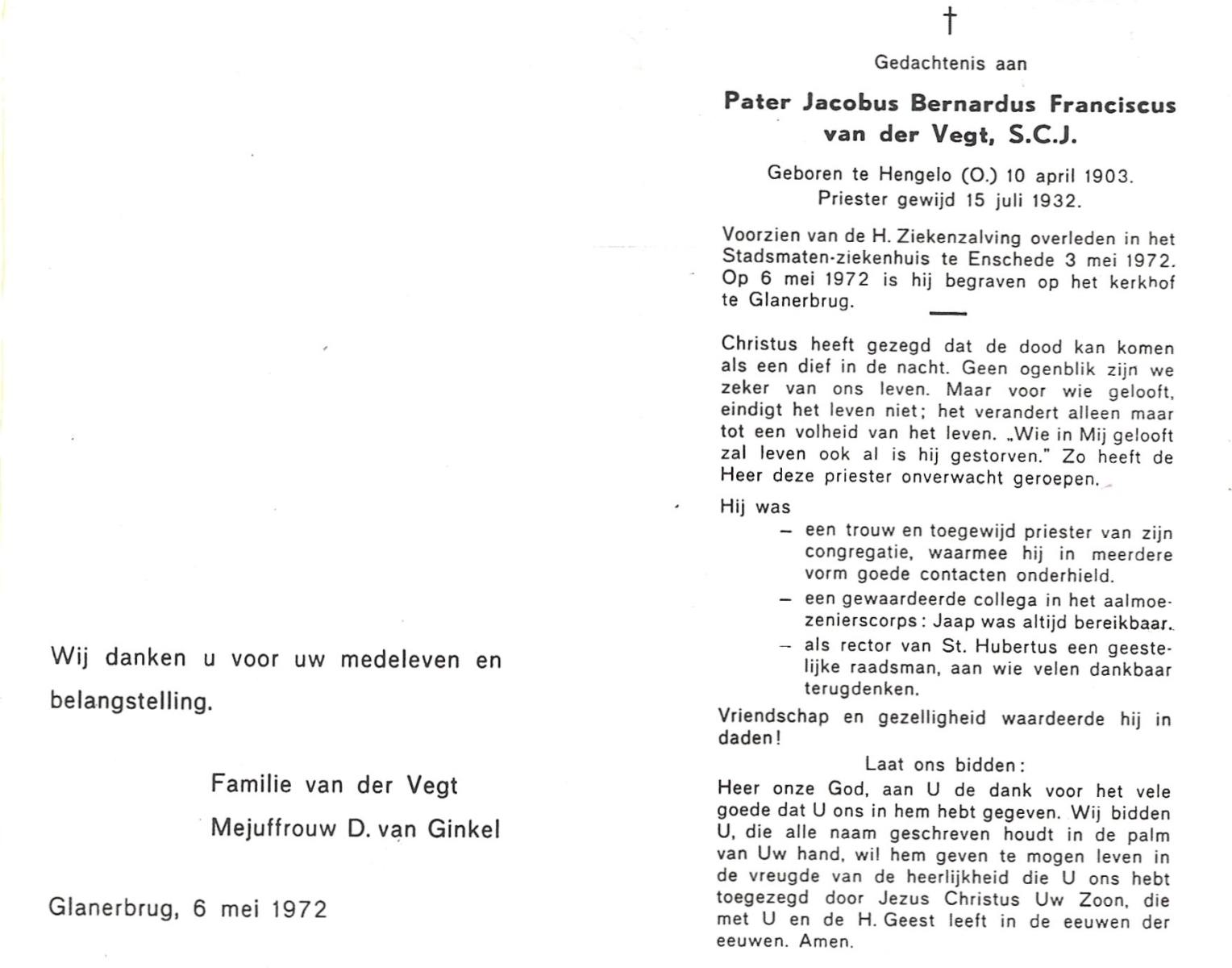 VEGT, van der, Jacobus Bernardus Franciscus, geboren op 10-4-1903 te Hengelo (O), overleden op 3-5-1972 te Enschede op 69-jarige leeftijd, begraven op 6-5-1972 te Glanerbrug.