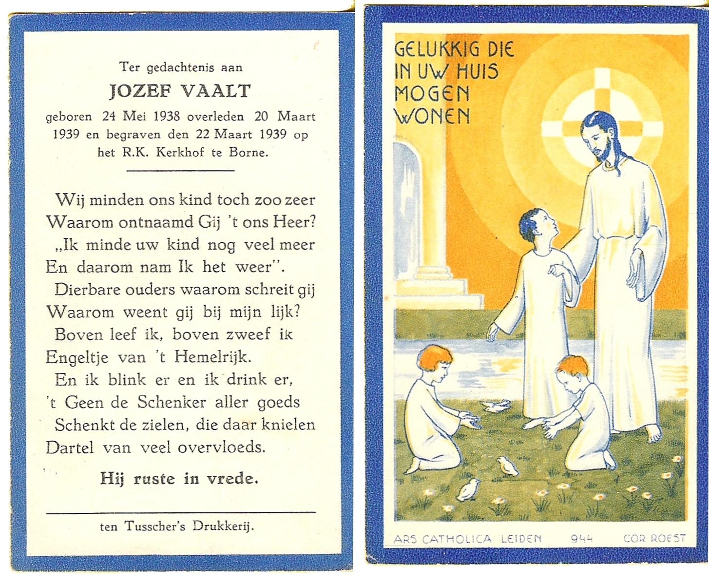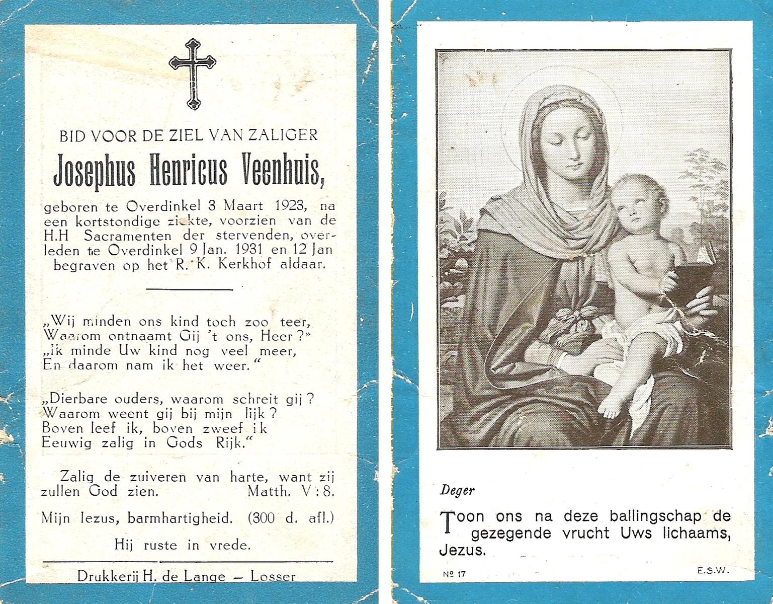 VEENHUIS, Josephus Henricus, geboren op 3-3-1923 te Overdinkel, overleden op 9-1-1931 te Overdinkel op 7-jarige leeftijd, begraven op 12-1-1931 te Overdinkel.