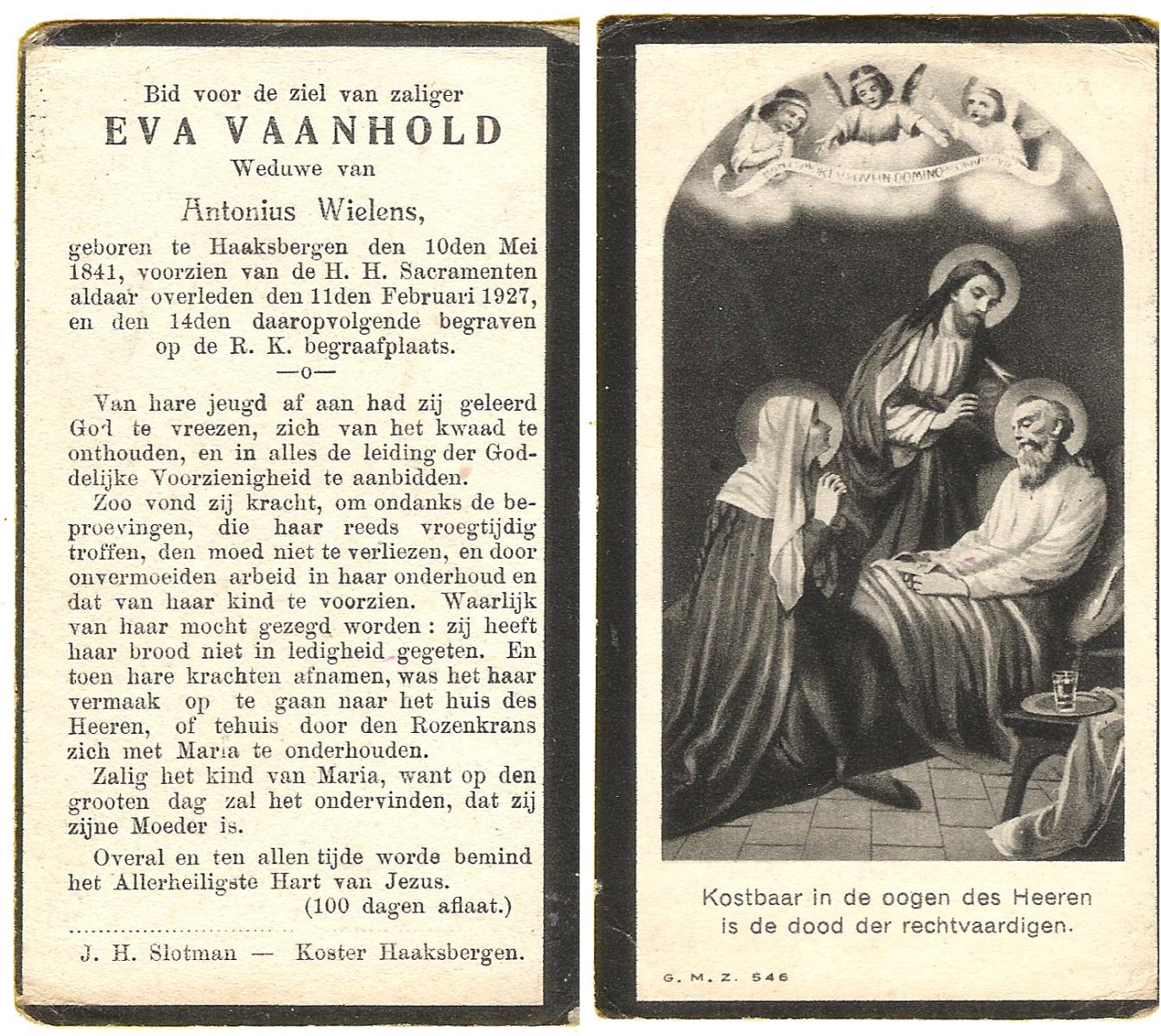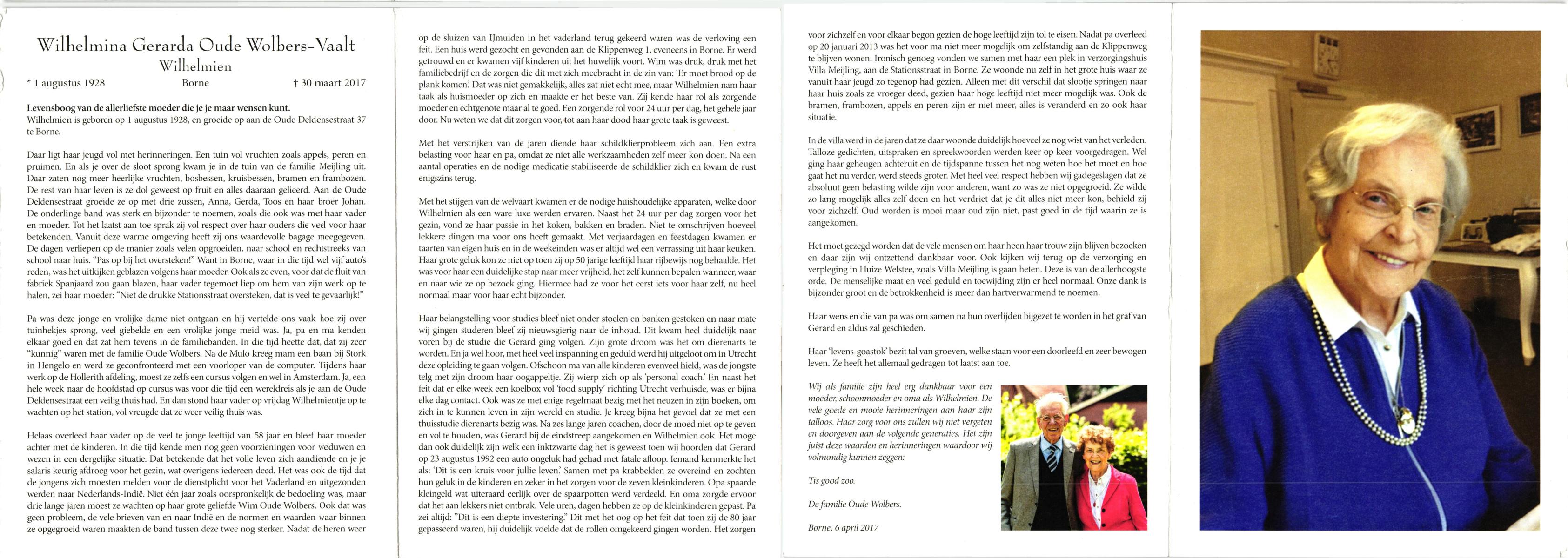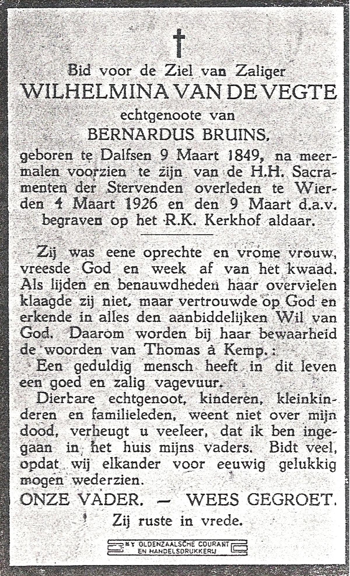 VEGTE, van der, Wilhelmina, geboren op 09-03-1849 te Dalfsen, overleden op 4-3-1926 te Wierden op 76-jarige leeftijd, begraven op 9-3-1926 te Wierden.