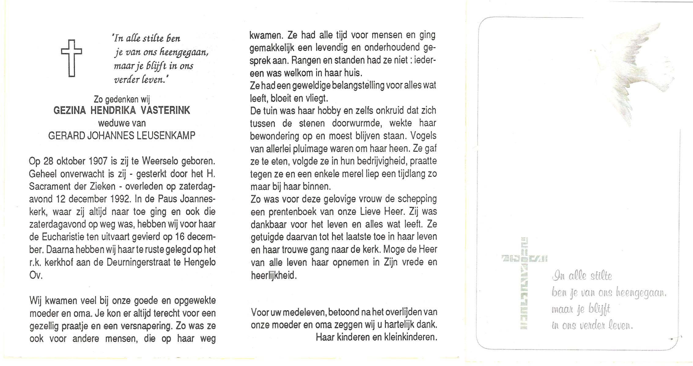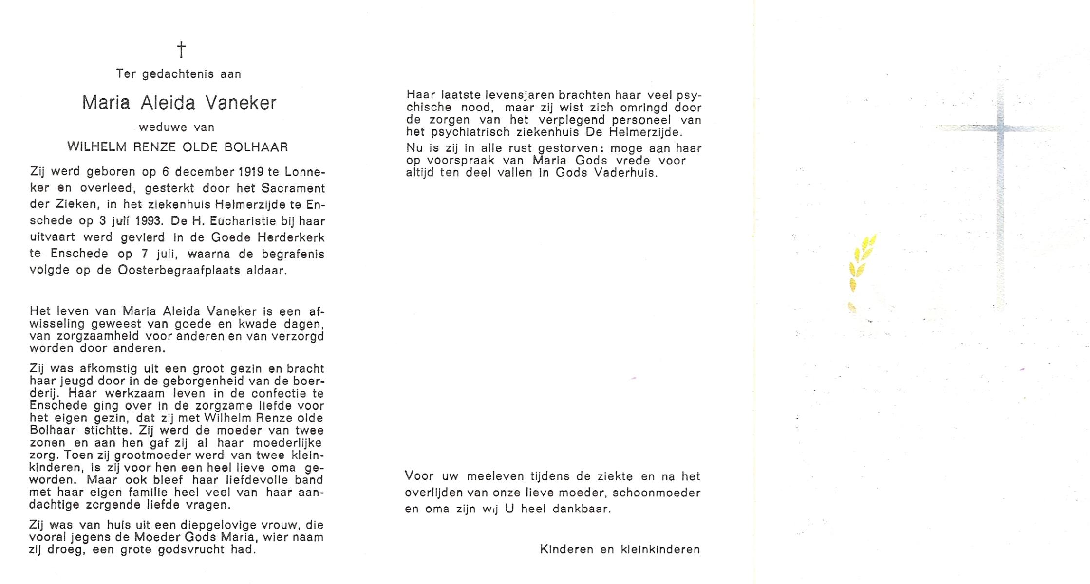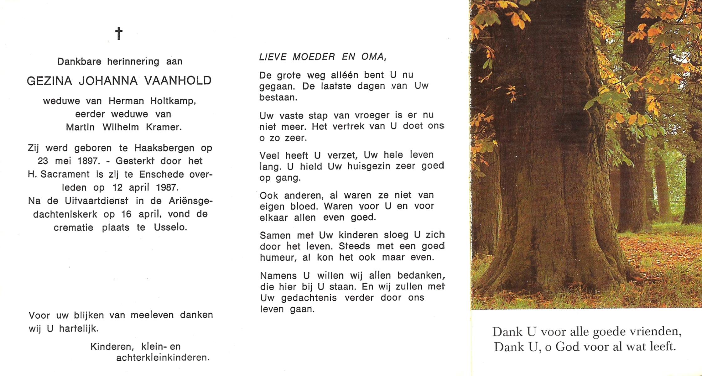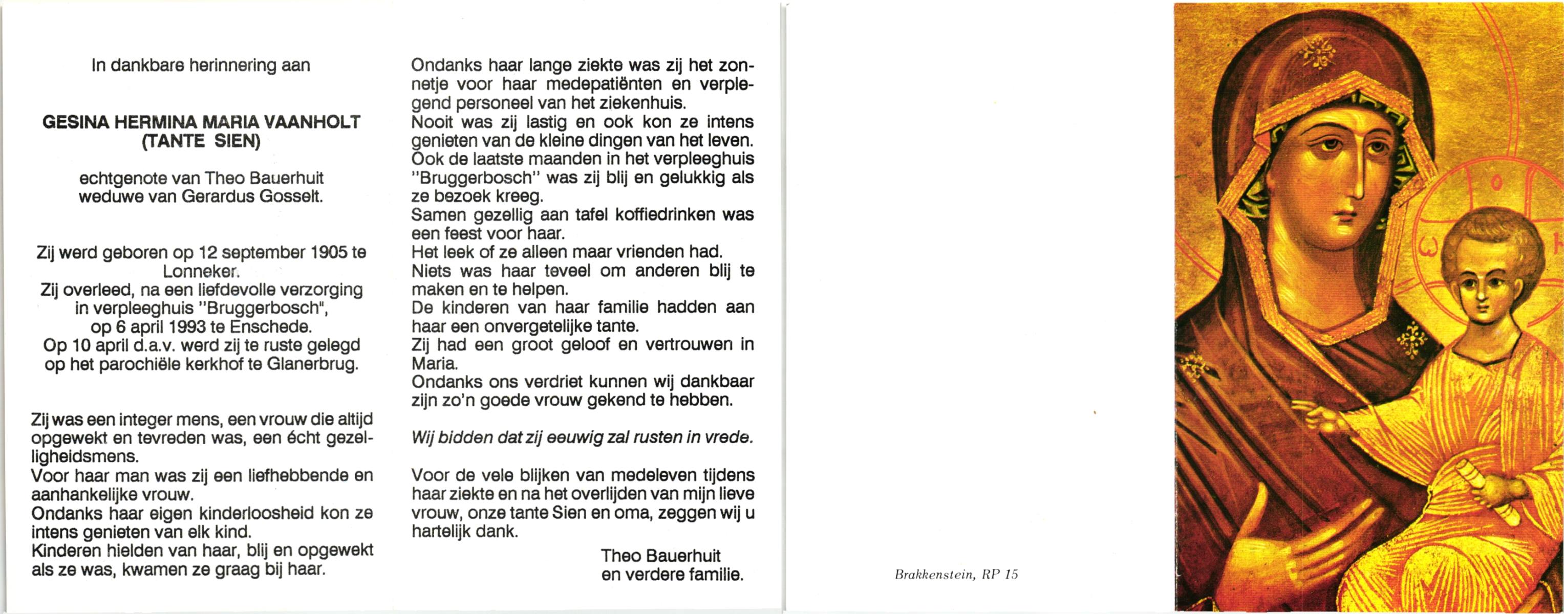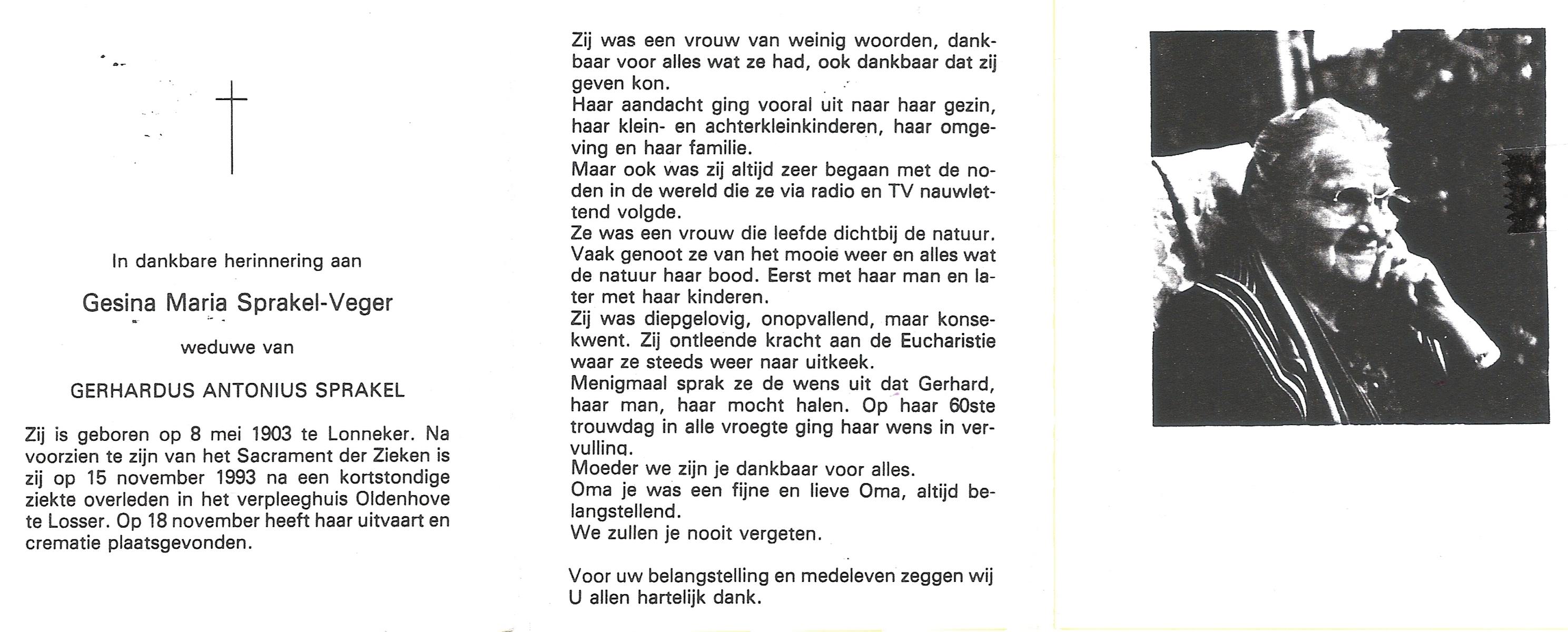 VEGER, Gesina Maria, geboren op 8-5-1903 te Lonneker, overleden op 15-11-1993 te Losser op 90-jarige leeftijd, gecremeerd op 18-11-1993.