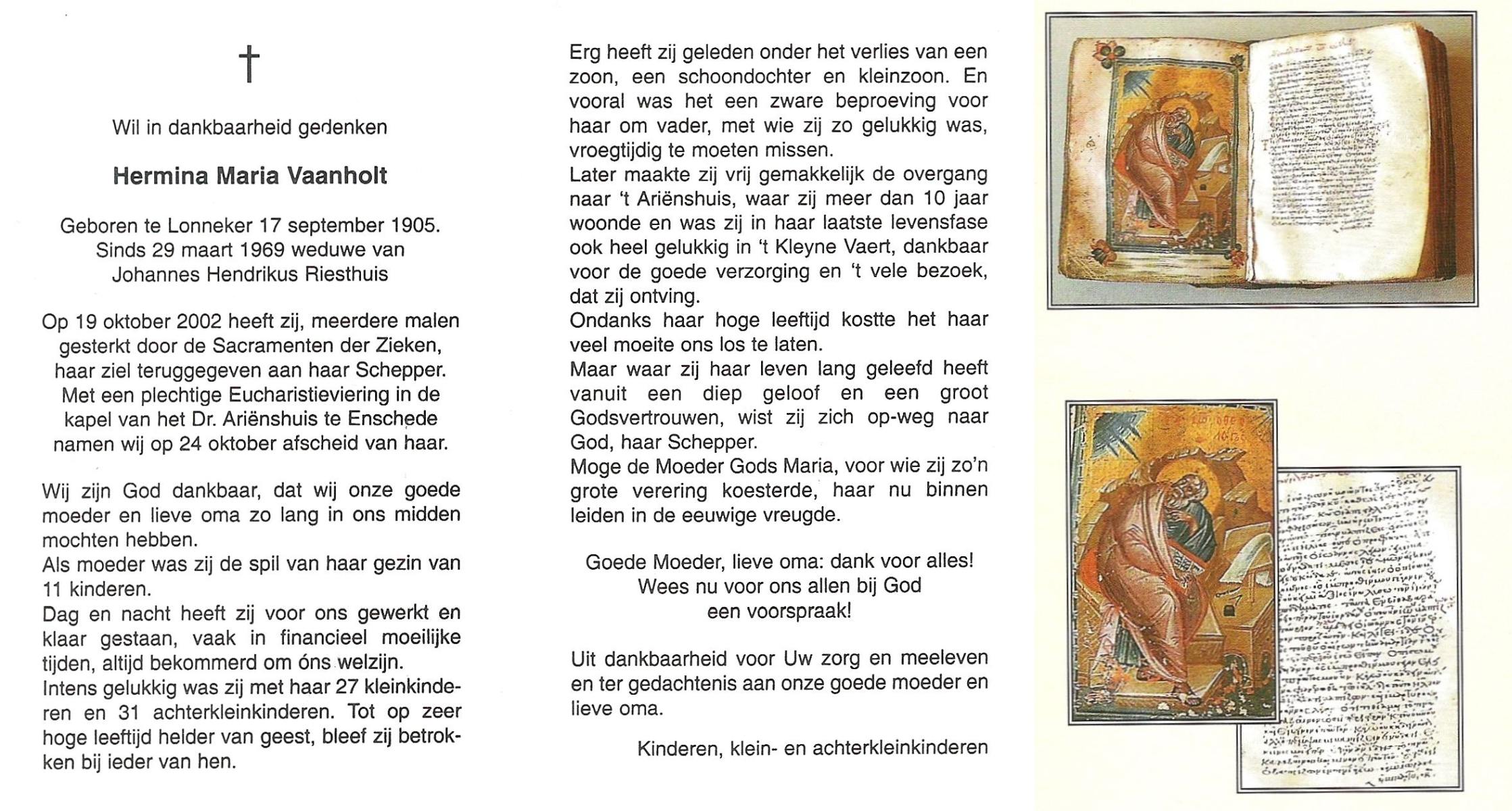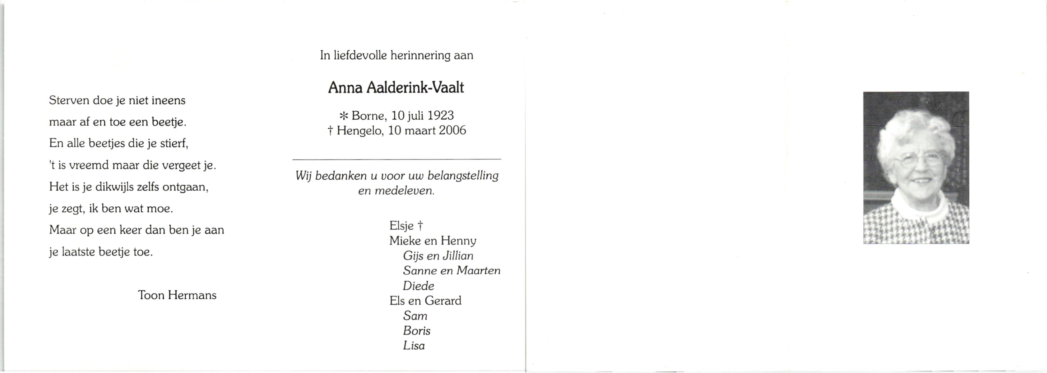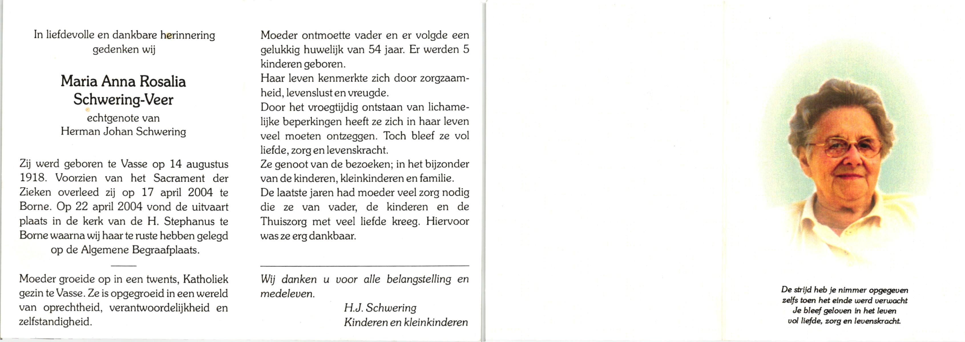 VEER, , Maria Anna Rosalia, geboren op 14-8-1918 te Vasse, overleden op 17-4-2004 te Borne op 85-jarige leeftijd, begraven op 22-4-2004 te Borne.