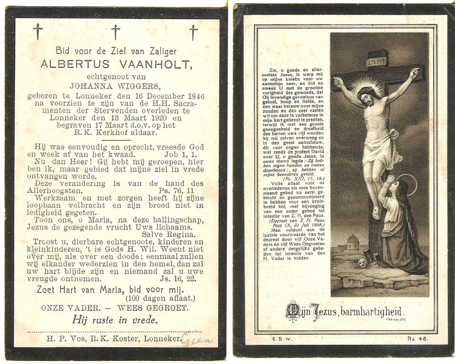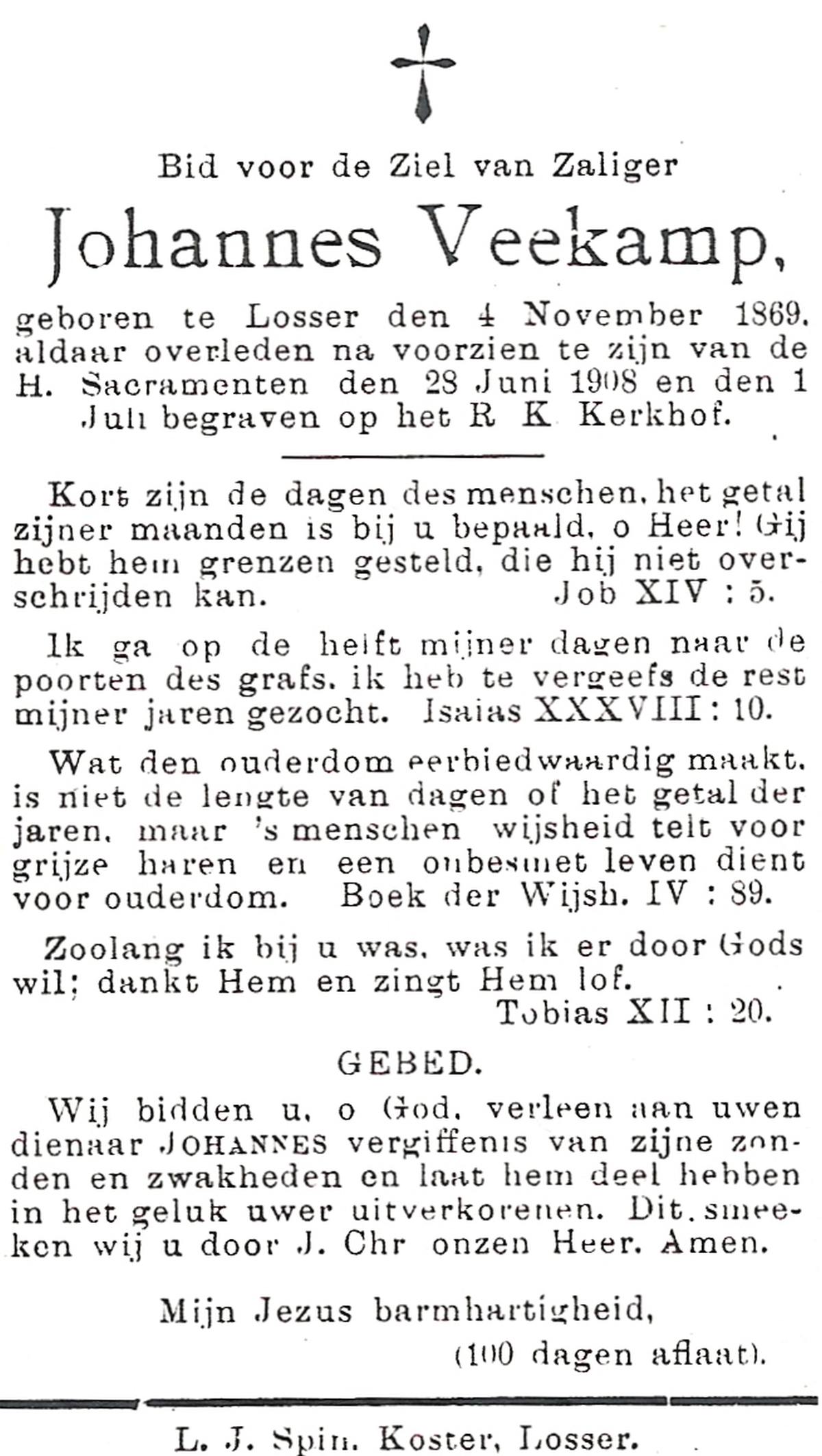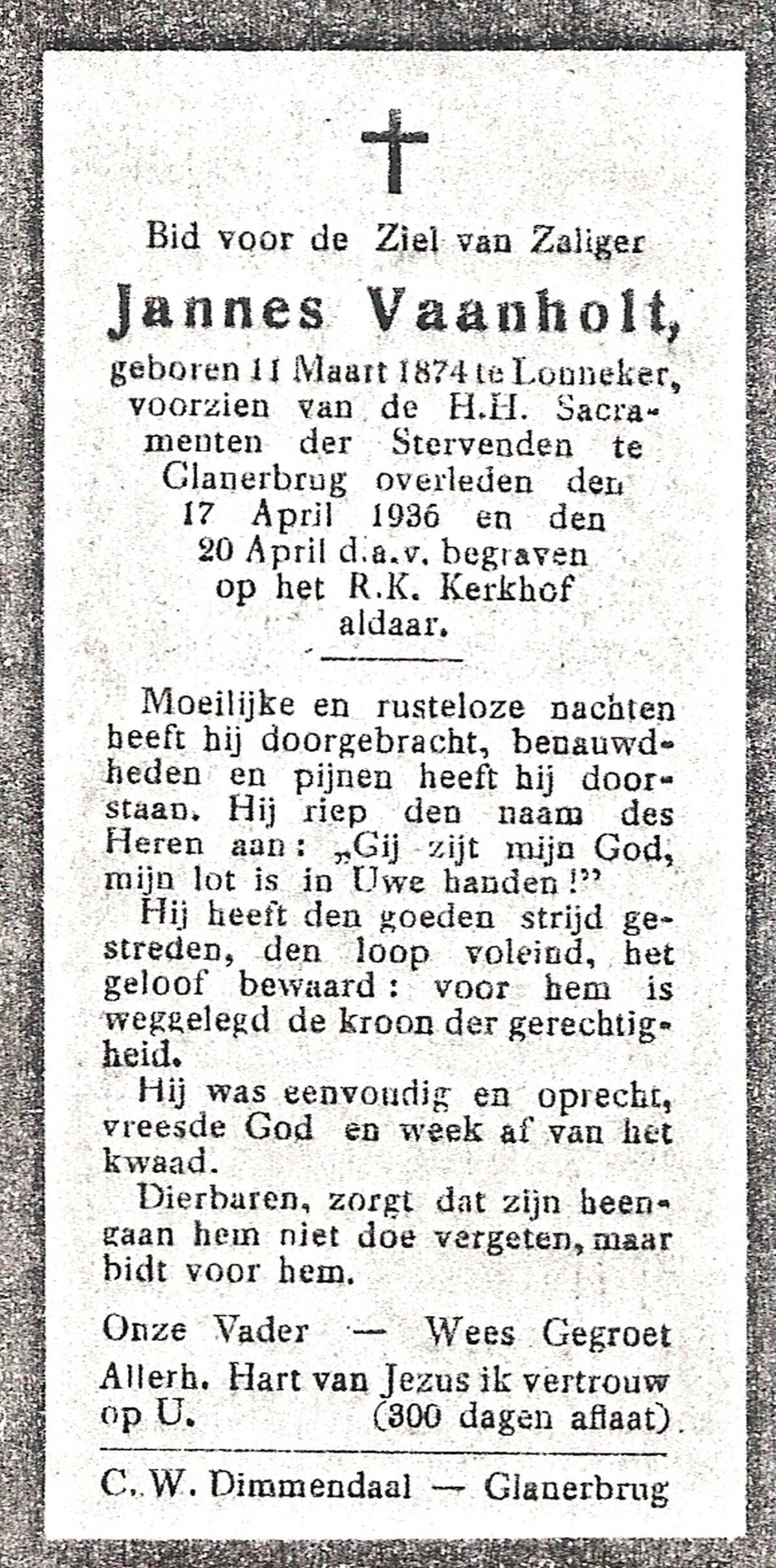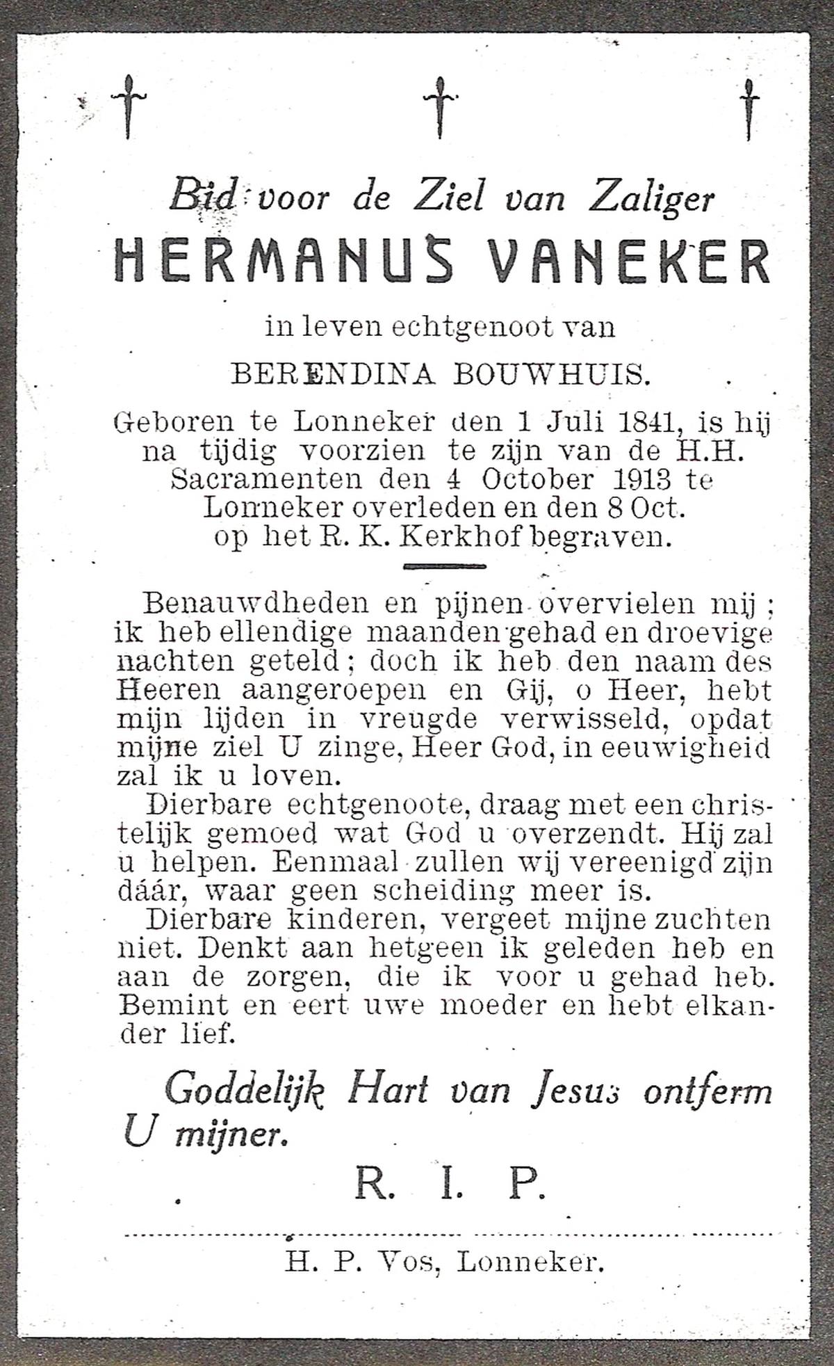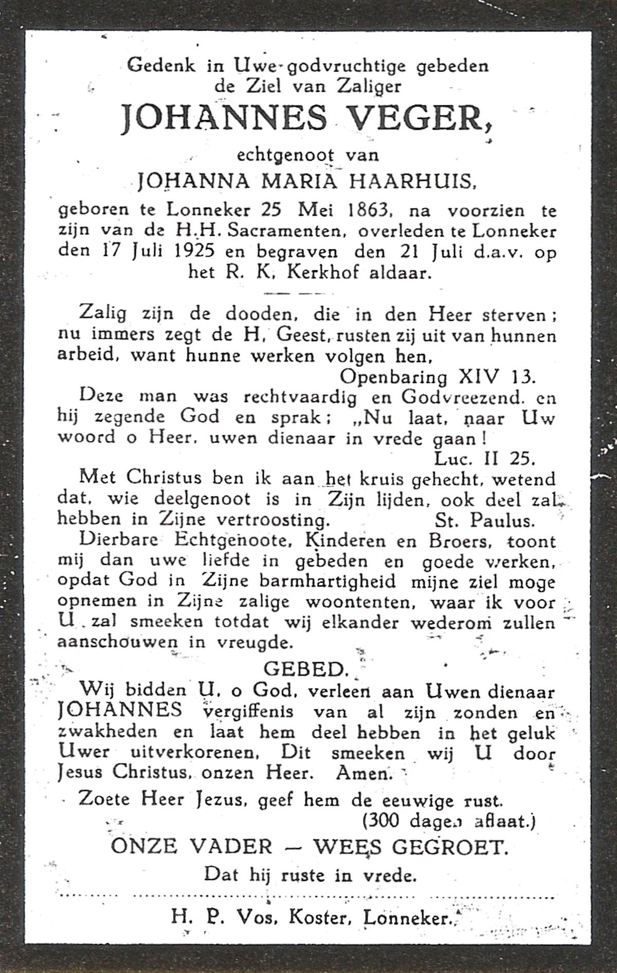 VEGER, Johannes, geboren op 25-05-1863 te Lonneker, overleden op 17-7-1925 te Lonneker op 62-jarige leeftijd, begraven op 21-7-1925 te Lonneker R.K.Kerkhof.