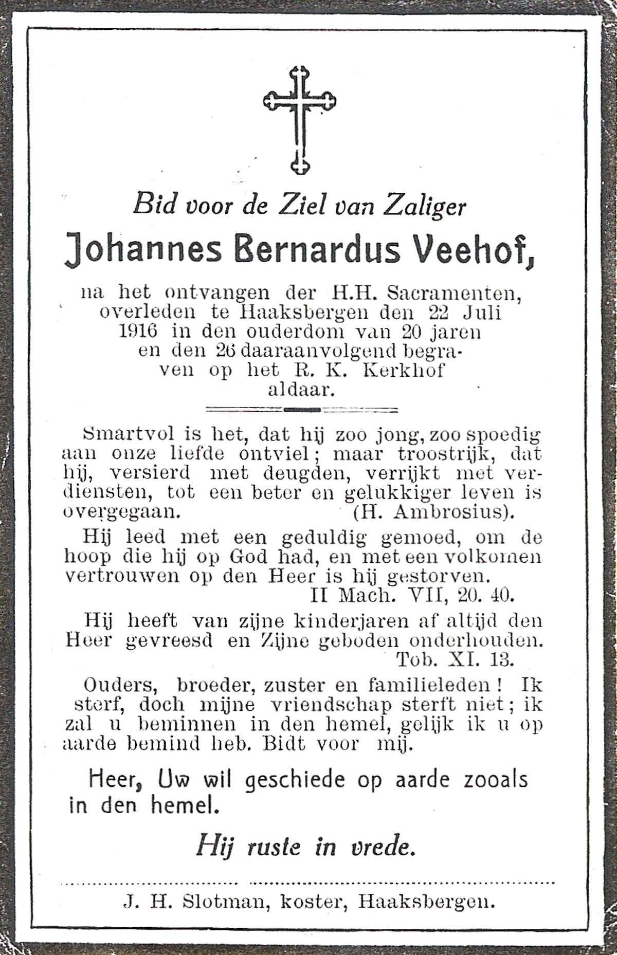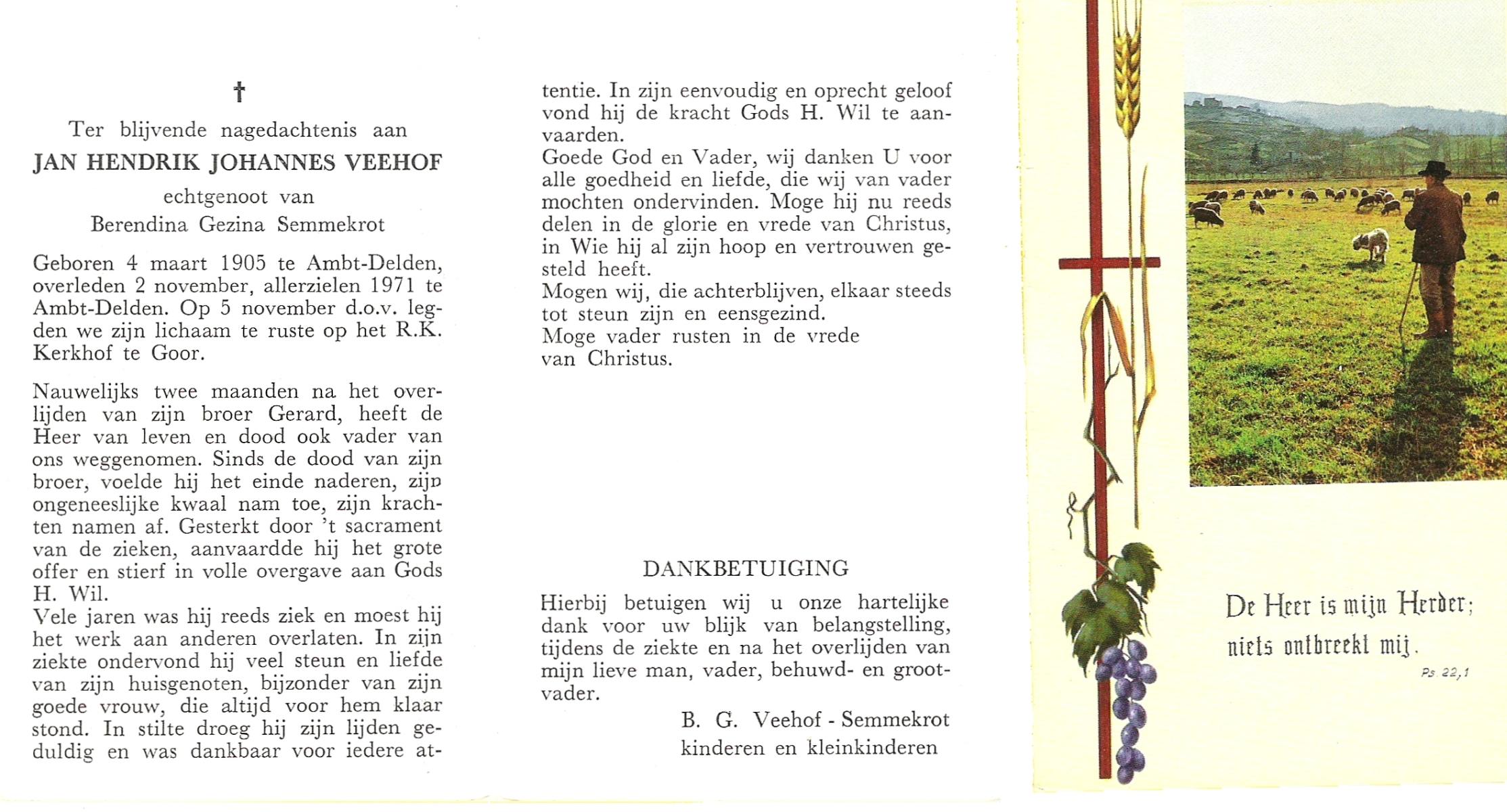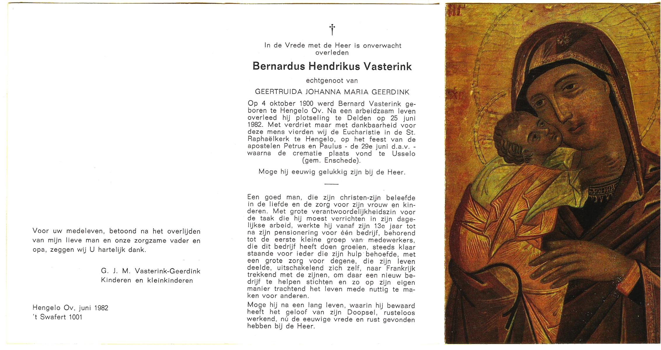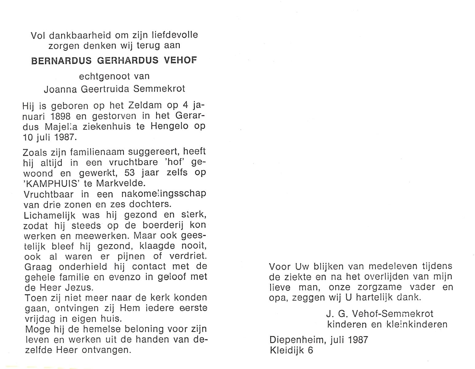 VEHOF, Bernardus Gerhardus, geboren op 04-01-1898 te Zeldam, overleden op 10-7-1987 te Hengelo (Ov.) op 89-jarige leeftijd.