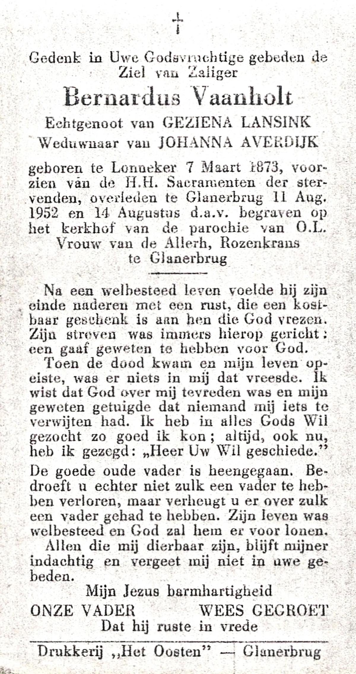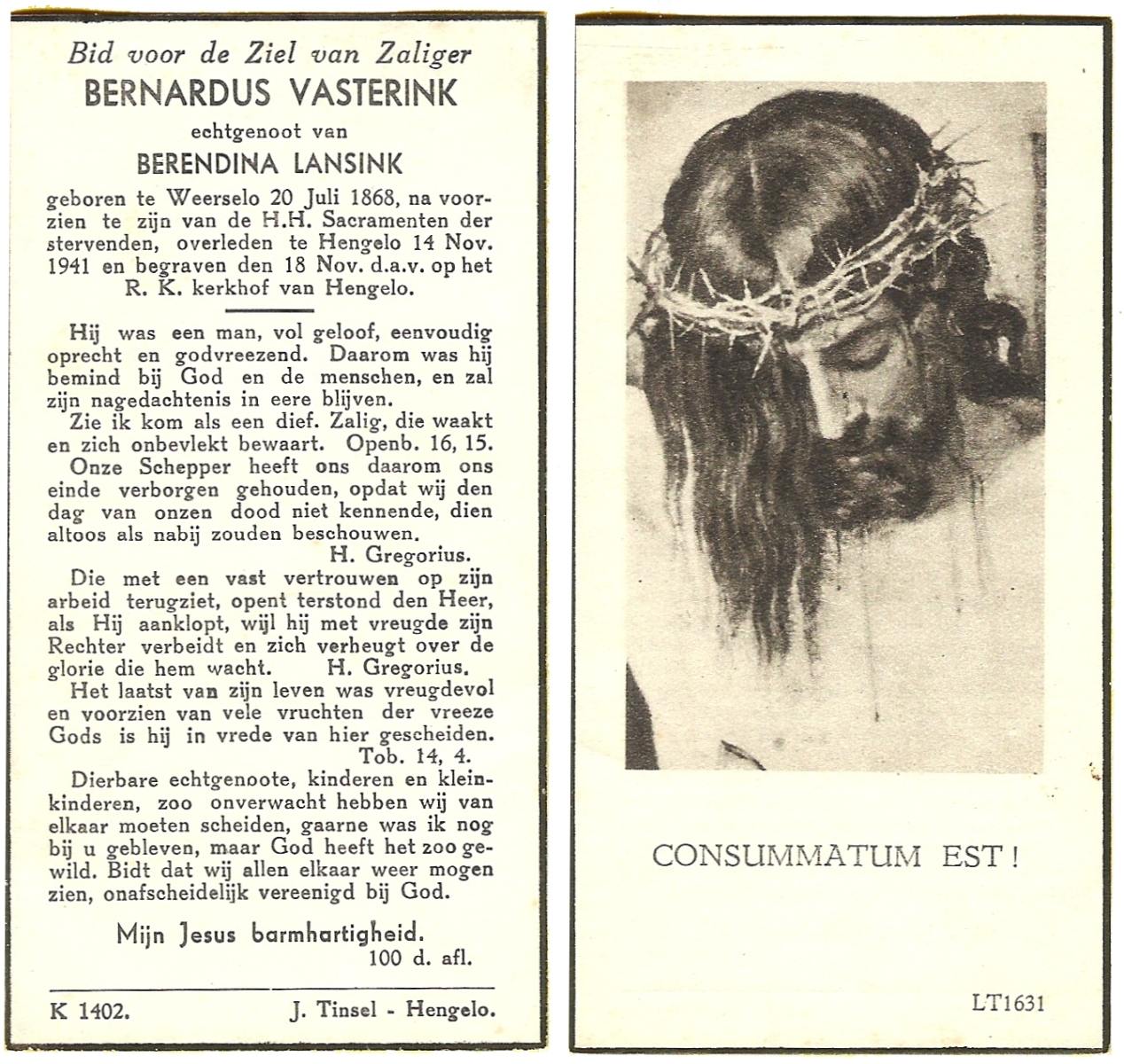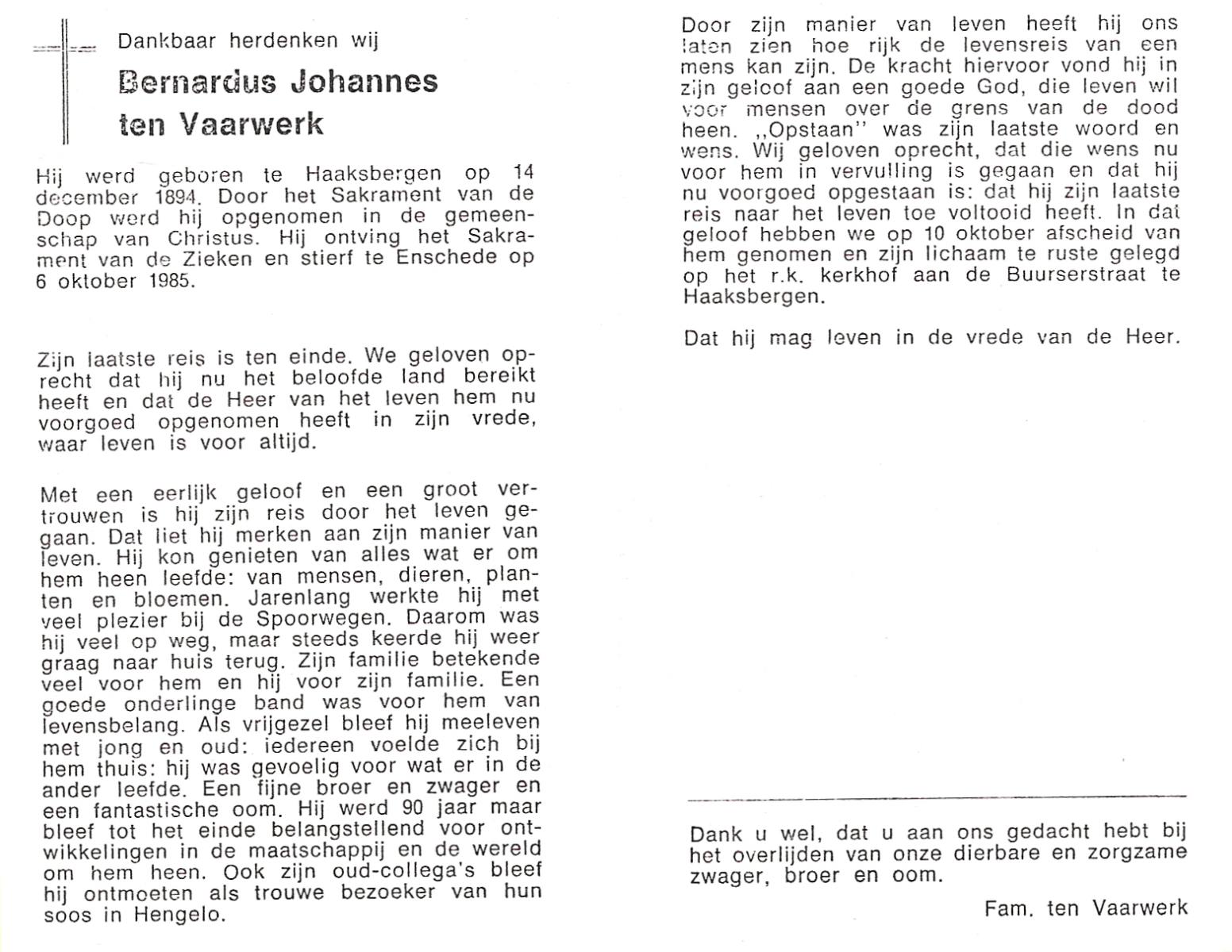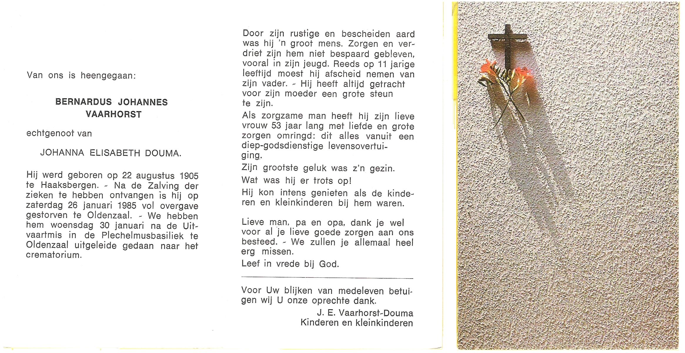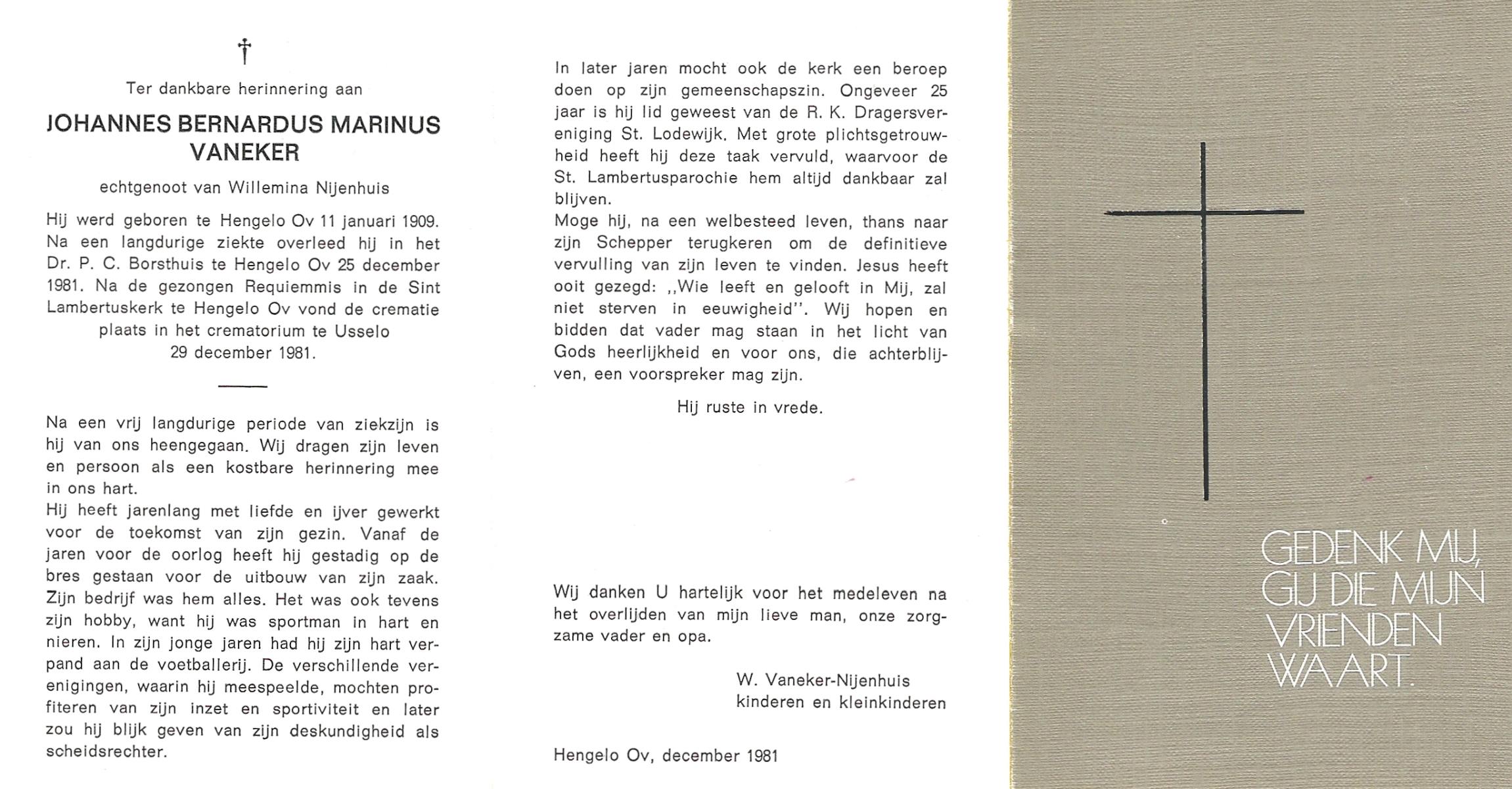 VEHOF, Bernardus Gerhardus, geboren op 04-01-1898 te Zeldam, overleden op 10-7-1987 te Hengelo (Ov.) op 89-jarige leeftijd.